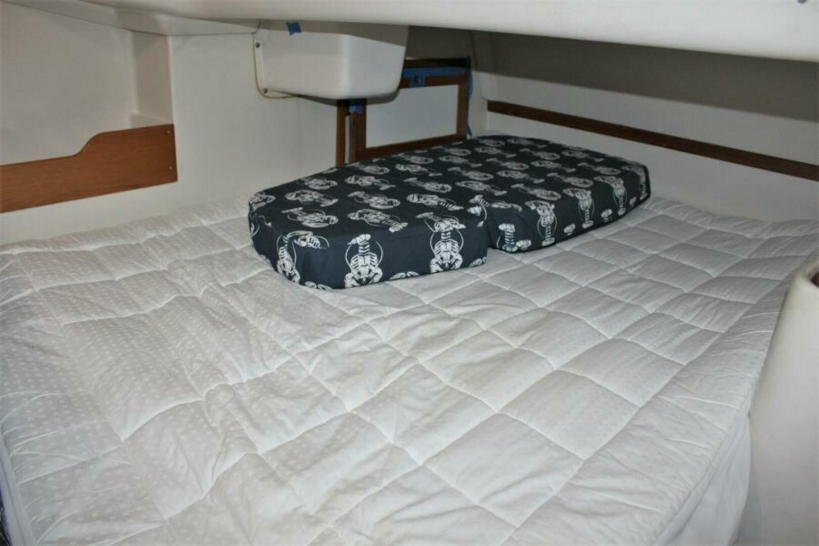 The forward cabin has a large V-berth with drawers and cabinets underneath and an overhead hatch.