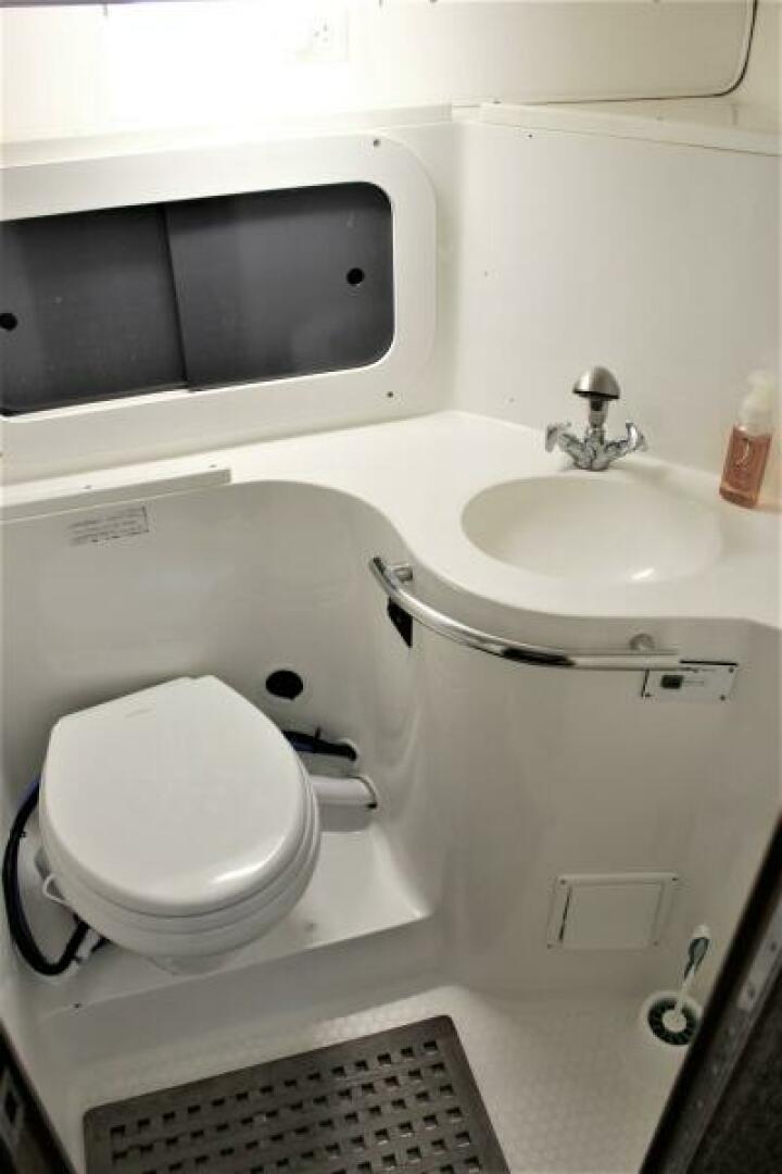 The head is to port and just aft of the forward cabin. It has a new electric commode, a full vanity, a wet shower, an overhead hatch, and an opening port.