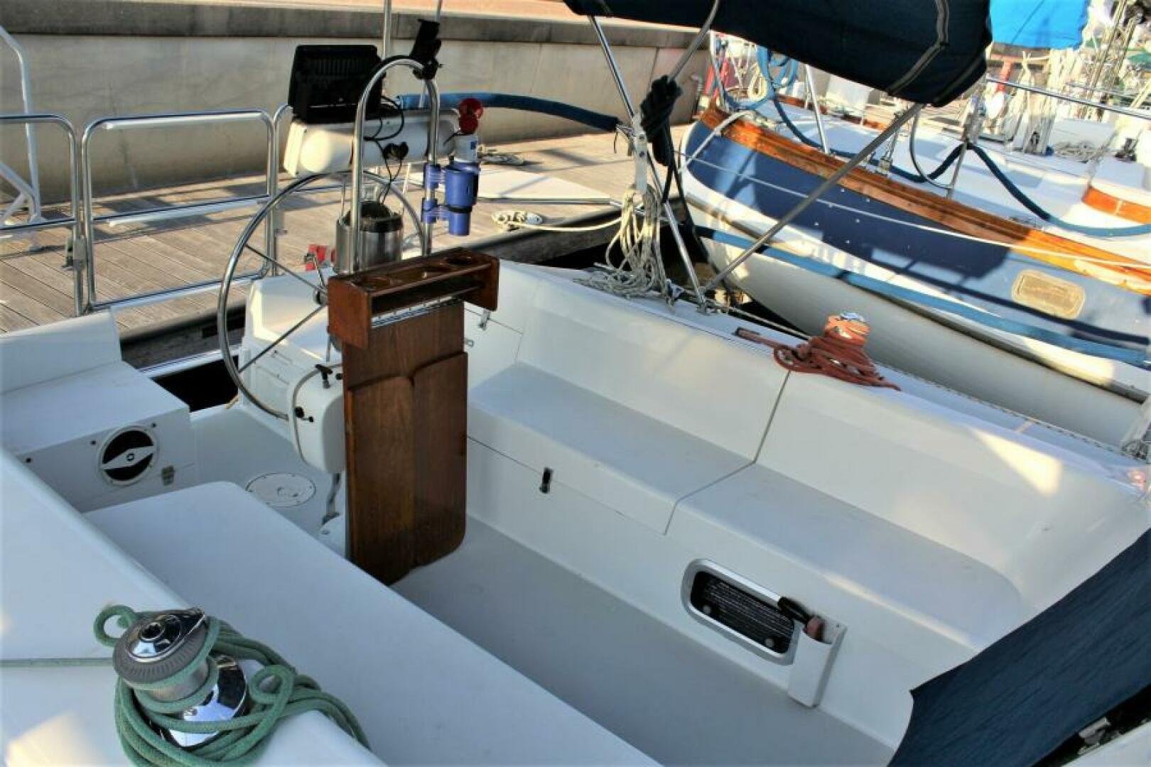 - Fold-down teak cockpit table with teak drink holder