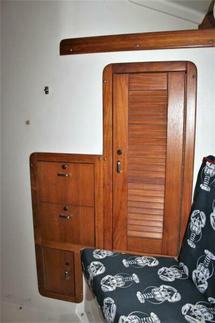 The aft cabin has a huge berth, lockers with louvered doors, a cushioned seat, and room for changing.