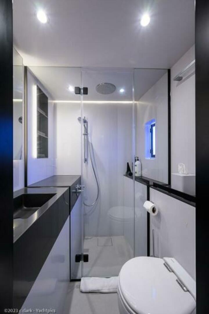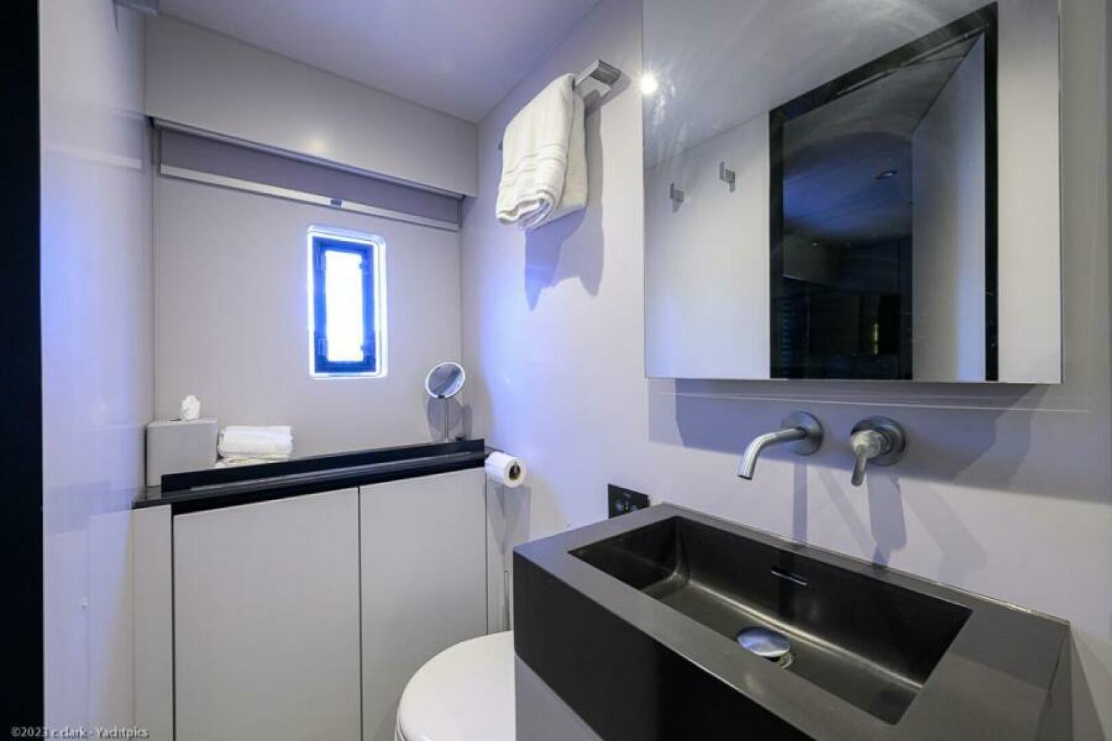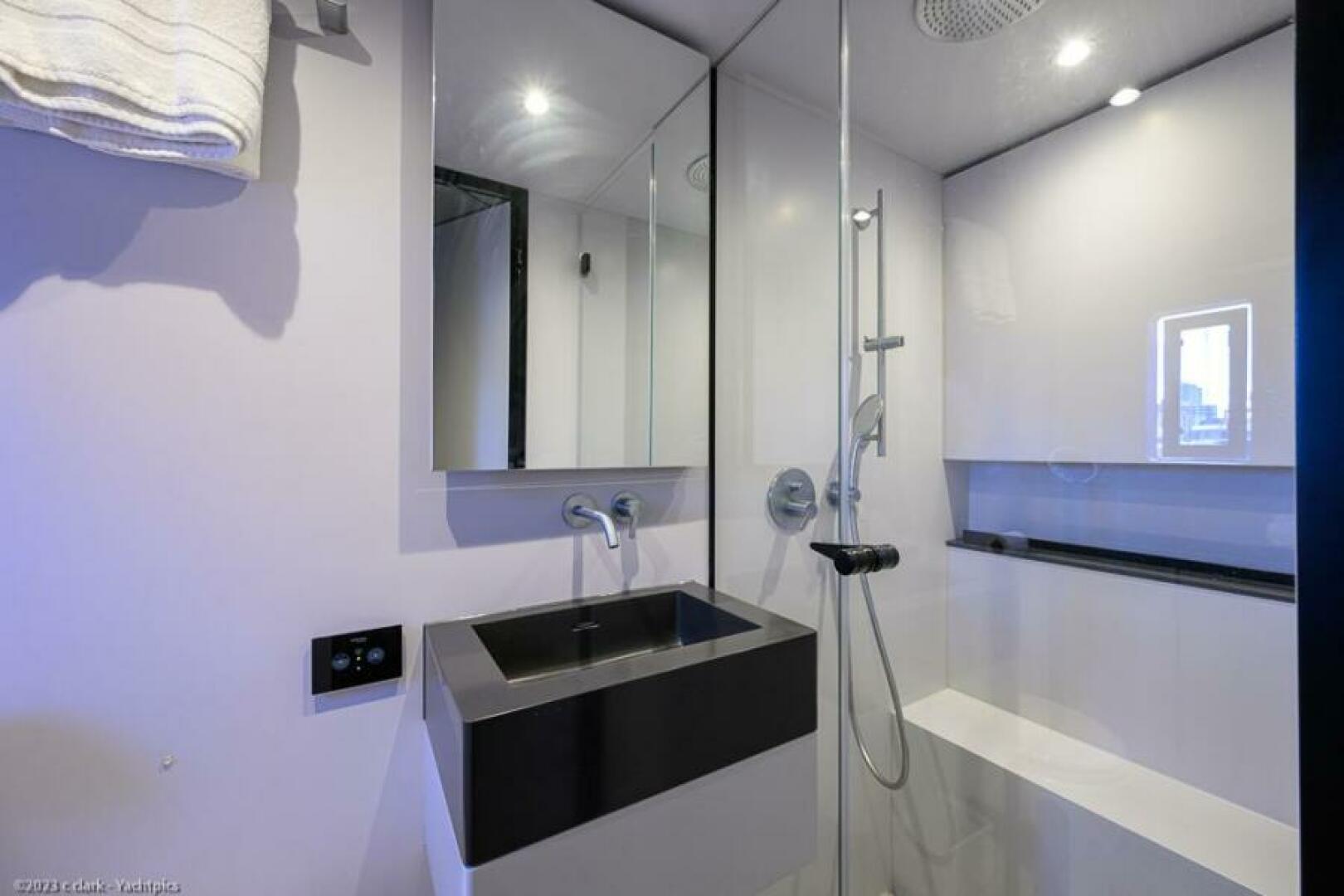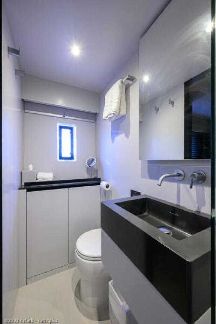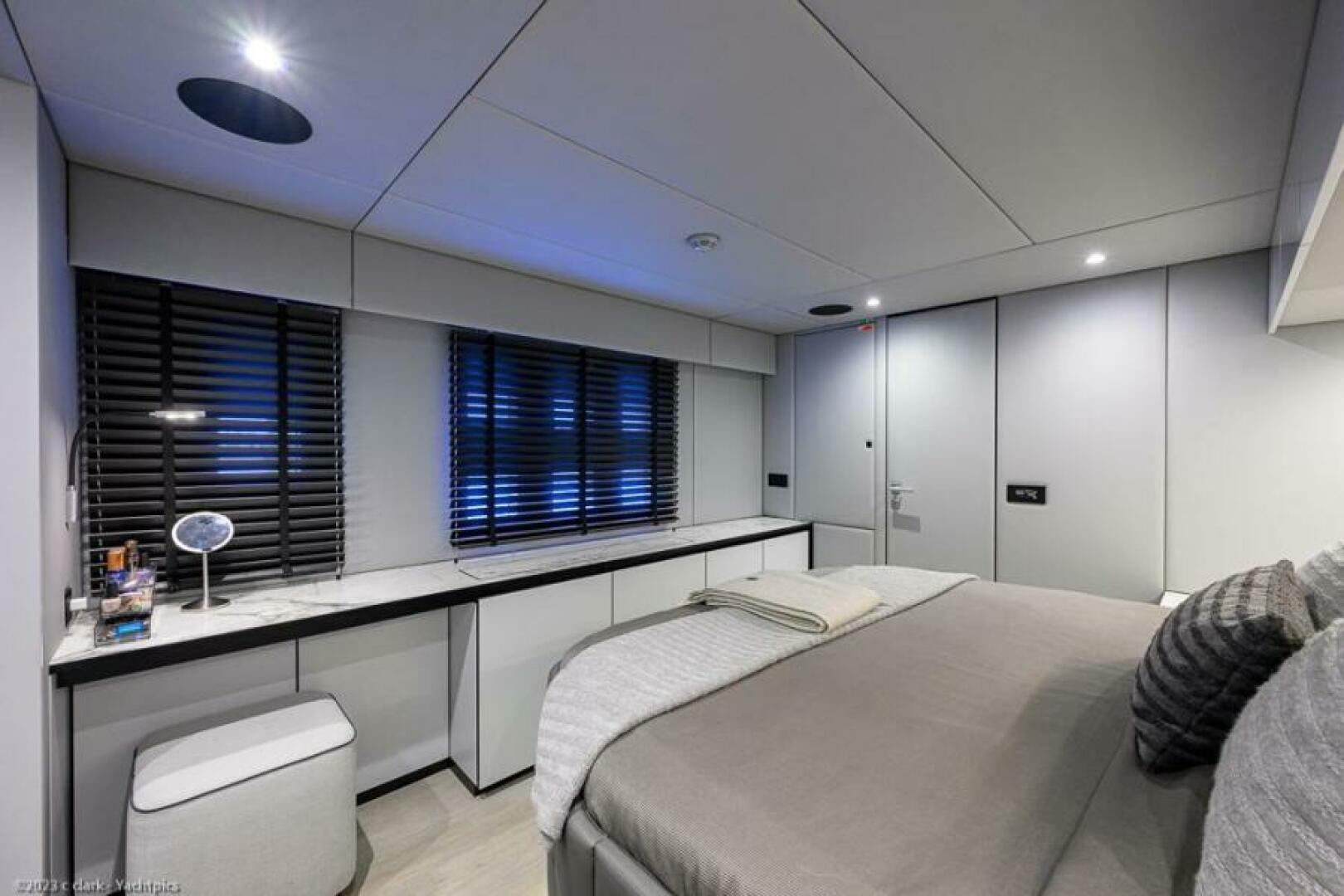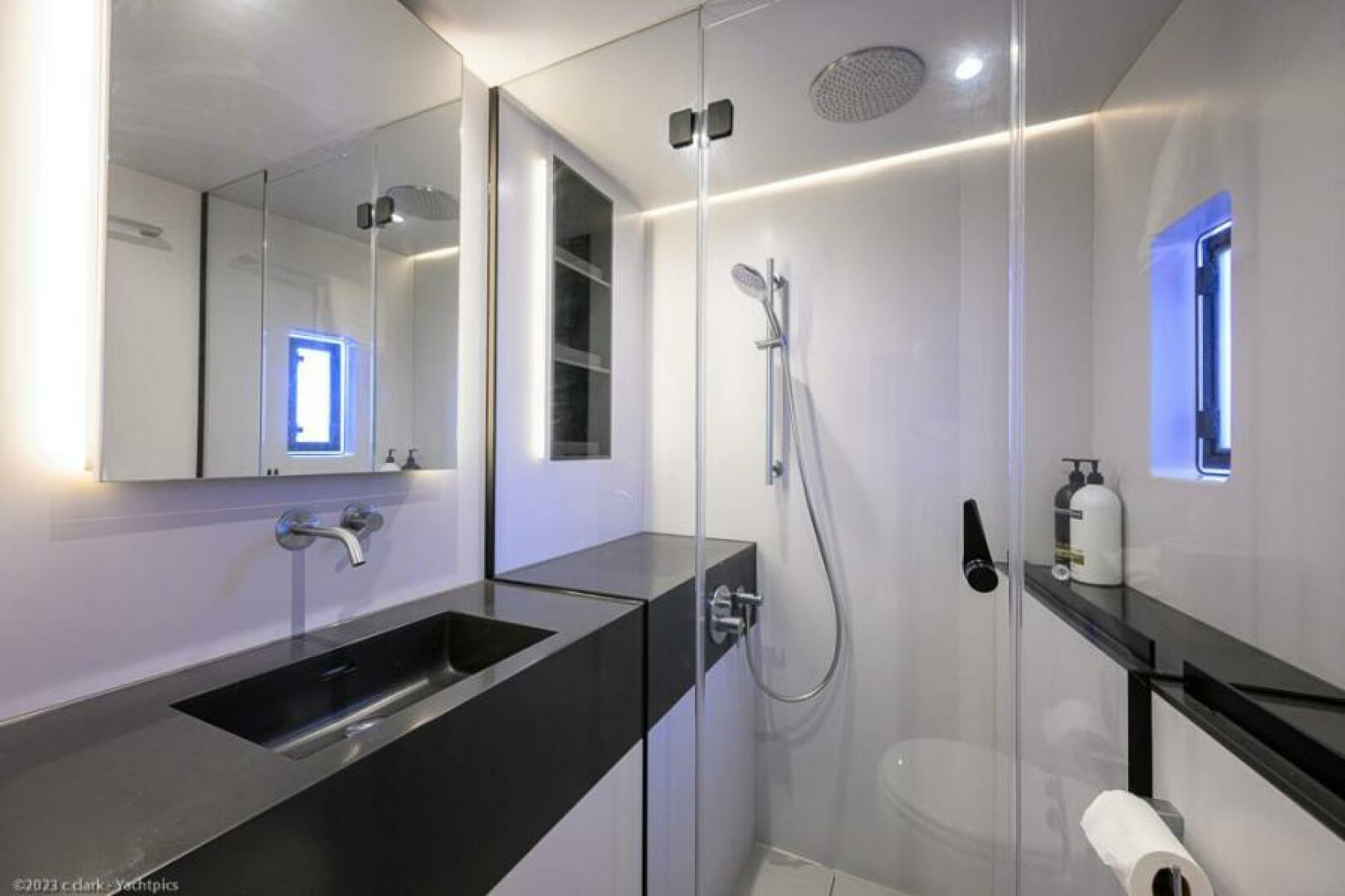 Access to the Saloon is gained through Oversized stainless steel and glass doors. Immediately to Starboard is a stairwell that leads to the double unsuited guest/Captains stateroom. The room has full Bath with Shower and a double berth. There is a 32’’Samsung TV with Sonos Audio capability and hanging and shelf storage. The room is decorated in shades of grey.