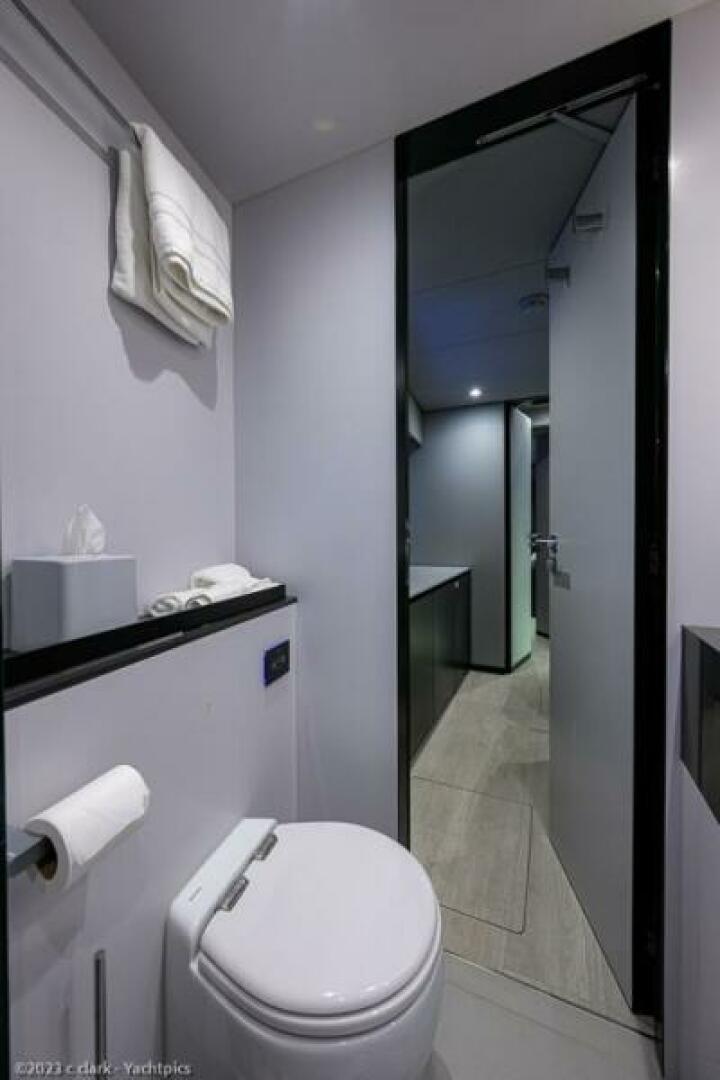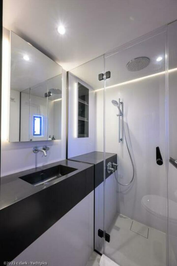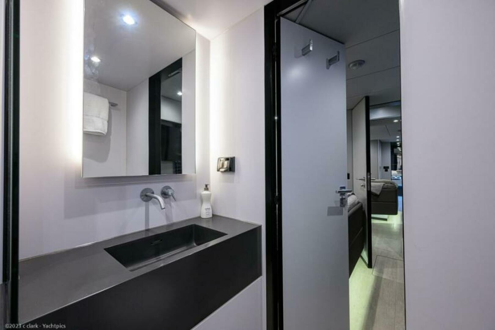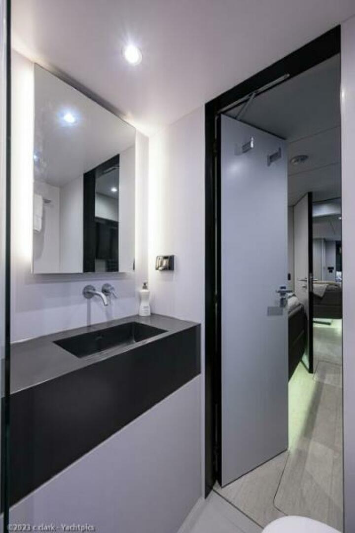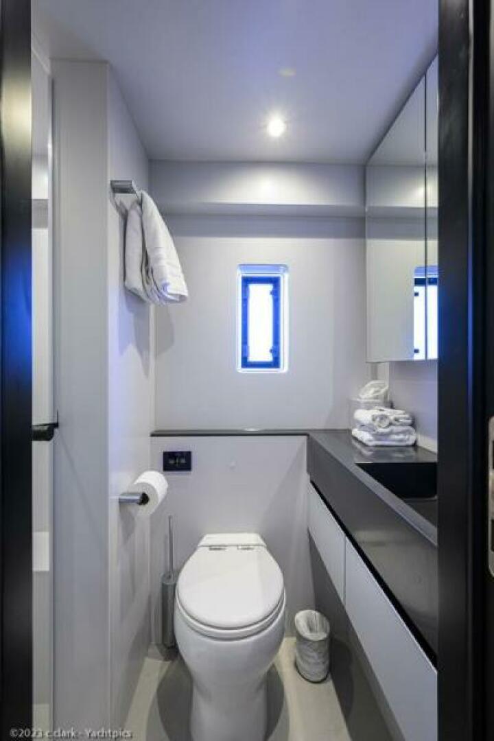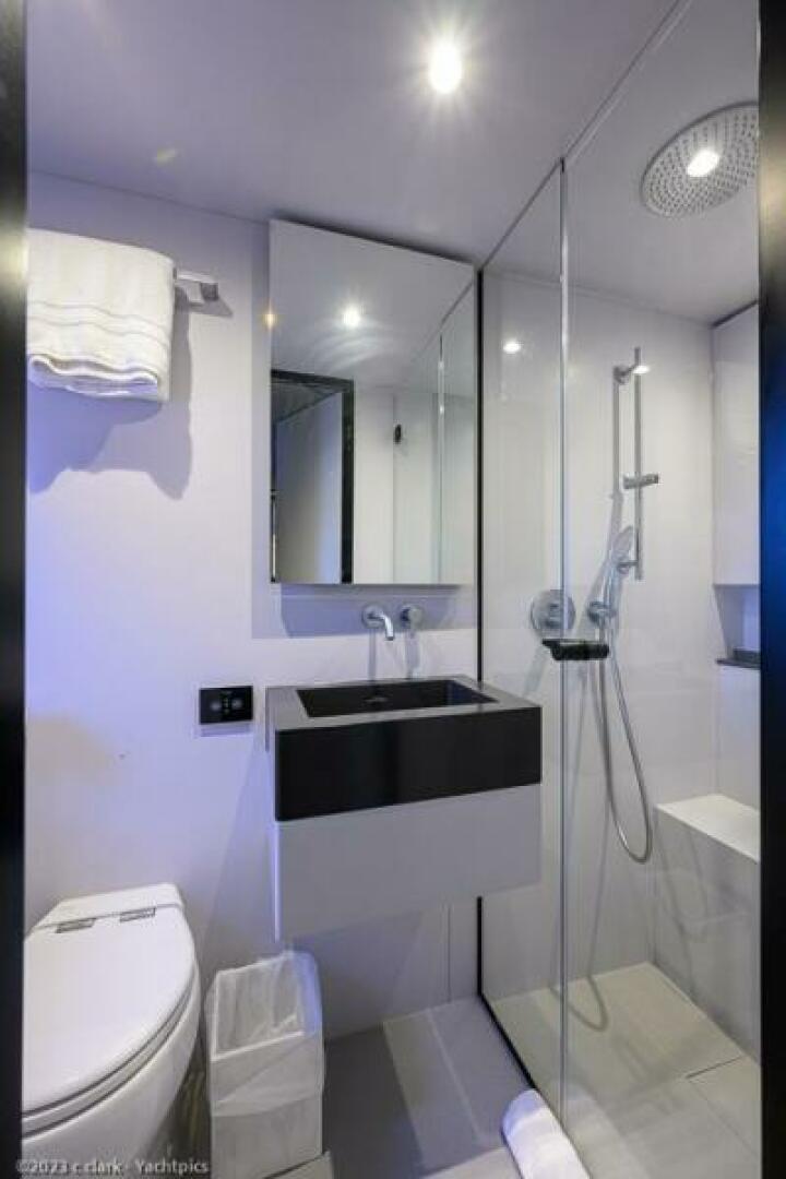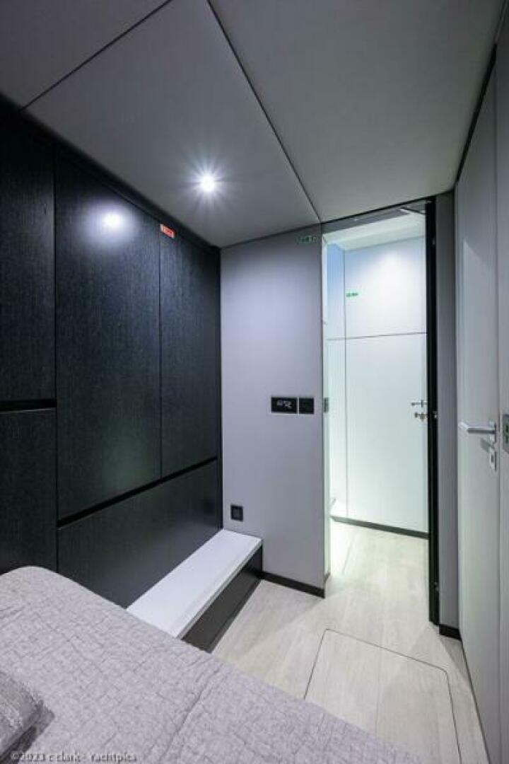 Access to the Saloon is gained through Oversized stainless steel and glass doors. Immediately to Starboard is a stairwell that leads to the double unsuited guest/Captains stateroom. The room has full Bath with Shower and a double berth. There is a 32’’Samsung TV with Sonos Audio capability and hanging and shelf storage. The room is decorated in shades of grey.