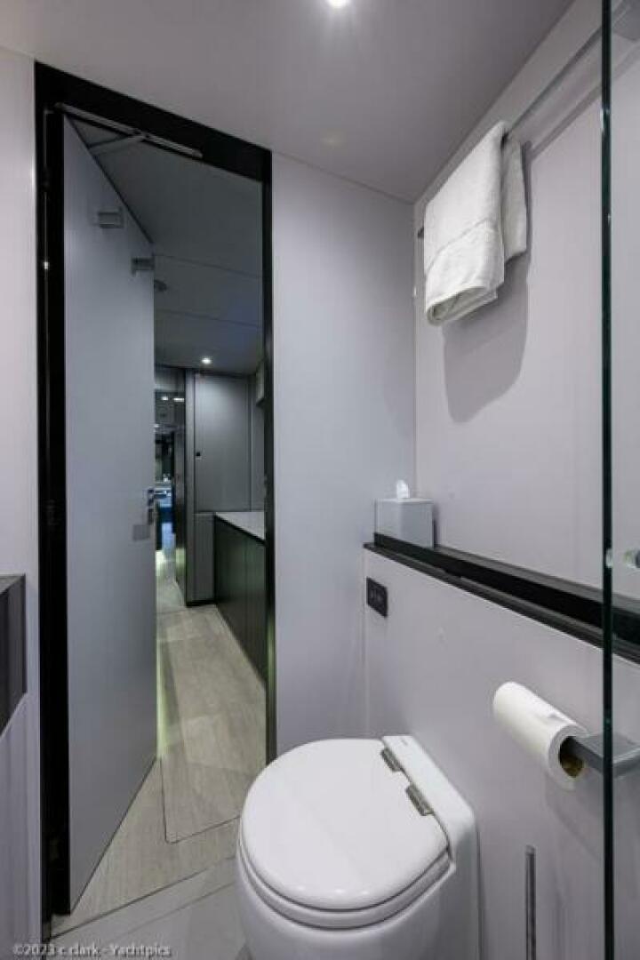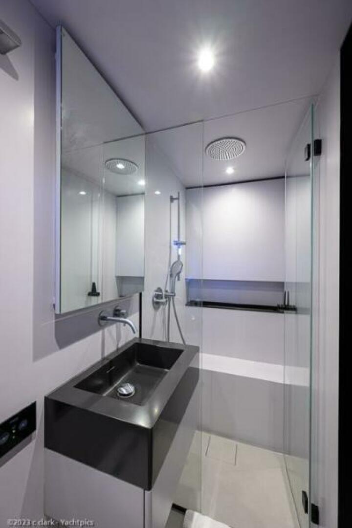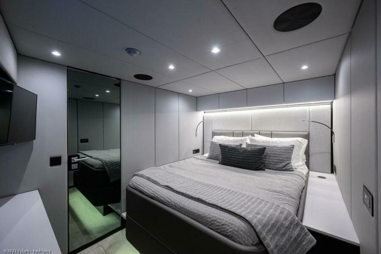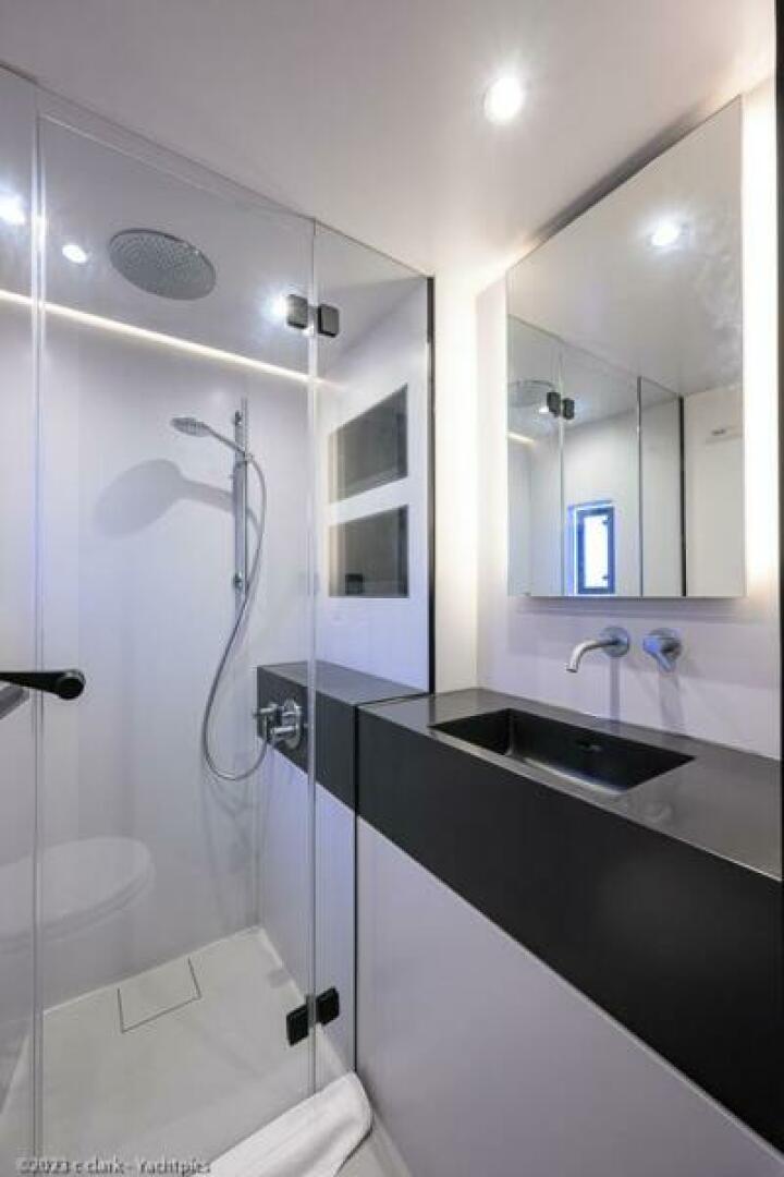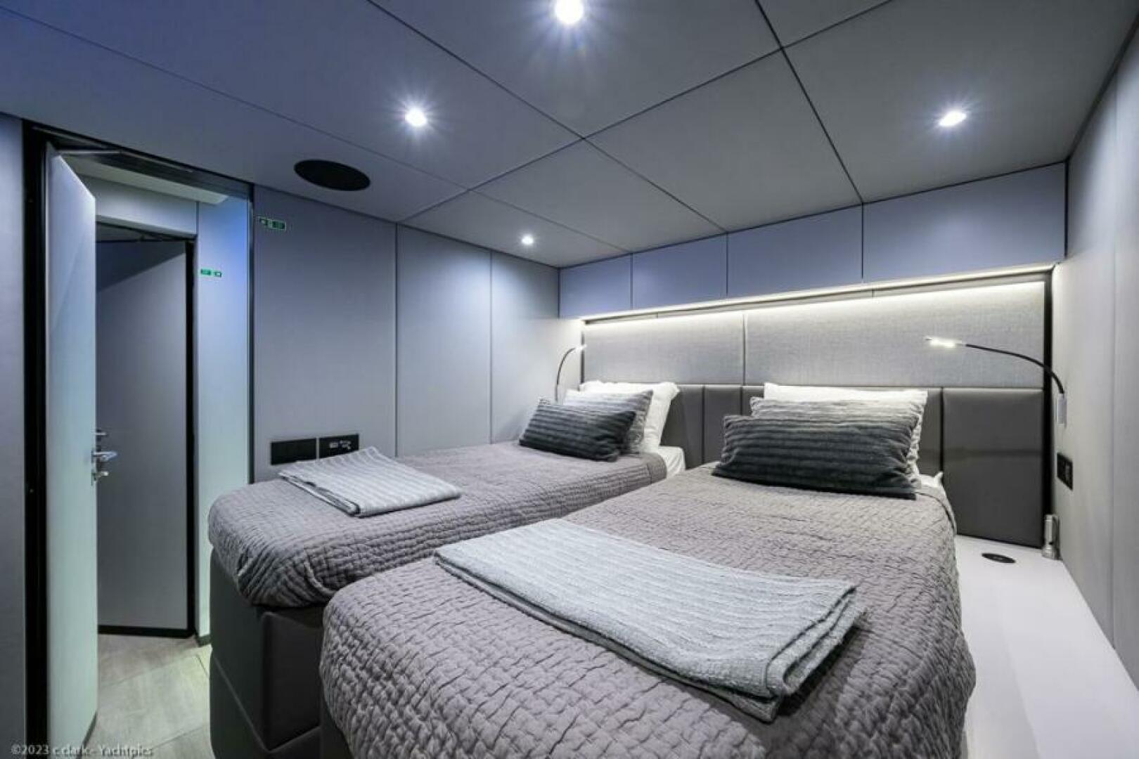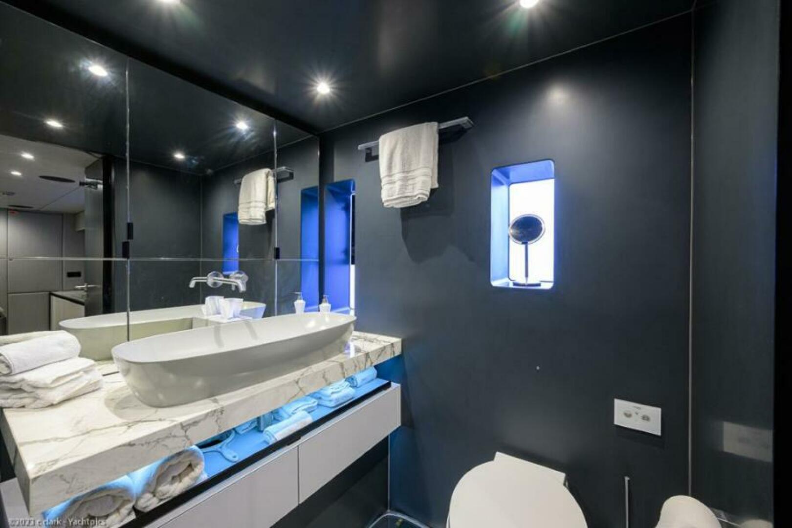 Access to the Saloon is gained through Oversized stainless steel and glass doors. Immediately to Starboard is a stairwell that leads to the double unsuited guest/Captains stateroom. The room has full Bath with Shower and a double berth. There is a 32’’Samsung TV with Sonos Audio capability and hanging and shelf storage. The room is decorated in shades of grey.