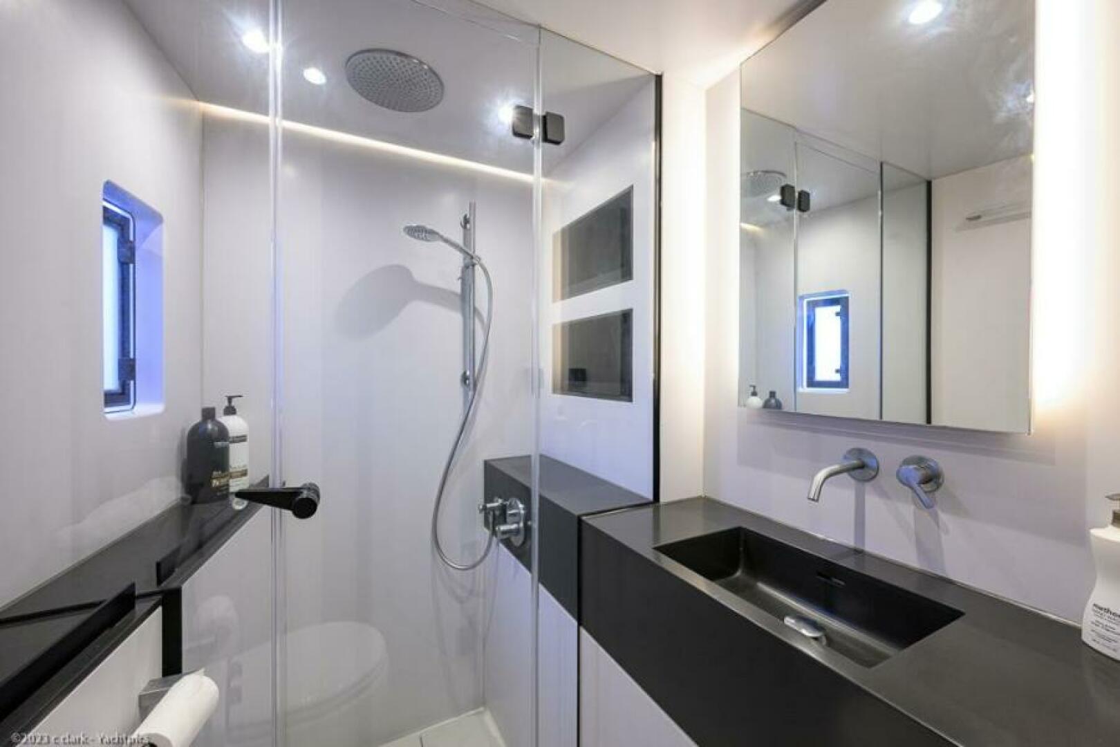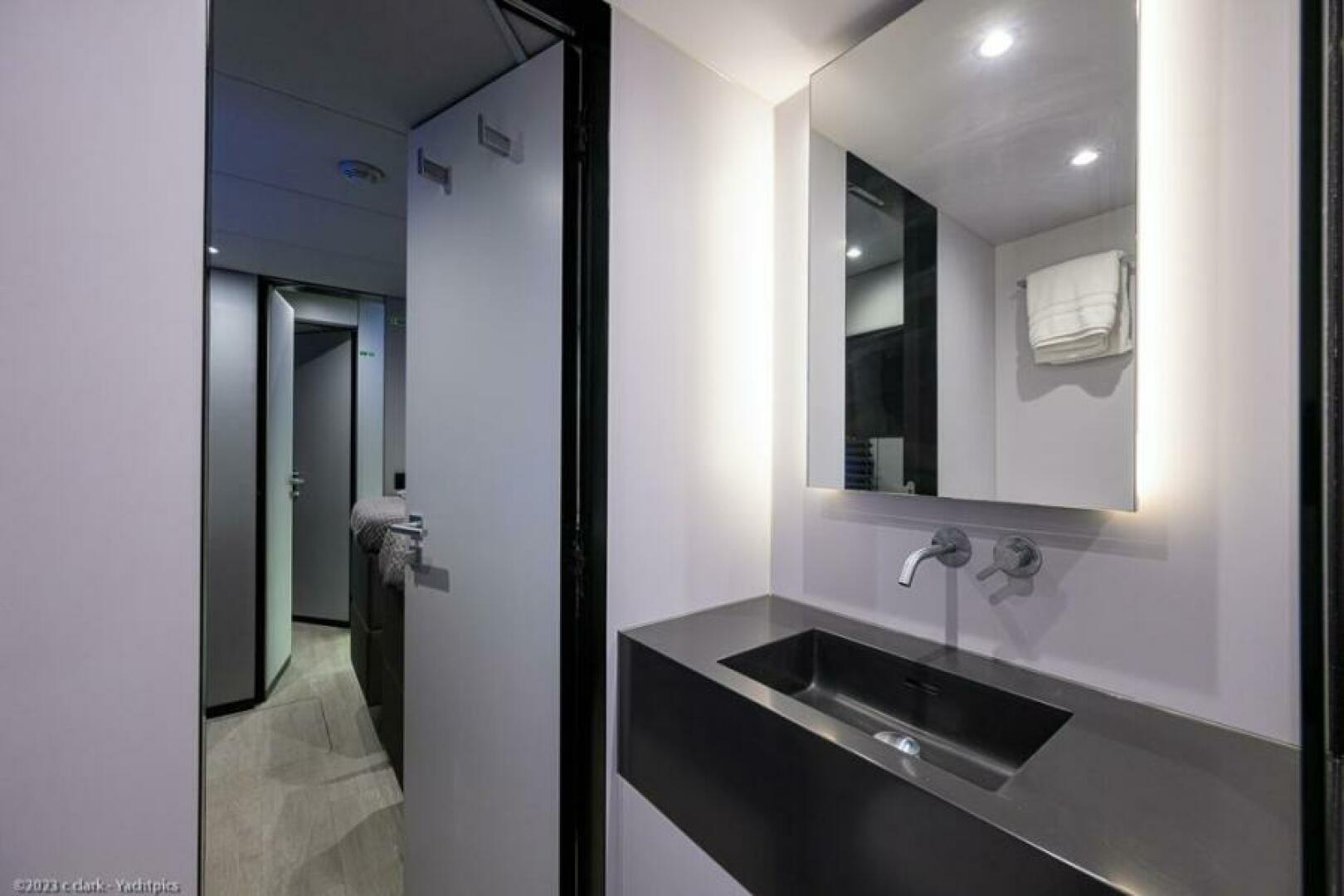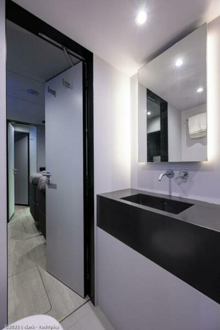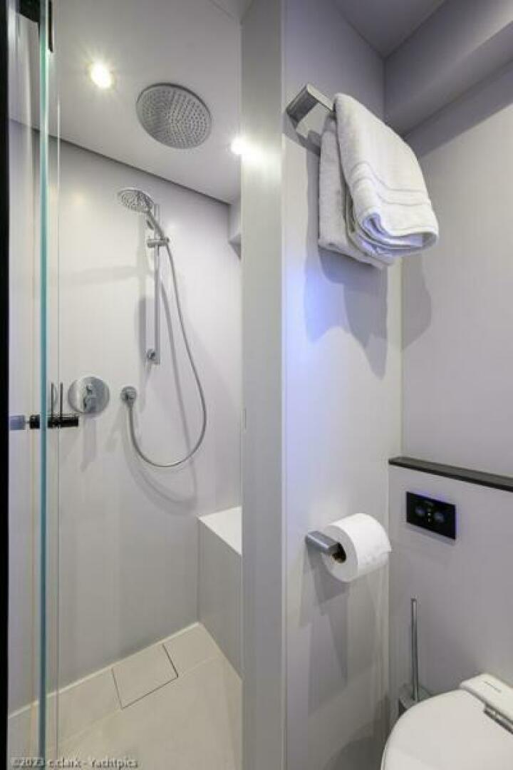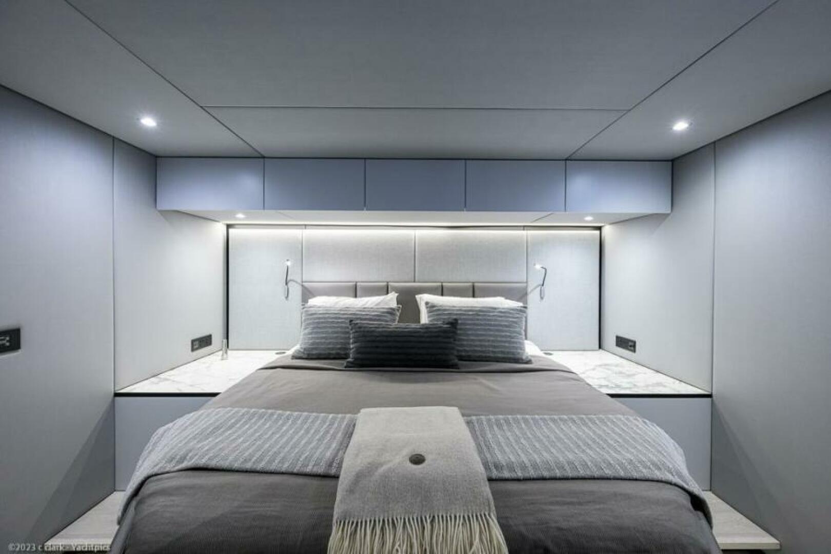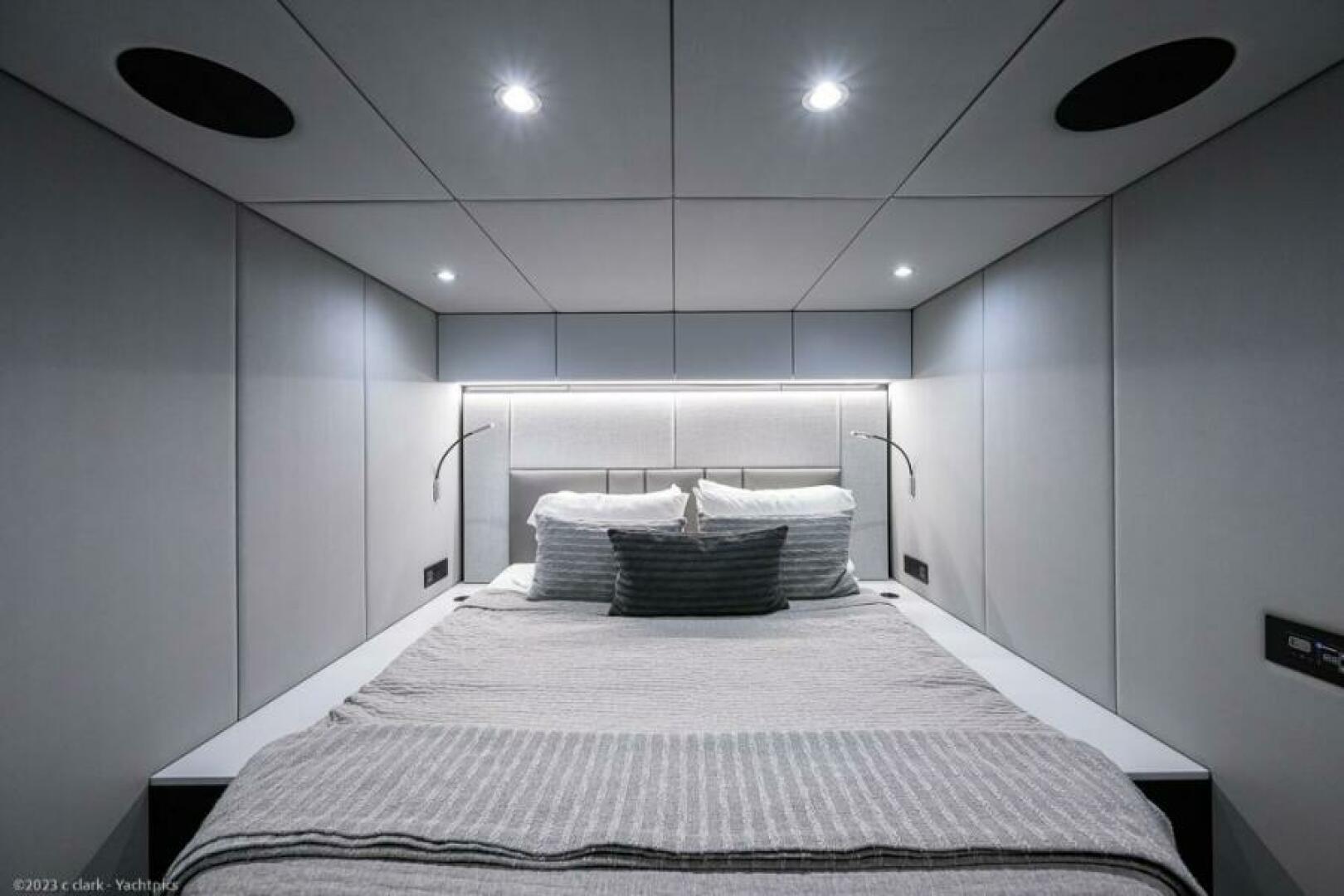Access to the Saloon is gained through Oversized stainless steel and glass doors. Immediately to Starboard is a stairwell that leads to the double unsuited guest/Captains stateroom. The room has full Bath with Shower and a double berth. There is a 32’’Samsung TV with Sonos Audio capability and hanging and shelf storage. The room is decorated in shades of grey.