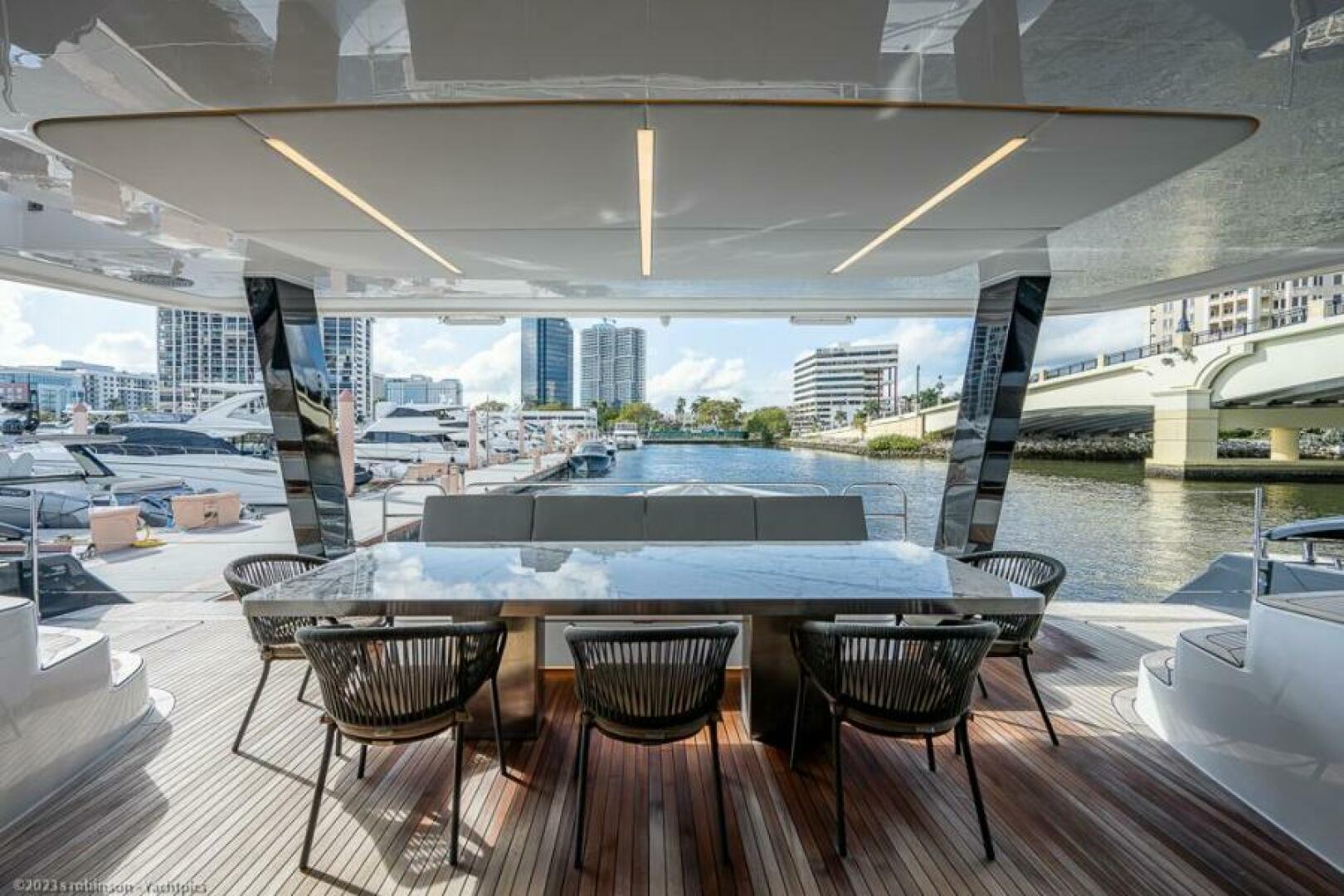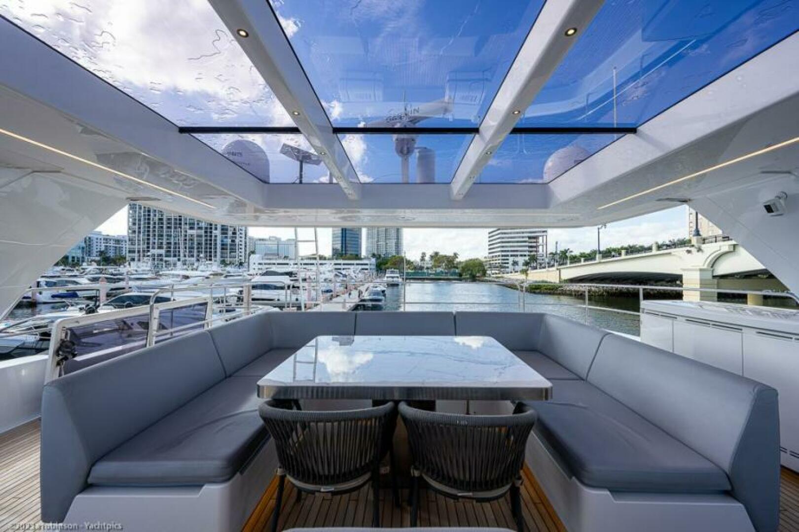 On centerline in the Saloon is an automatic stainless and glass door that is access for the forward al fresco dining area and a 24 bottle wine cooler.