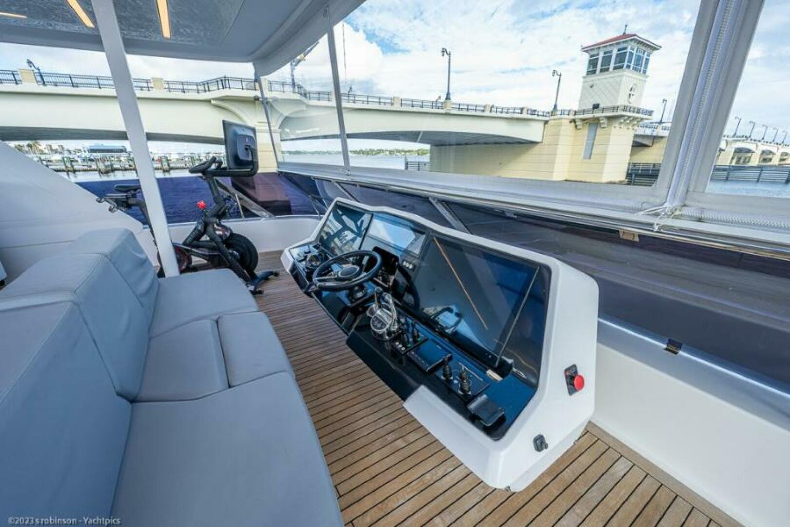 On the port side in the saloon after entrance is a built-in Miele automatic Espresso/Coffee machine and an additional 24 bottle Wine cooler. Forward there is a large banquette dining/ seating area, with low cushioned ottoman seating that will easily accommodate10. Again, there is additional lift-up and pull-out storage. Ahead on the forward window bulkhead is the technical access and the control systems for the yacht with a lift-up top.