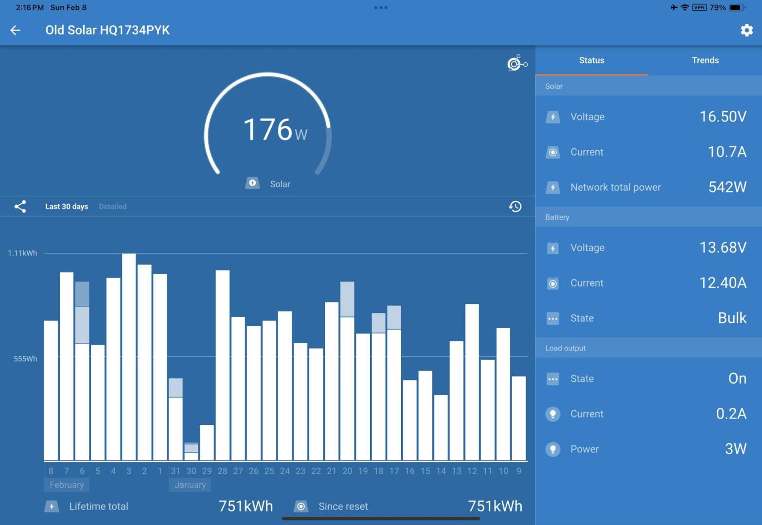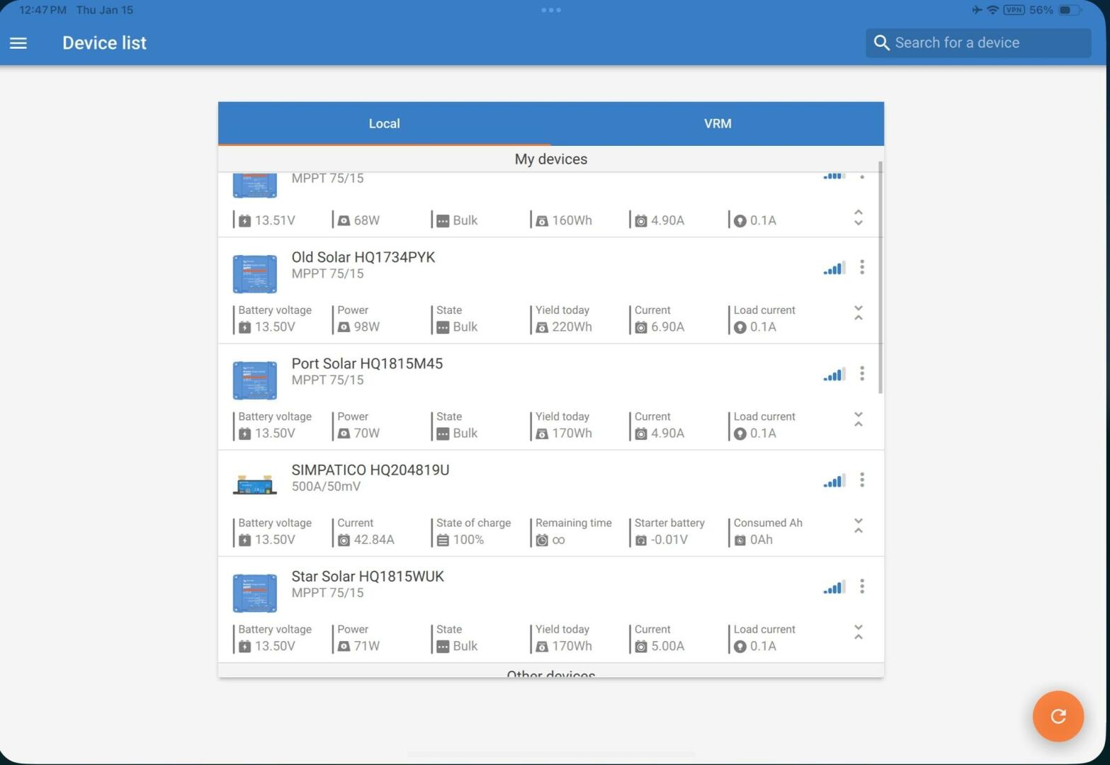 - (3) 180 watt solar panels mounted on dinghy davits each with a dedicated Victron MPPT Bluetooth enabled controller (2019)