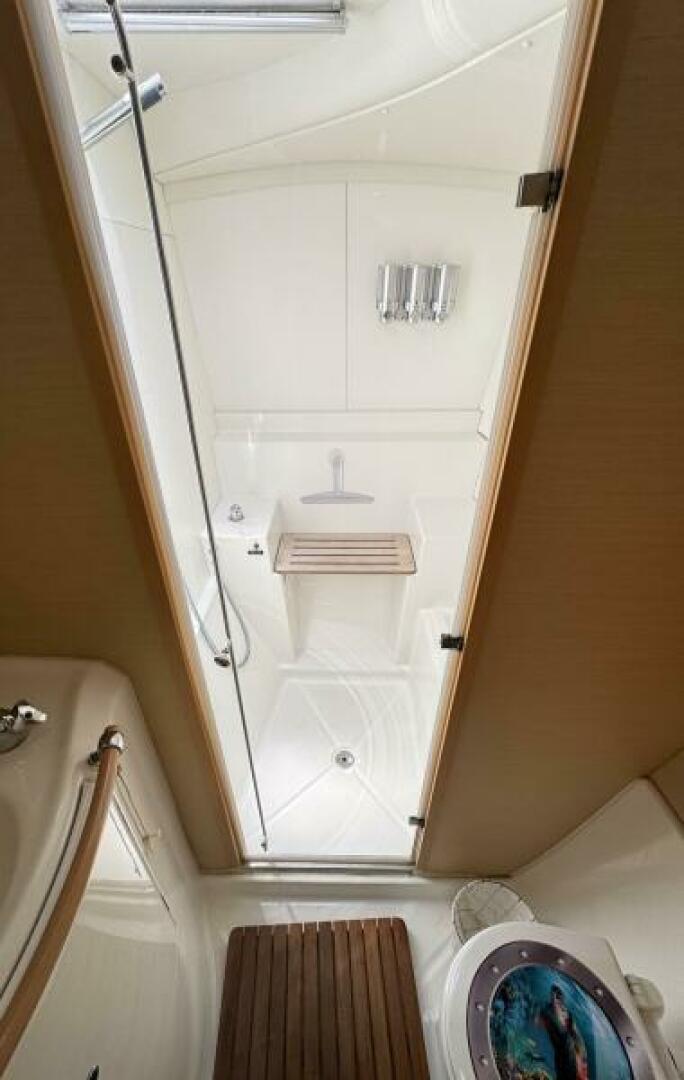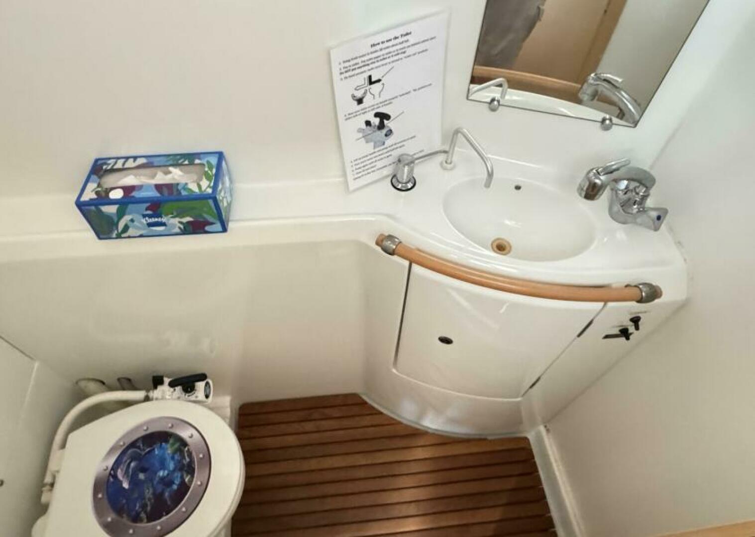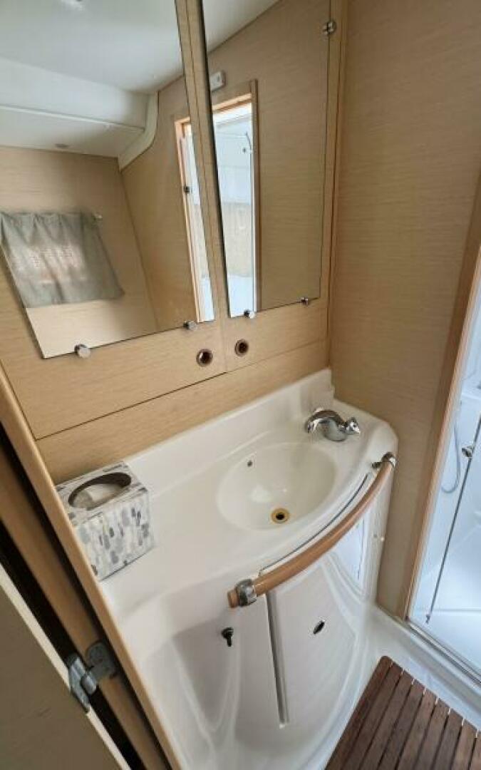 Owner’s version 3 Cabins, 2 heads with separate showers. The starboard hull is dedicated for the owner’s cabin and head with a huge shower. The port hull has a cabin aft and a cabin forward. Both cabins share a midship head with separate shower.