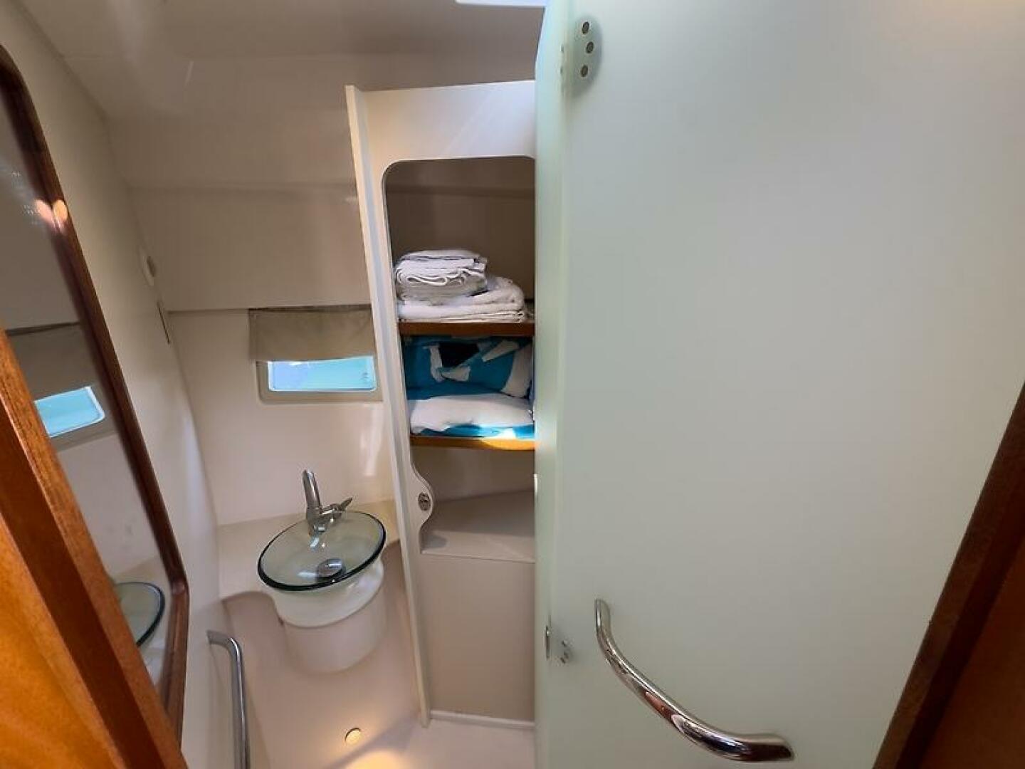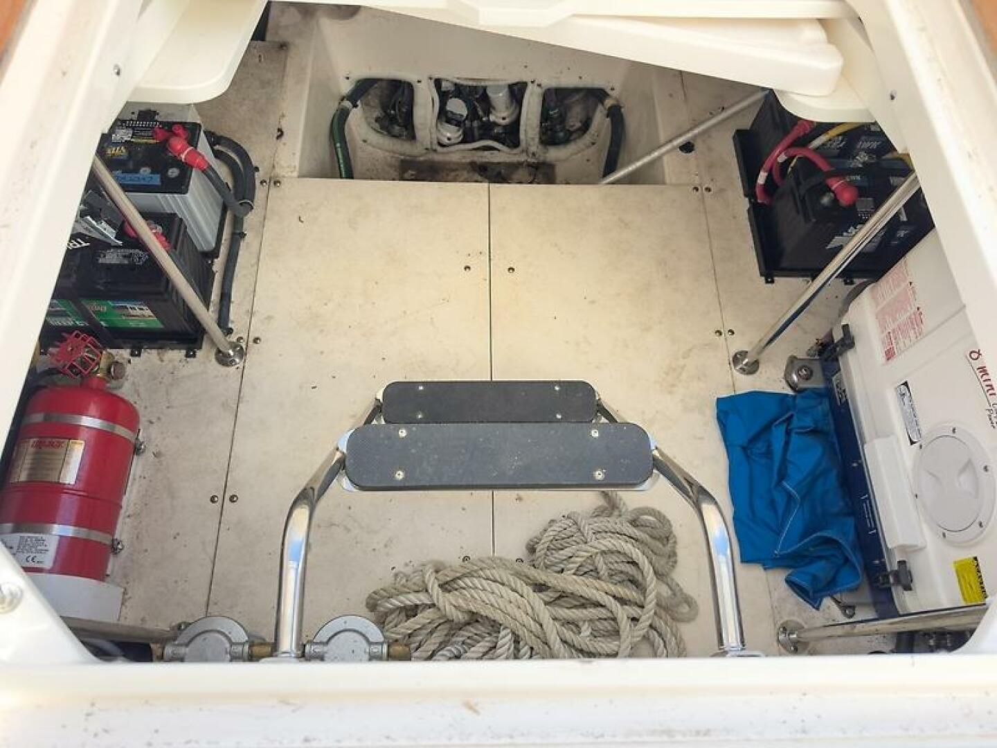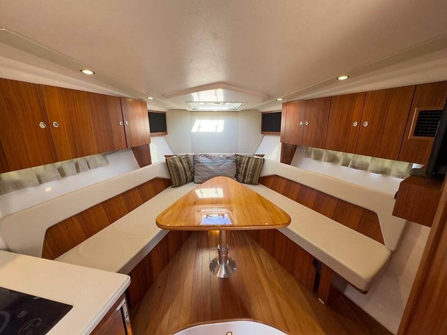 Natural light filtering through six hull side windows port and starboard and three deck windows overhead, adds to the openness of the cabin layout. A galley, head, convertible dinette and full beam midcabin are expertly engineered and appointed. The forward convertible dinette becomes an island berth when you pull each seat inboard. Add the single or twin bed arrangement in the midcabin and 4 adults can overnight in complete comfort.