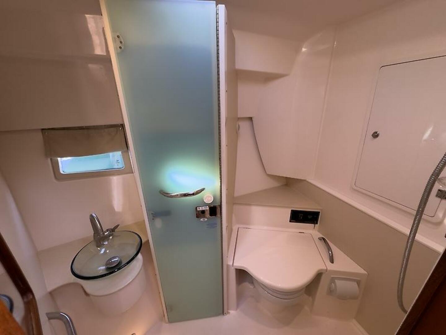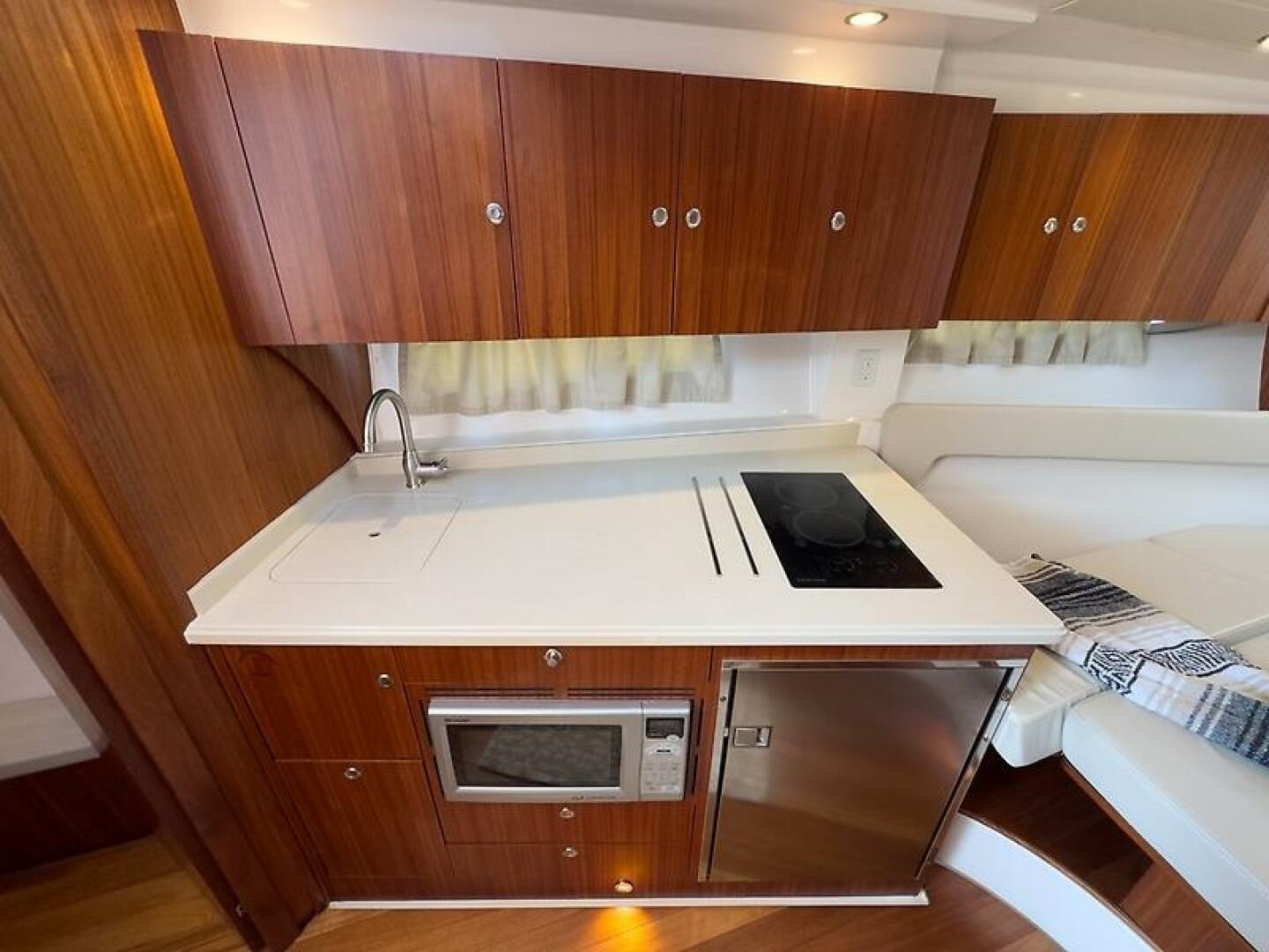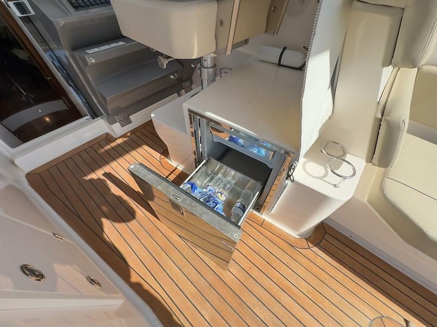 The oversized helm chair is complimented to the port side by a comfortable seating arrangement for passengers to share in the overall feel of the boat from the helm. The aft cockpit is highlighted by an extra large lounge, cushioned throughout for additional fun and entertaining. A fiberglass entertainment center conceals a sink with freshwater, electric grill and storage below. Within reach the stainless steel refrigerator keeps your refreshments cold and ready to serve.