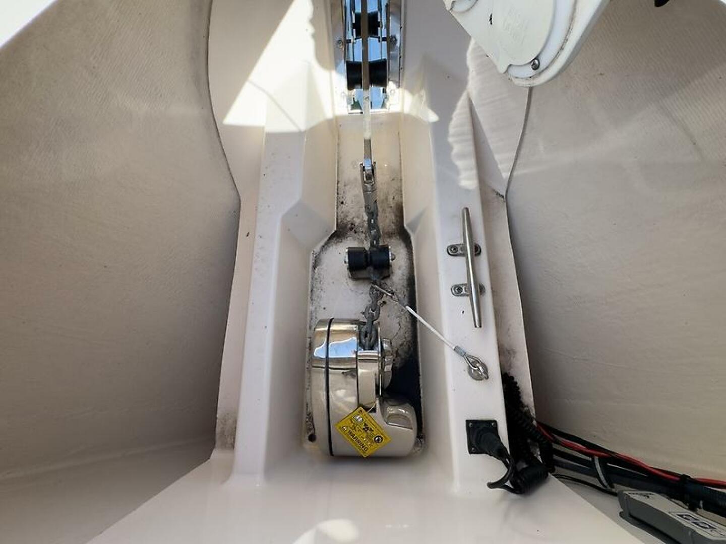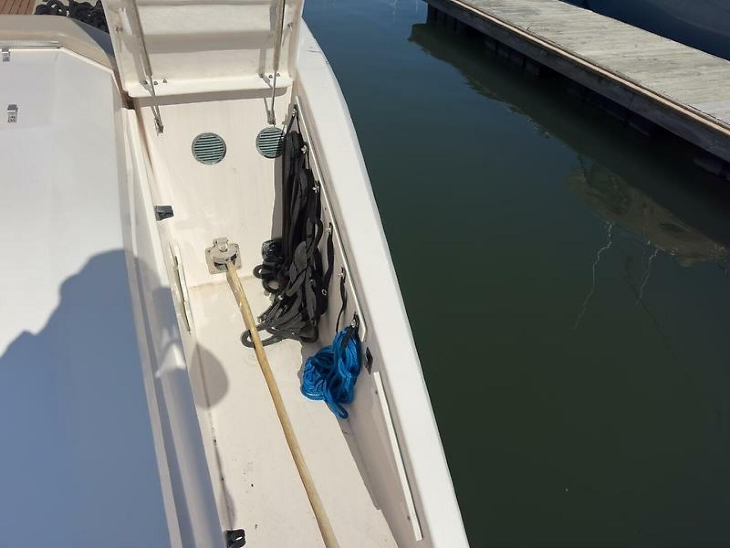 At the bow, the standard horizontal windlass system finishes at the stem with a neat anchor recess notch for the stainless steel plow style anchor. Optional bow sun lounges feature an adjustable backrest, handrails and drink holders. When the cushions are not installed the bow deck recess becomes a styling feature. A heavy duty bow rail and stanchions accentuate the sheerline and installation at just the right height gives added security while walking forward.