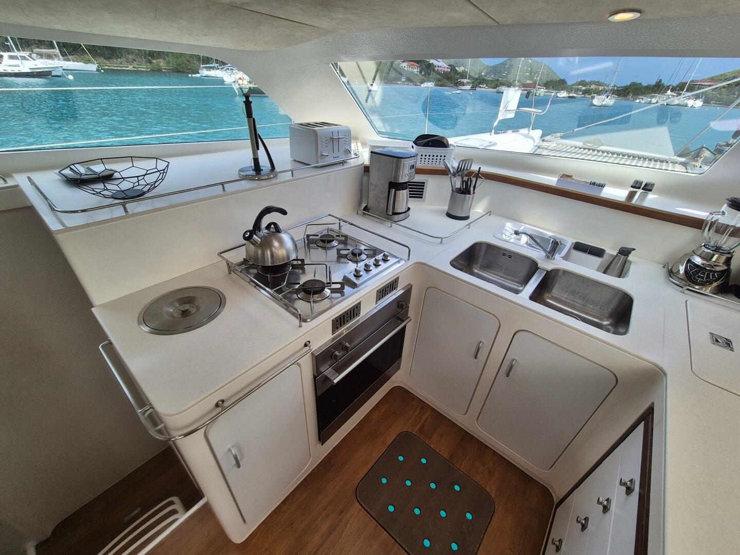 The boat layout is great for family and friends to sail with us. We especially like the aft area. The Dinghy rests on a wood deck at the back of the boat. When the Dinghy is launched which is simple to do, the back deck becomes a great swim platform and activity location for exercise and Yoga. The layout of the galley is perfect for two people to be able to prepare meals. The freezer is able to hold a lot. We do not use the Ice Maker too much due to power needs, but it is really nice for those occasions where ice is super nice to have. The boat is very easy to sail with 2 persons. We have created some great memories on AfterGlow and know she will be a great cruising boat for the next owners.