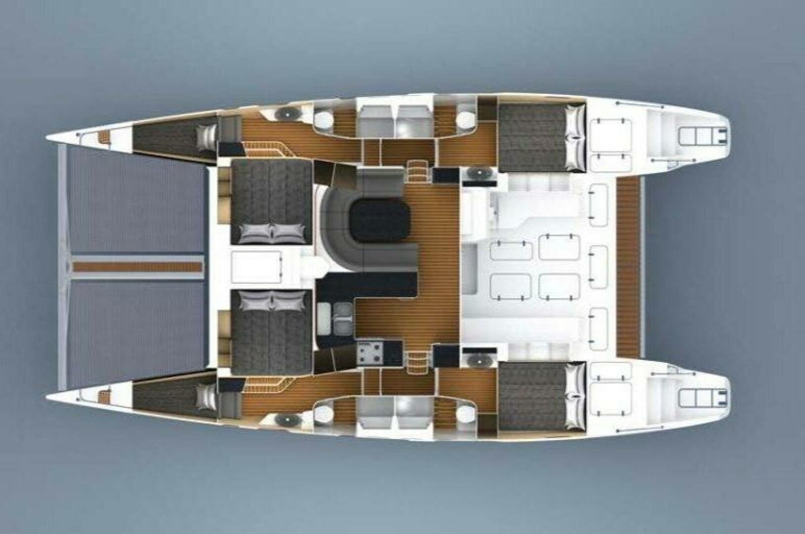 The Voyage 480 offers an impressive sense of volume and comfort within her 49.5-foot overall length and expansive 25.1-foot beam, providing seating for up to 12 guests and comfortable sleeping accommodations for 10 with four private en-suite guest cabins. Each that feature generously sized double berths—two forward king berths and two aft queen berths—ensuring exceptional comfort for extended cruising. Additional single V-berths in the forward bows are ideal for crew or children. Every cabin is fully air-conditioned and thoughtfully equipped with ample storage, reading lights, ventilation through opening hatches and portlights, and upgraded electric silent-flush heads with separate hot-and-cold showers, delivering true residential-style privacy and convenience onboard. At the heart of the yacht, the bright and spacious salon creates an inviting central living area with leather seating, excellent 6’4” headroom, and integrated entertainment, all enhanced by refined finishes and durable flooring. This comfortable interior living space flows seamlessly aft into the open cockpit, where a large dining table and social seating sit just steps from the skipper’s helm, allowing easy interaction between guests and skipper while underway or at anchor. A fully equipped galley—complete with plenty refrigeration and freezer capacity, ample storage. propane cooking appliances, microwave, ice maker, and full complement of galley essentials all going with the sale of the vessel for a truly turn-key experience. Provision and go sailing!