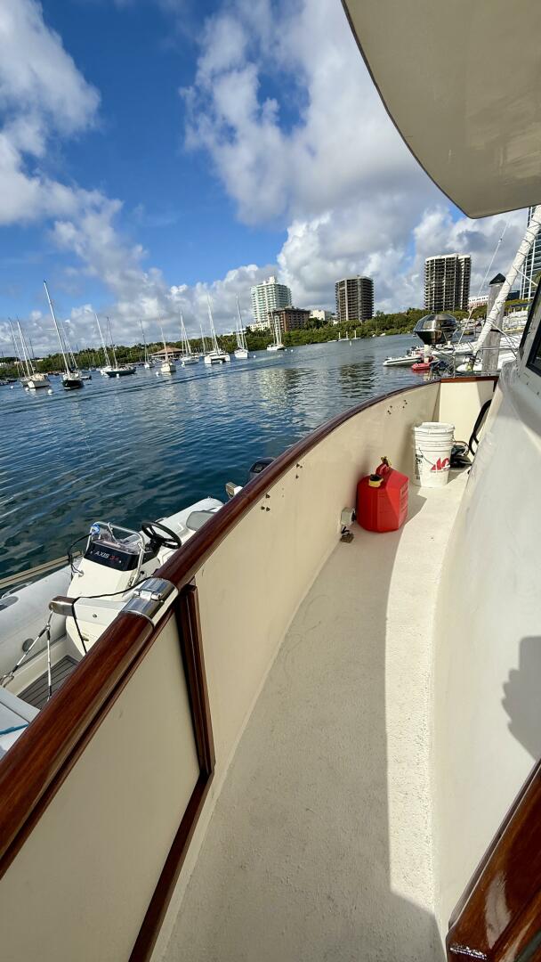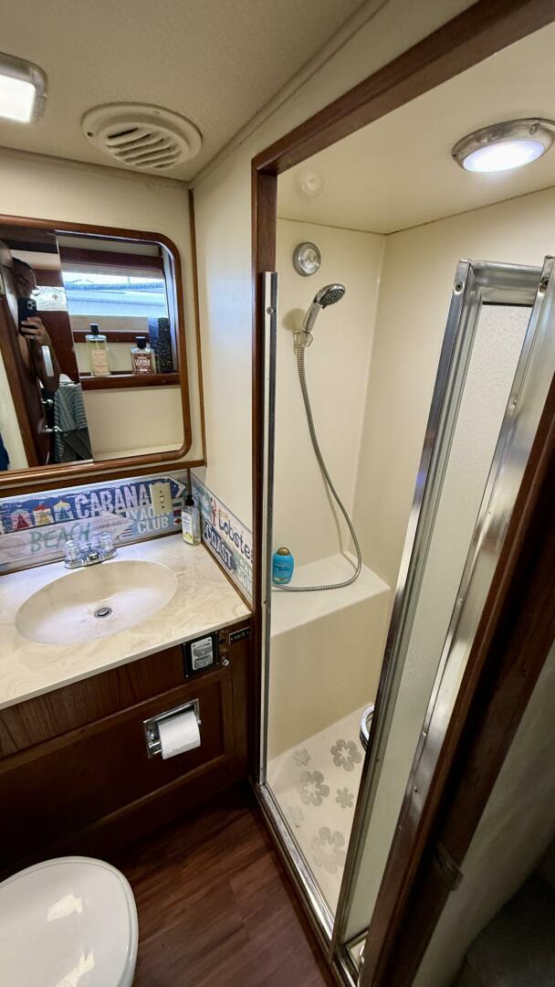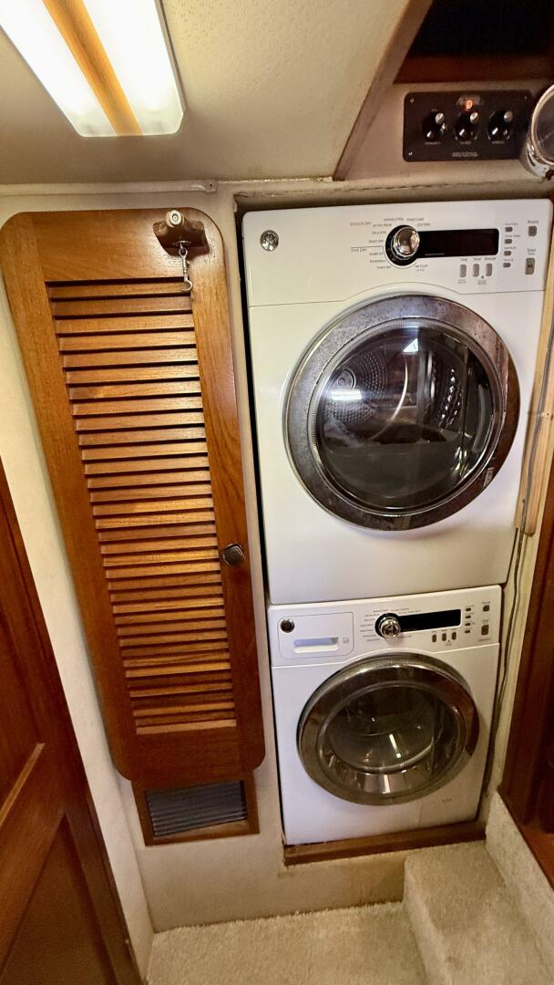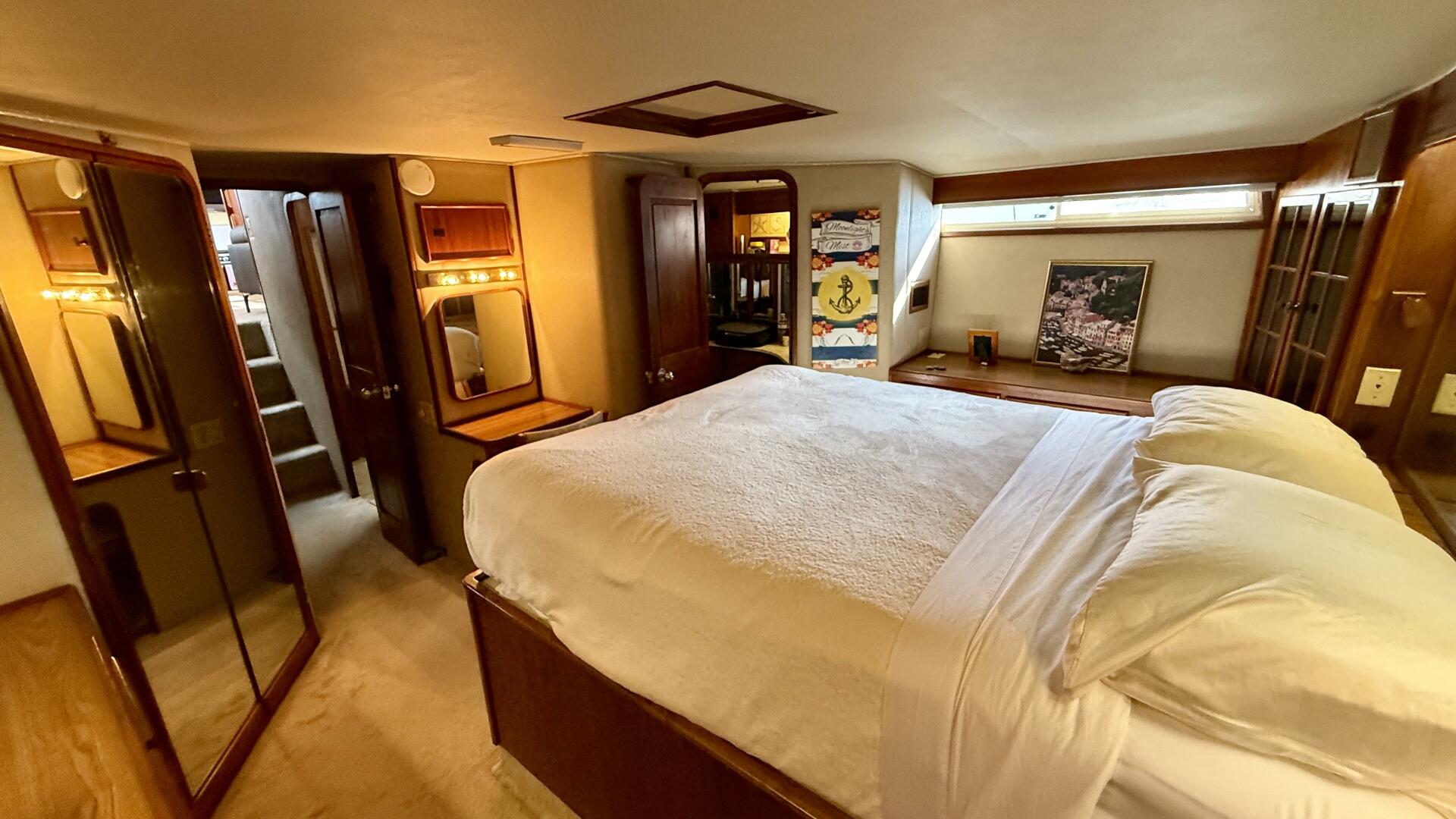 An ideal Liveaboard vessel. “Moonlight Mist” has comfortable walk around decks, a roomy “On Deck” salon (enclosed)with wing doors and easy access to the aft deck and swim platform. The short port side stairway leads to the Lower salon with a built-in triangular dining table in the forward corner. The fully equipped (and upgraded) Galley is to starboard. Forward is the stacked washer dryer, a guest stateroom with over under berths and a full head. Aft of the salon is the Office/Stateroom with its own head. Further aft is the owners stateroom with and centerline queen bed and an ensuite head. The flybridge is protected all around with dodger board and comfortably seats 9 people.
