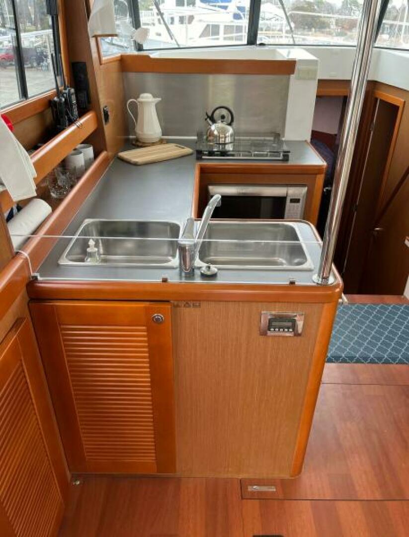 The interior is light, with fantastic visibility and ventilation thanks to the large windows forward, sliding windows down the sides and glass sliding doors at the rear. Entry can be made through the sliding door, from the cockpit, or on the starboard side, next to the lower helm. The salon has a settee to starboard, with storage down the port side with a heavy-based table that can be situated wherever needed. The settee folds out to form a double berth. Below the floor of the salon is a hatch which provides access to the spacious engine compartment.