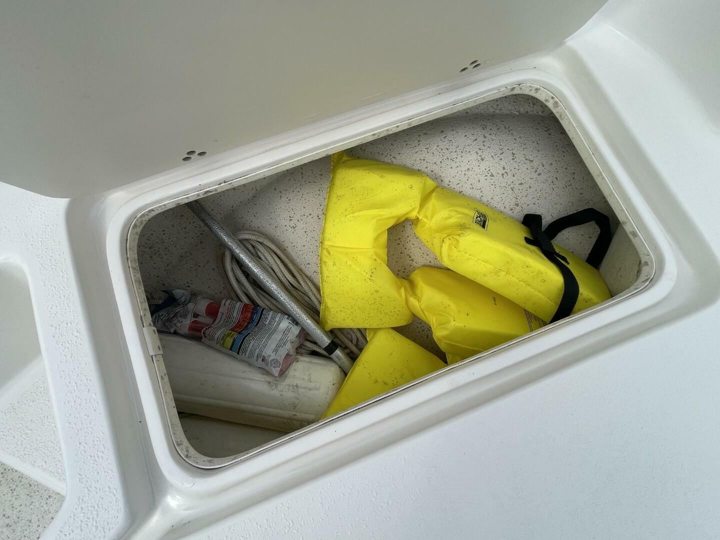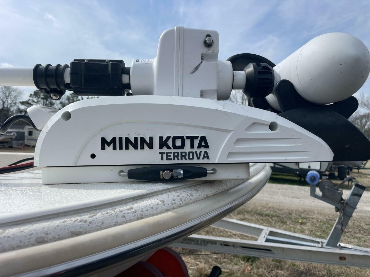 Key features include a Lowrance Hook GPS, a Minn Kota trolling motor, and two livewells for fishing enthusiasts. The boat's design incorporates large front and rear fishing decks, along with stainless steel components for durability. Ample storage and spacious deck areas allow for a variety of activities, whether family outings or dedicated fishing trips.