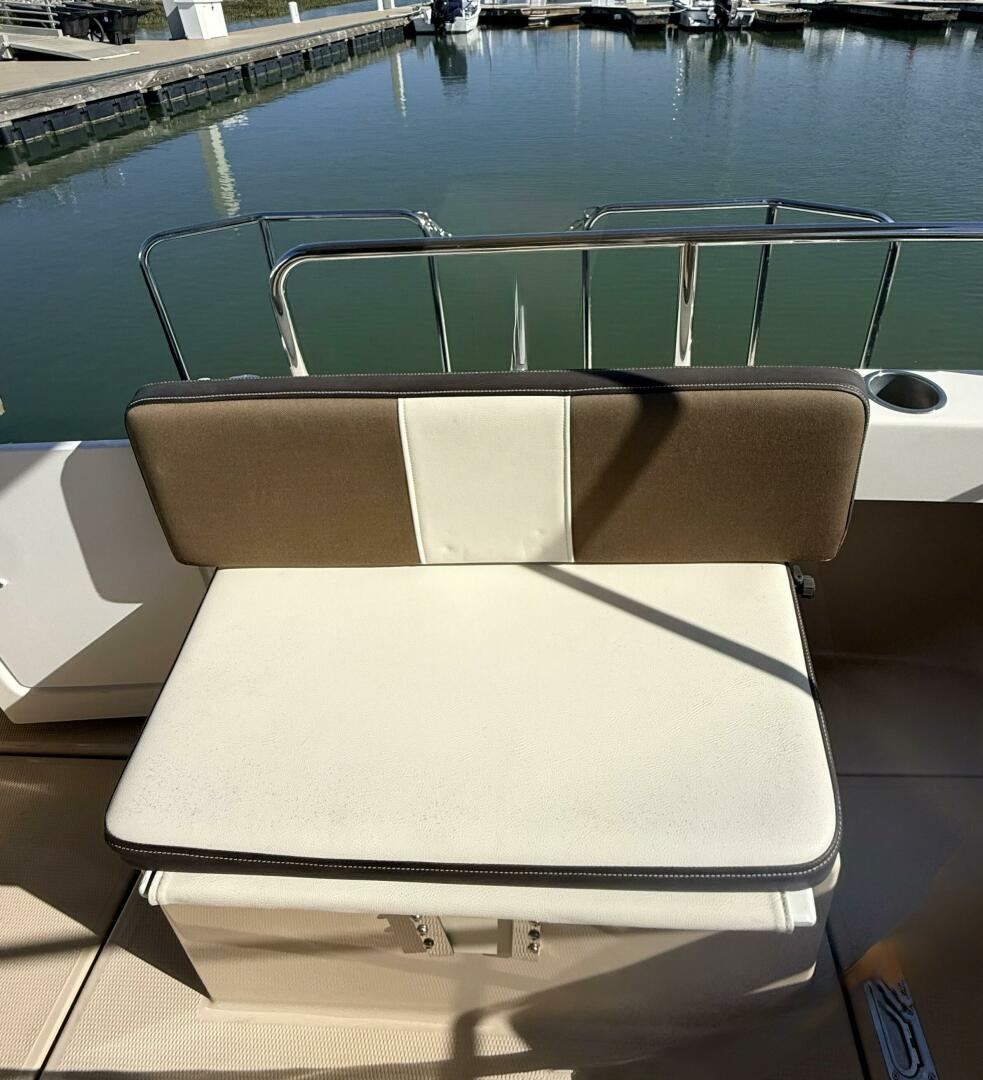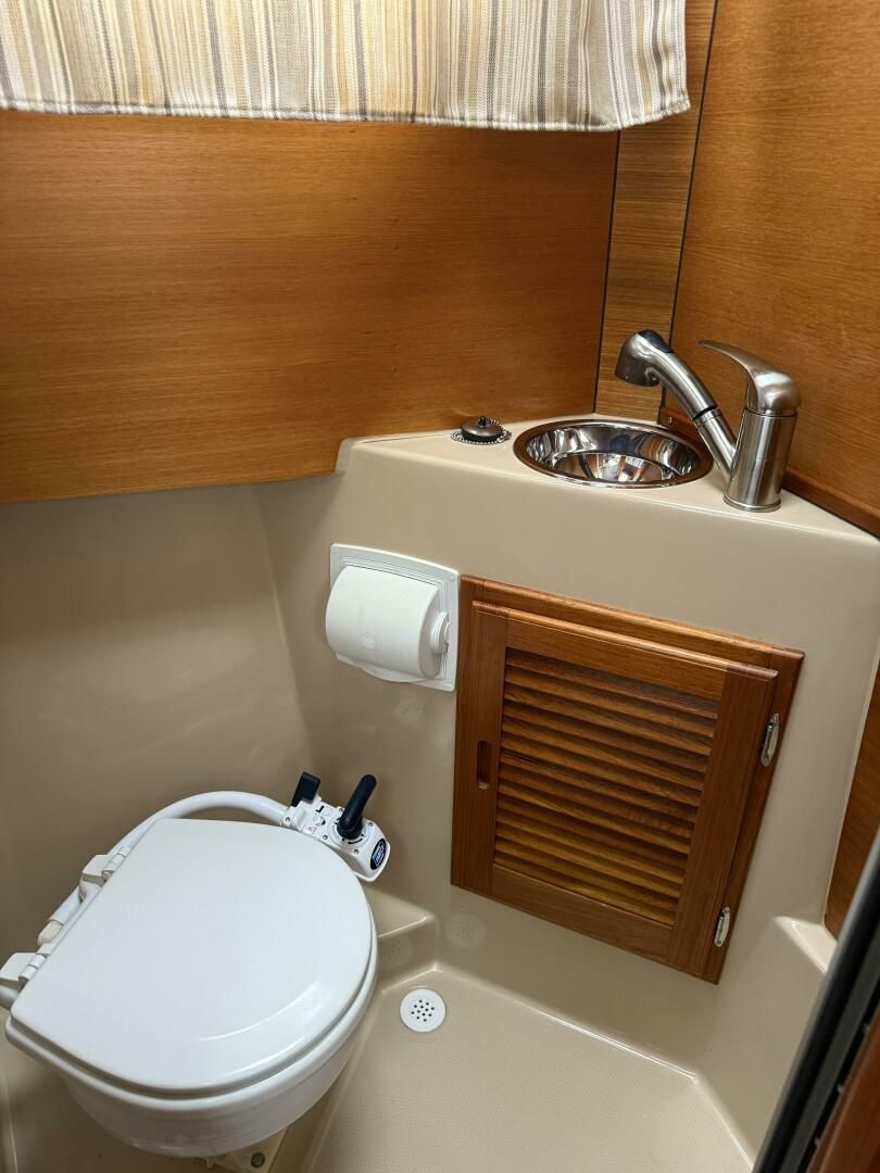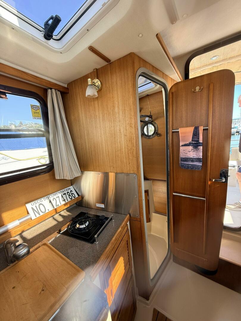 Entering through the glass door to the salon from the aft cockpit, you’ll find a thoughtfully laid‑out salon: to starboard a fully enclosed head with shower, next forward a lovely galley (sink, stove-top, refrigerator/freezer, microwave), following forward on Starboard a comfortable duo tone leather seating for Captain with excellent visibility and full electronics, bow thrusters and windless control. To Port a dining and entertaining table with duo tone leather bench seats and forward on port, a matching bench seat that faces forward and folds down where the stereo controls are also located. Ample windows and skylight hatches flood the cabin with natural light and offer panoramic views. The forward berth provides cozy private sleeping quarters in the bow that converts to seating area for versatility.