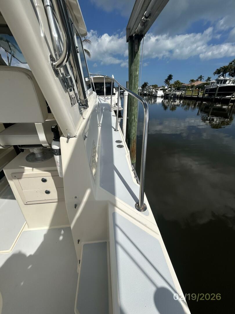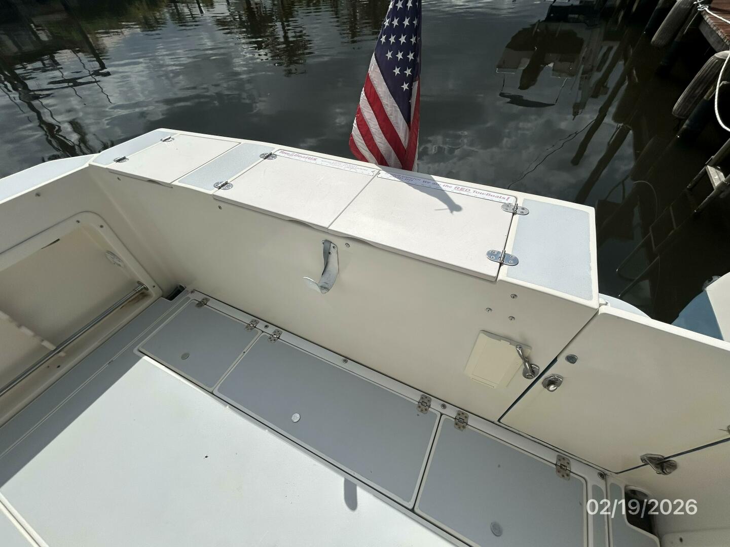 The large cockpit offers rod storage on each side, a sun pad on the engine hatch, transom and below-deck storage, non-skid deck, transom gate to the fiberglass swimplatform, livewell, 7 rod holders, Rupp outriggers, aluminum Radar arch and molded-in steps to each side deck.
