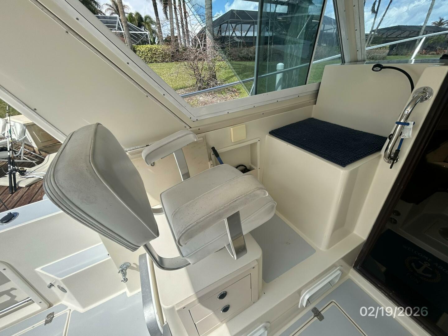 The upper deck offers a hardtop, Eisenglass enclosure aft, helm starboard forward, Garelick Eez-In helmseat, non-skid deck, searchlight control, Morse engine control, Vetus bowthruster control, Bennett trim tabs controls, Faria gauges, anchor windlass control, 12 vdc outlet, AFI windshield wipers, fan, opening side windows, mate seat to port and electronics as detailed in the electronics section in this presentation.