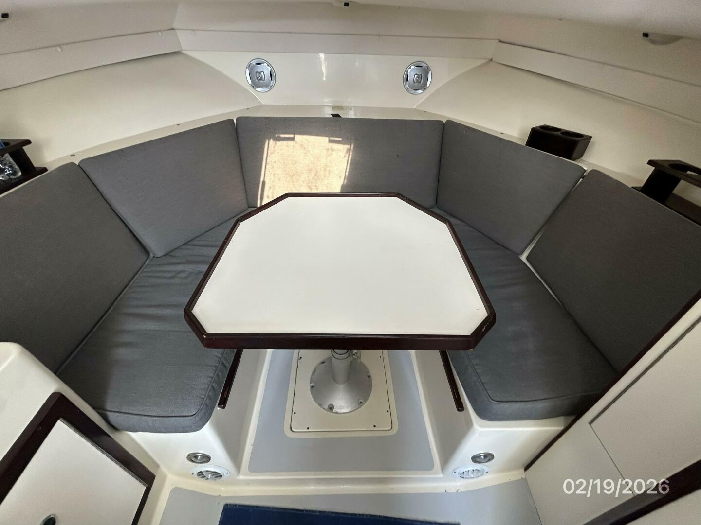 From the fiberglass swimplatform, you enter the large cockpit via a transom gate port aft. Once inside the cockpit, you will find molded-in steps to each side deck, a sun pad on the engine hatch and loads of storage. Walk forward and step up into the upper deck to find the helm and helmseat starboard forward, mate seat port forward and storage below deck. Walk forward and step down the companionway to find a quarter berth port aft, galley to port, wrap-around settee with removable table that converts to a double size berth forward and head to starboard.
