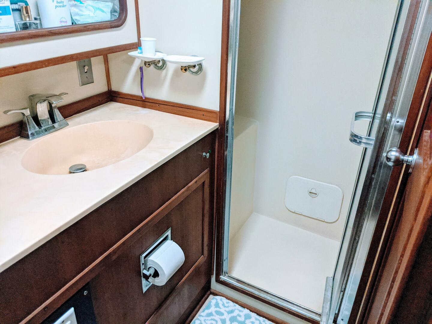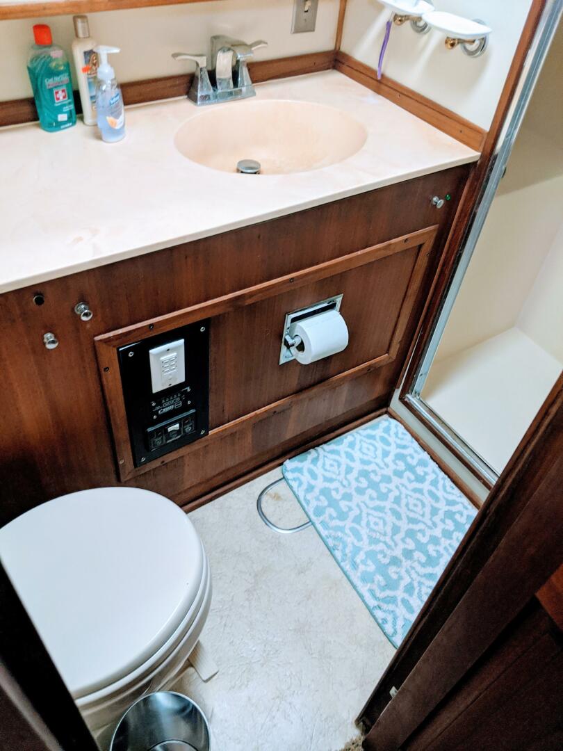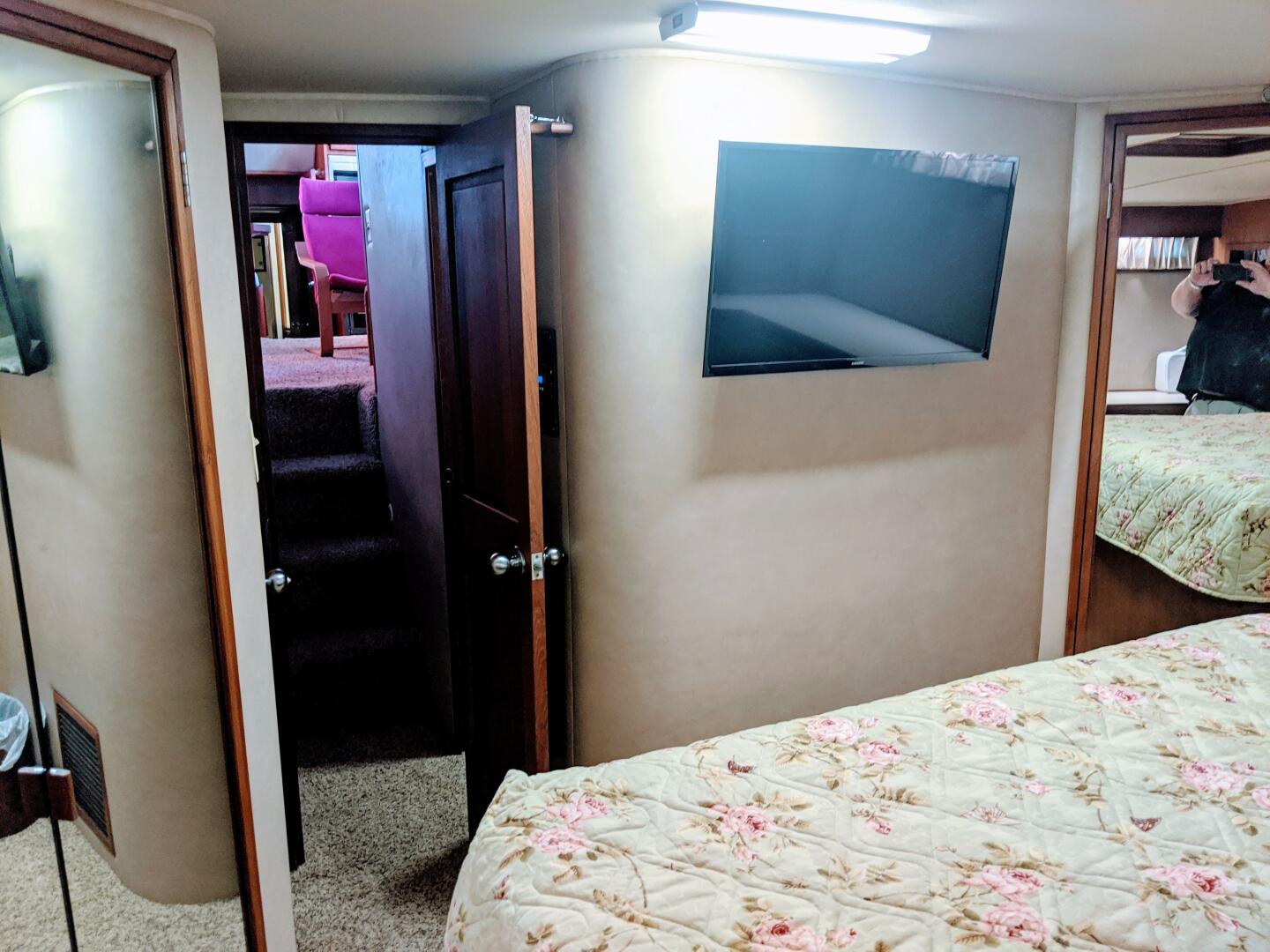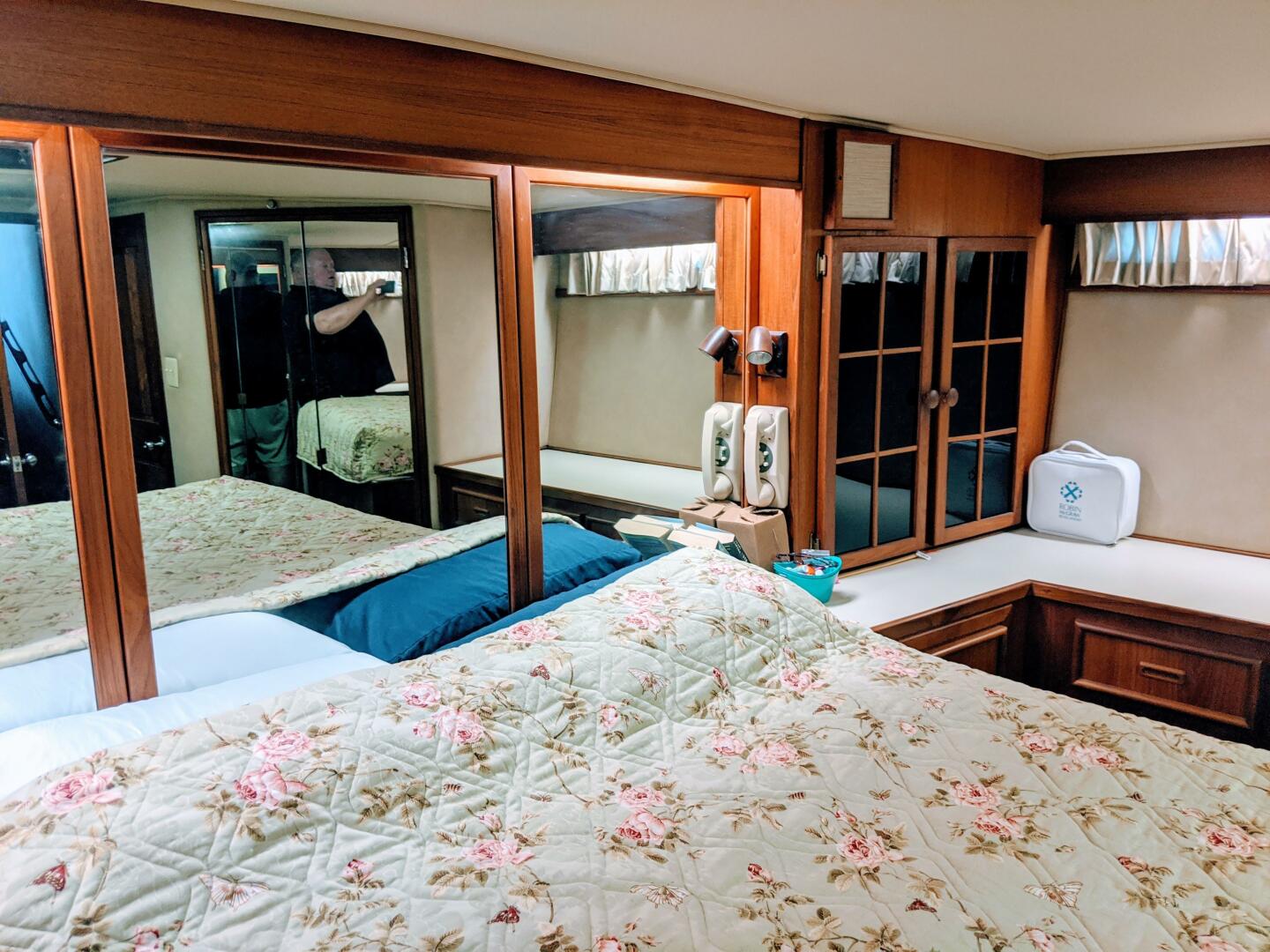 Access to the flybridge is gained by a ladder in upper salon. Down four steps to port is the main salon. Down three steps aft from the main salon is an office/third stateroom to starboard. The master/guest head is to port with a proper stall shower. Master stateroom is aft and full beam. Queen centerline berth with drawers located on either side. Just forward of the salon on the port side you will find the built-in "L shaped" dinette. The galley is immediately to starboard (down two steps). The forward stateroom has two oversized berths (upper/lower bunks) with head/shower in the forepeak.
