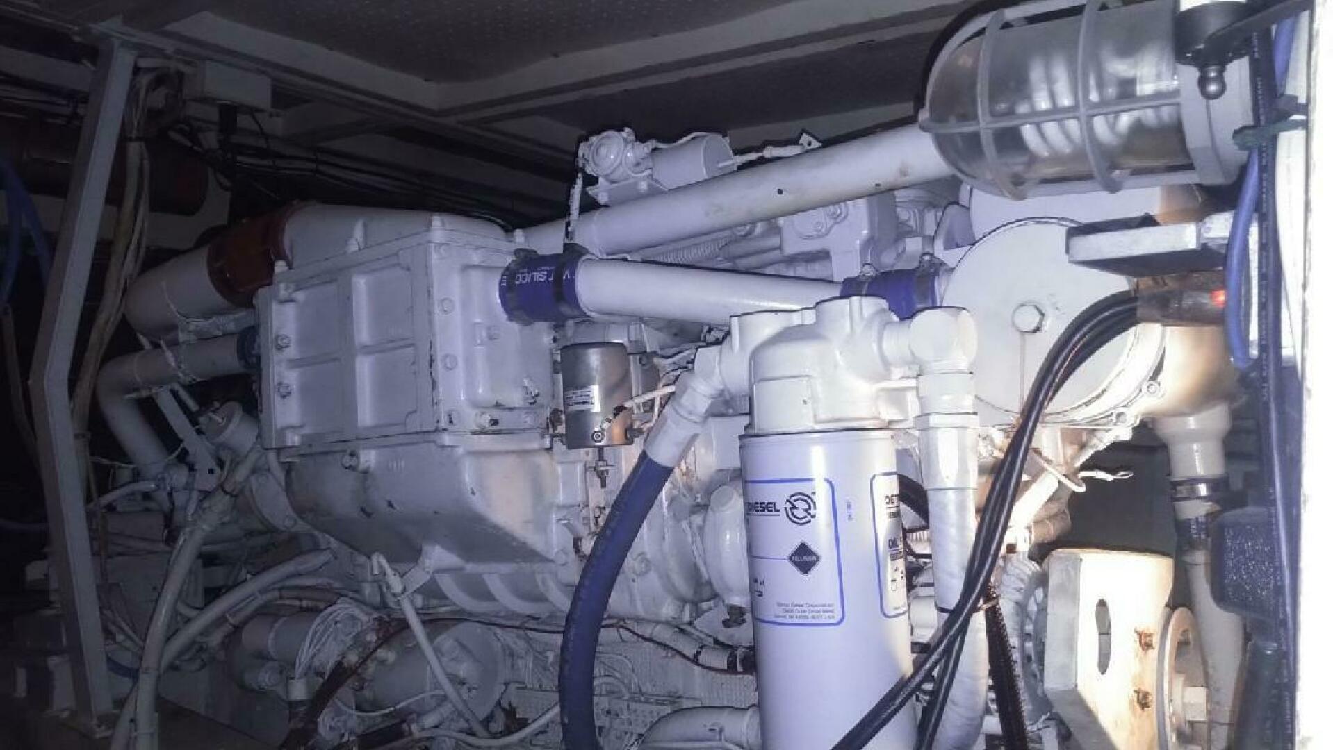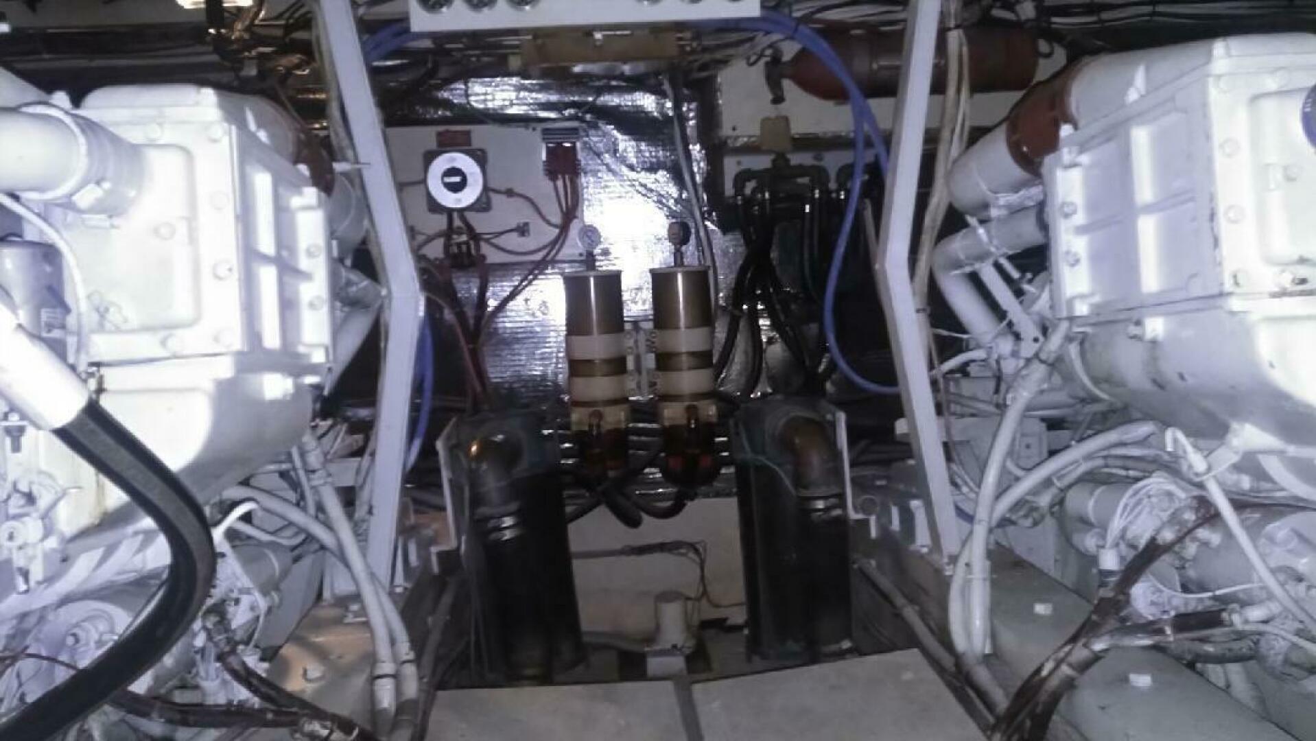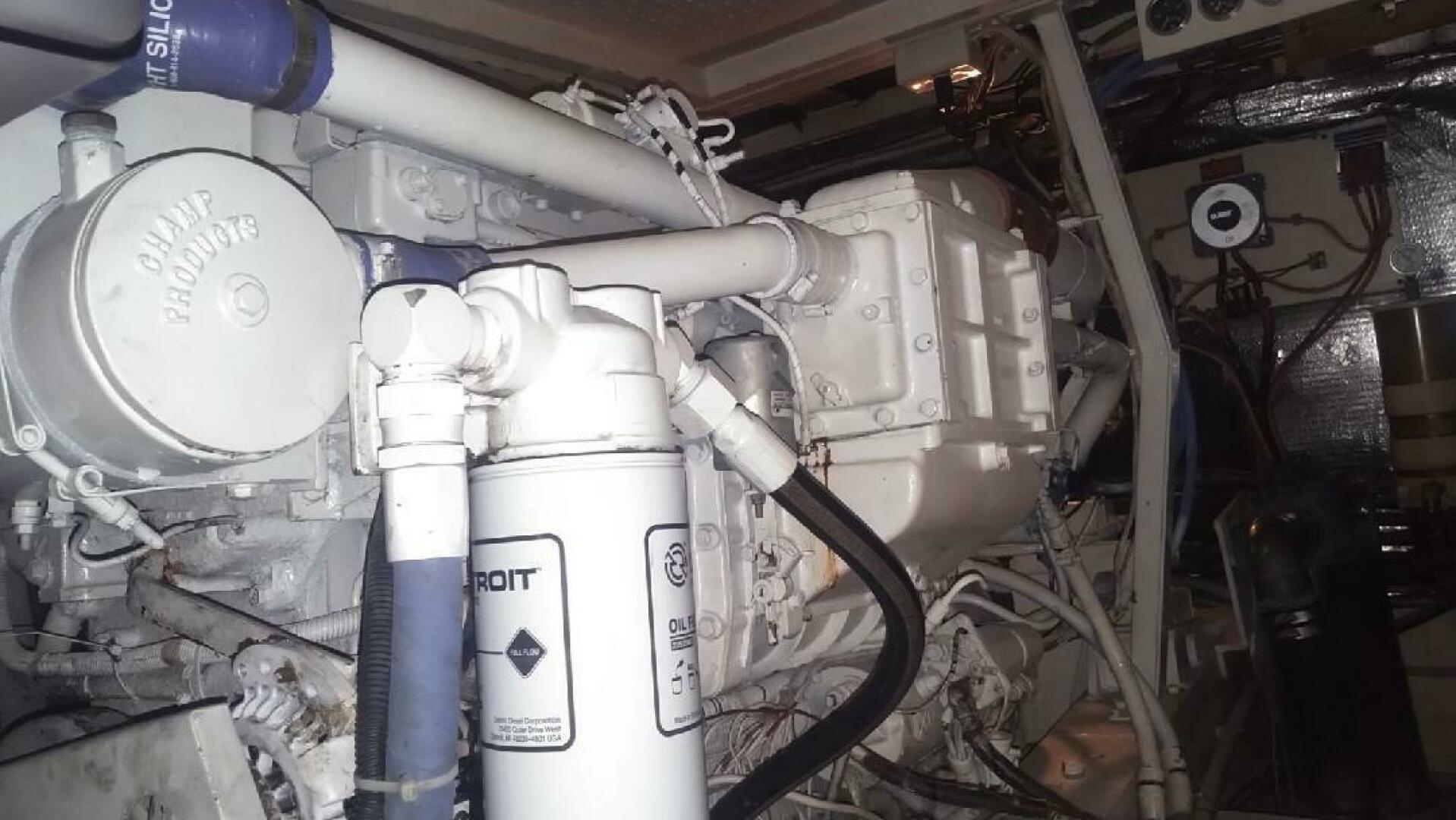 Access to the flybridge is gained by a ladder in upper salon. Down four steps to port is the main salon. Down three steps aft from the main salon is an office/third stateroom to starboard. The master/guest head is to port with a proper stall shower. Master stateroom is aft and full beam. Queen centerline berth with drawers located on either side. Just forward of the salon on the port side you will find the built-in "L shaped" dinette. The galley is immediately to starboard (down two steps). The forward stateroom has two oversized berths (upper/lower bunks) with head/shower in the forepeak.