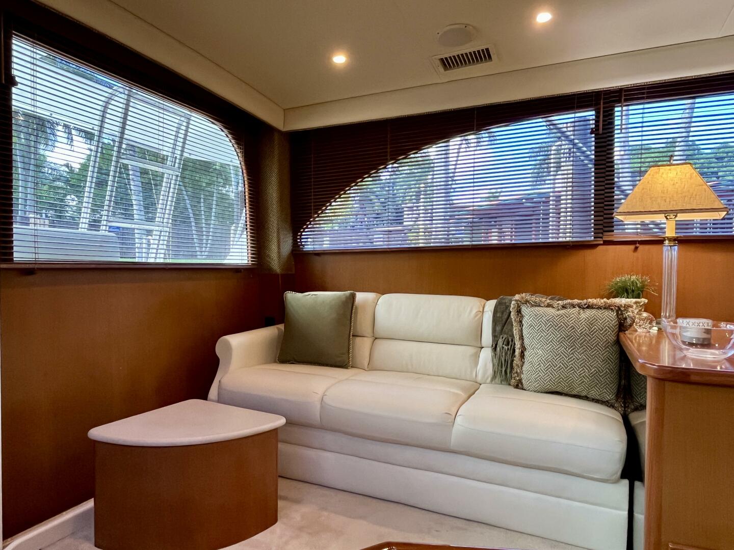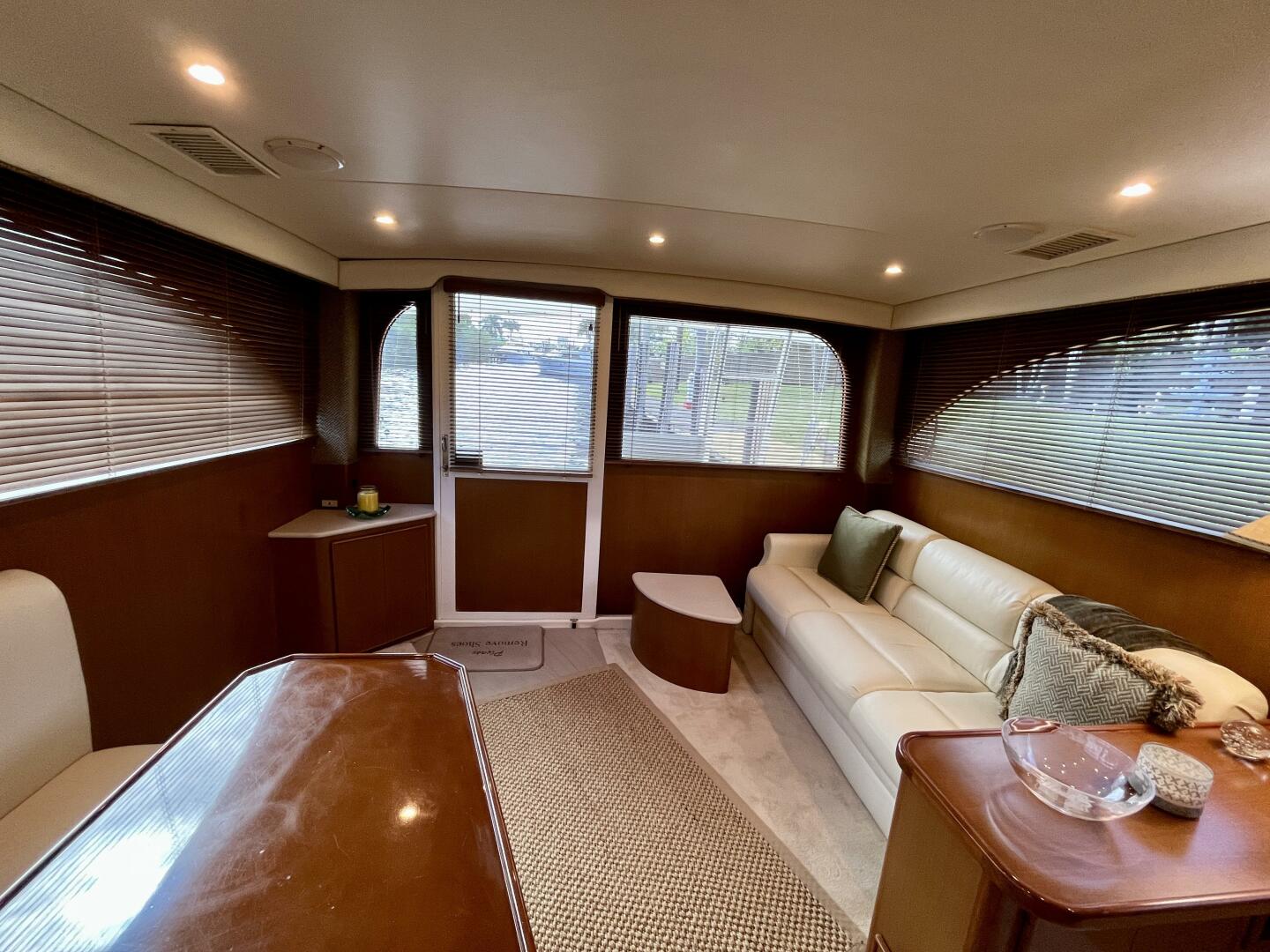 - Interior: Two-stateroom layout, full head with access from passageway or forward stateroom, teak & holly floors, full galley up (Corian counters), washer & dryer, flat screen TV, SMX A/C controls