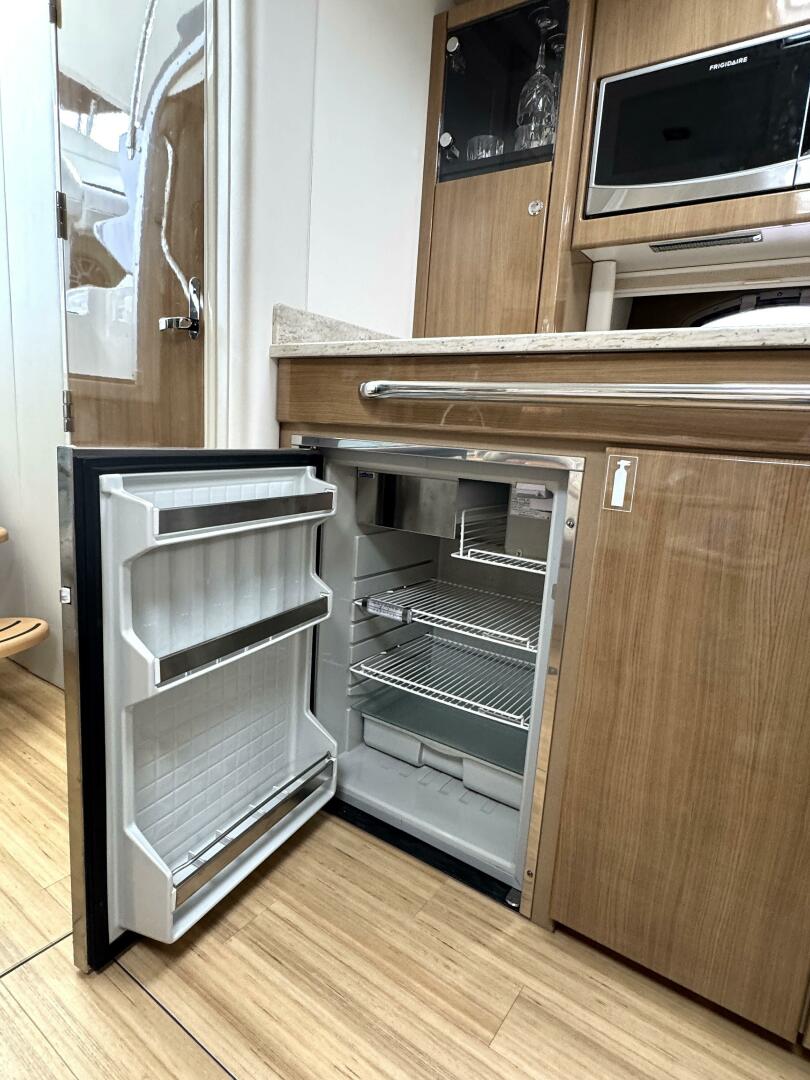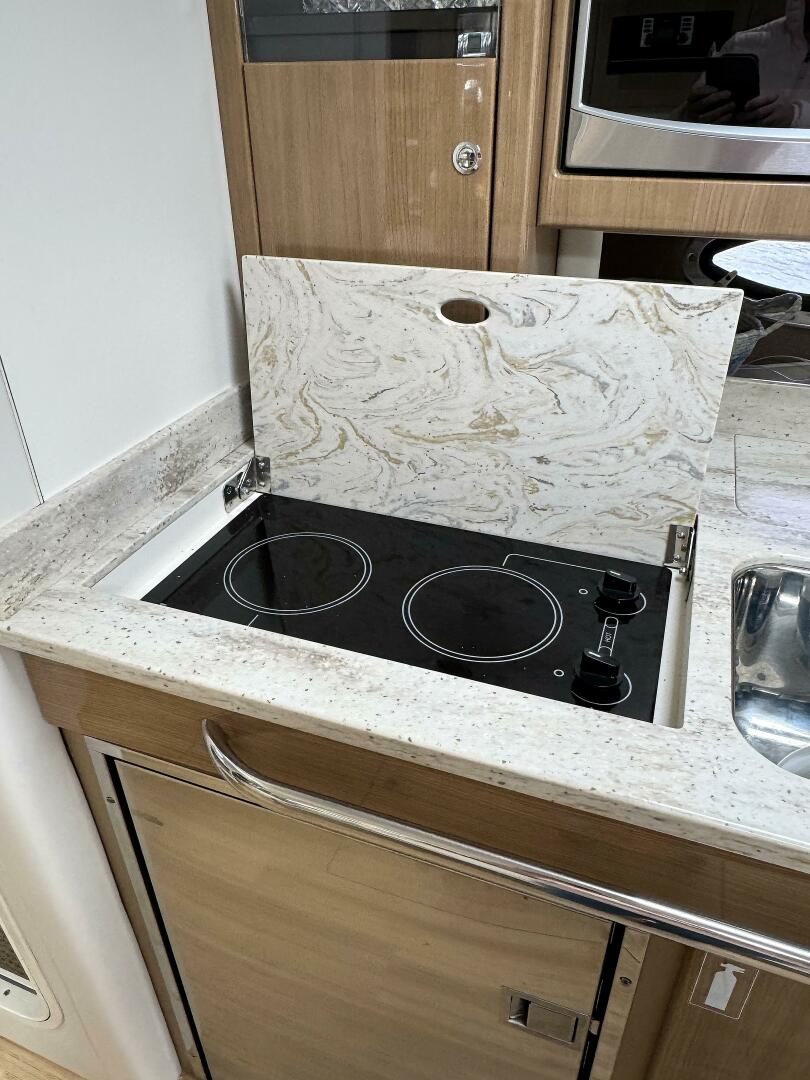 · Complete galley in high-gloss finish w/storage and hardwood dovetailed drawers, full Corian countertop, beverage center, polished stainless-steel sink, concealed 2-burner electric stove w/safety shut-off switch, 120V/12V stainless steel refrigerator, microwave oven & concealed in-counter trash container