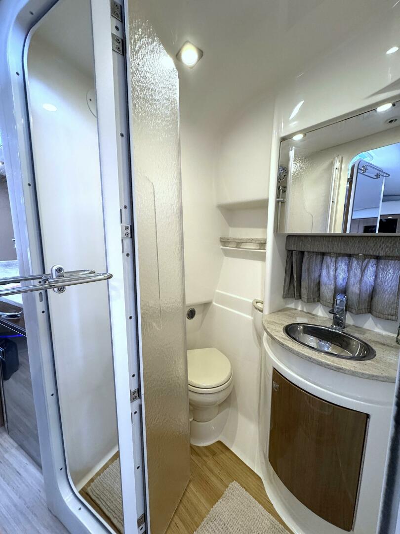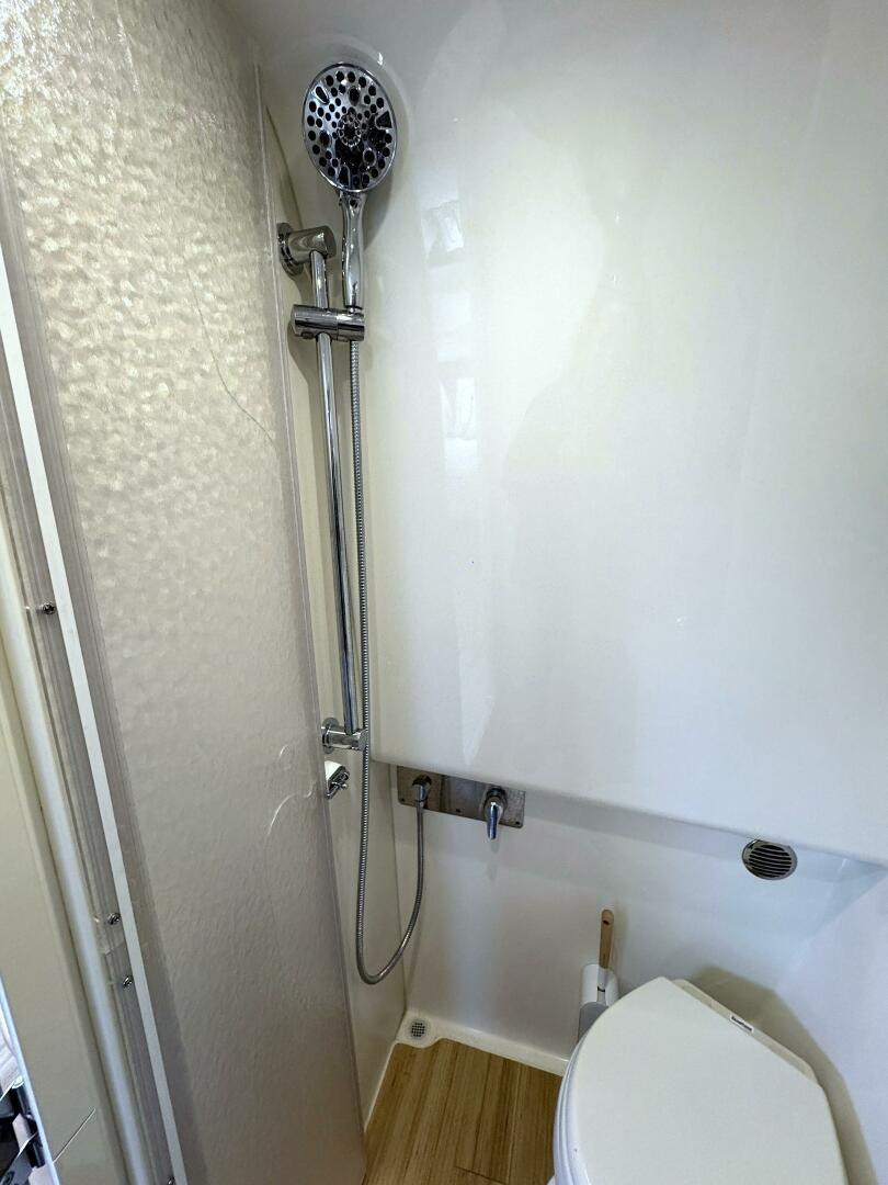 · Molded private head compartment w/molded vanity, lower doors in high-gloss finish, Corian counter, polished stainless steel sink w/swivel faucet, VacuFlush® unit w/holding tank & dockside pump out, separate stall shower w/hinged acrylic door & exhaust fan