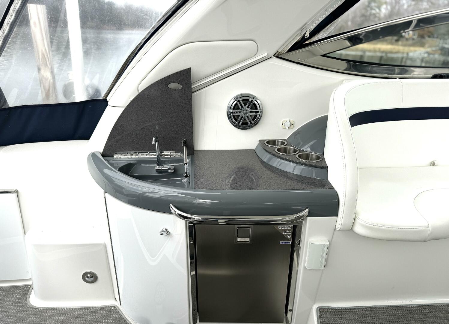 From the moment you step into the cockpit, you’re greeted by premium finishes—PreFixx® coated, weather-resistant seating, custom patterned carpet, and a molded wet bar with Corian® countertops. The spacious layout offers twin command seating, a U-shaped lounge, and a convertible sunpad, making it perfect for entertaining family and friends.
