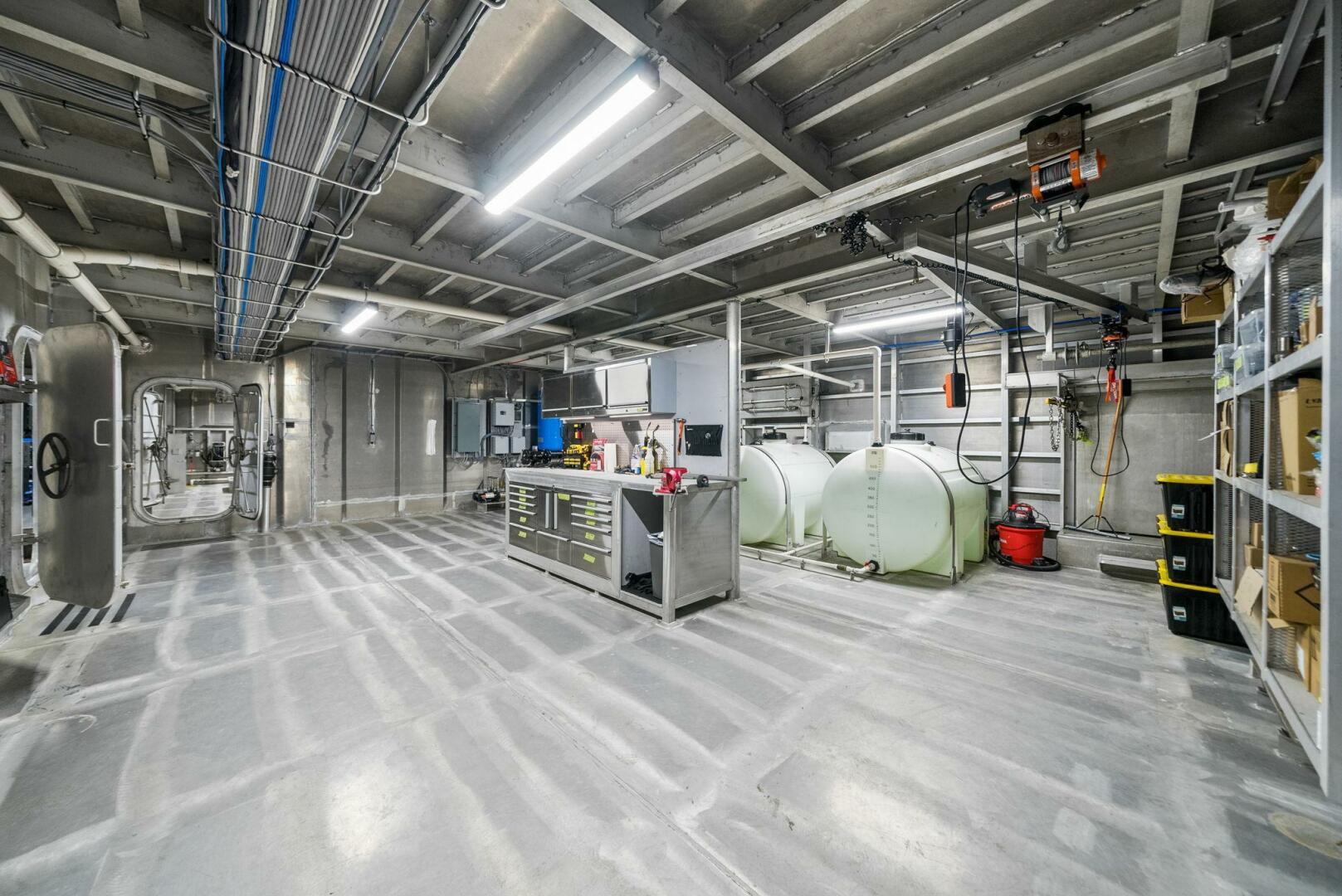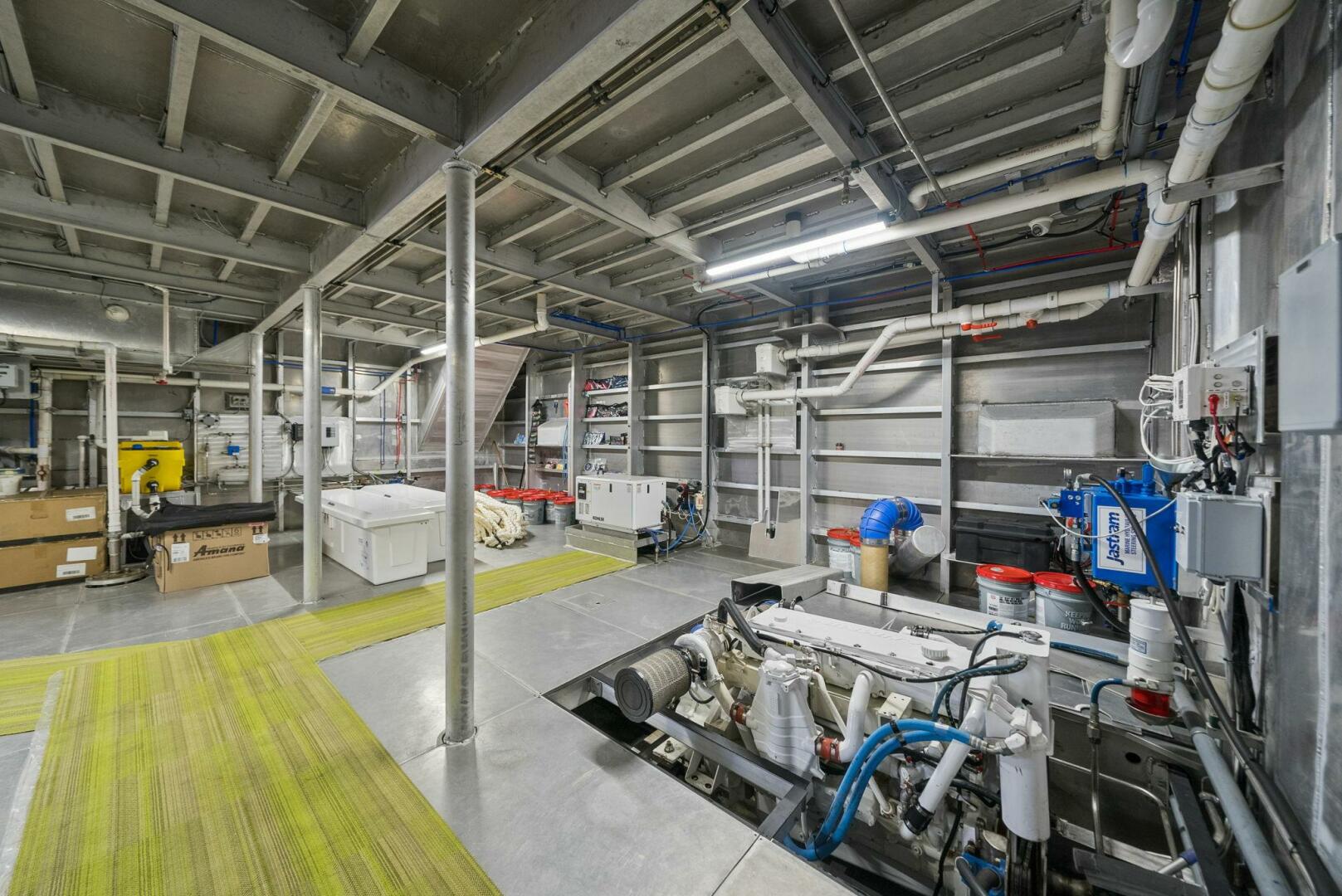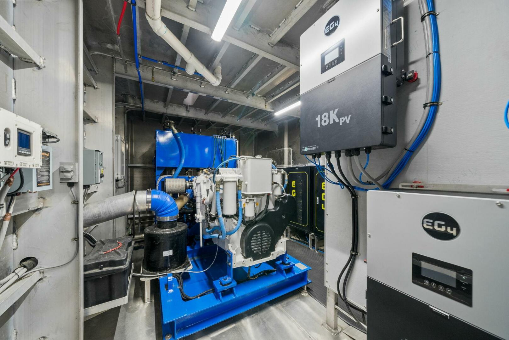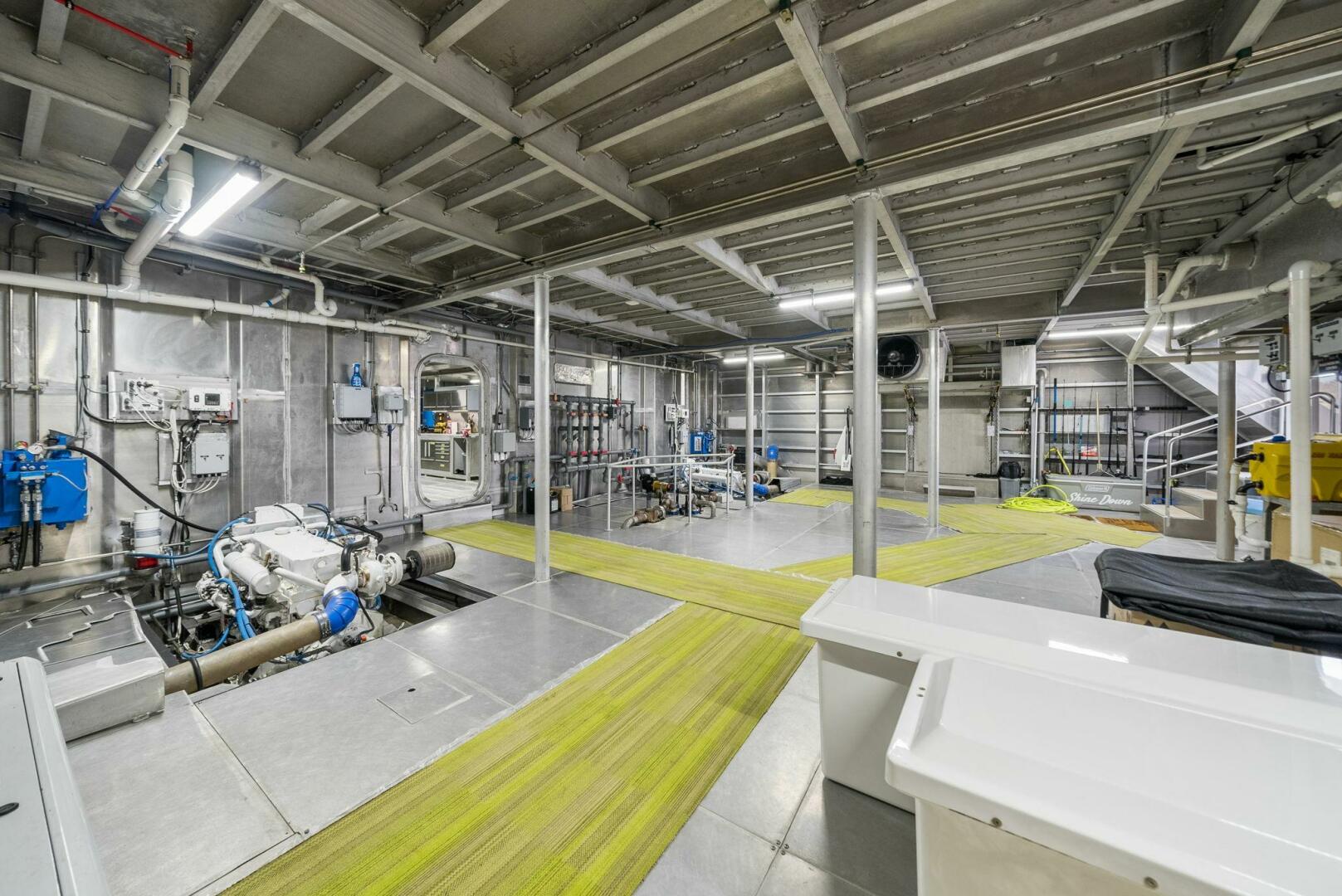 Below decks, the expansive subdeck area (approximately 4,200 sq ft within the 12-ft depth) houses the vessel's advanced mechanical and utility systems. This includes the core of the off-grid power ecosystem—over 300 kWh of lithium iron phosphate (LFP) battery storage, inverters, and supporting infrastructure for the 108 solar panels—along with water purification, HVAC components, additional storage (including freezers for long-term provisioning), two laundry rooms, and essential mechanical equipment. Engineered for reliability and accessibility, these lower spaces ensure quiet, efficient operation while maintaining the vessel's impressive energy independence and low-maintenance aluminum construction.