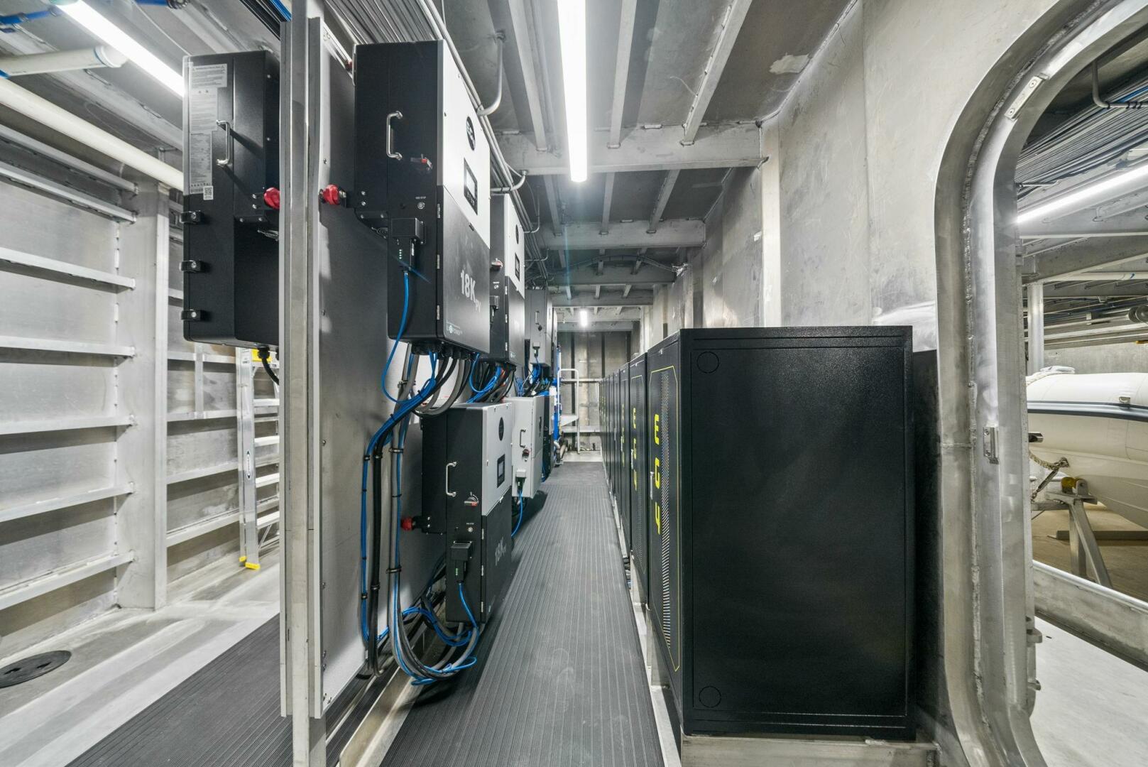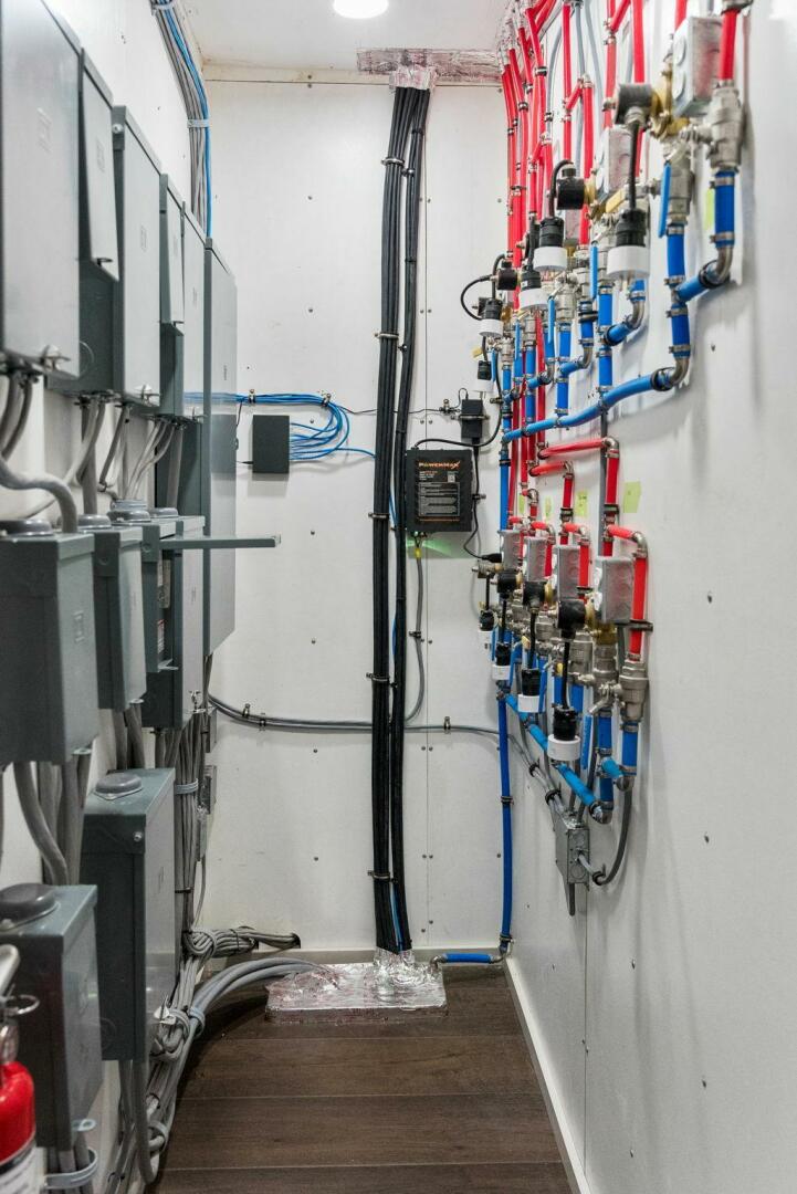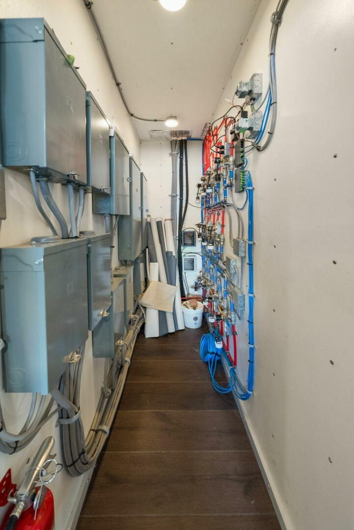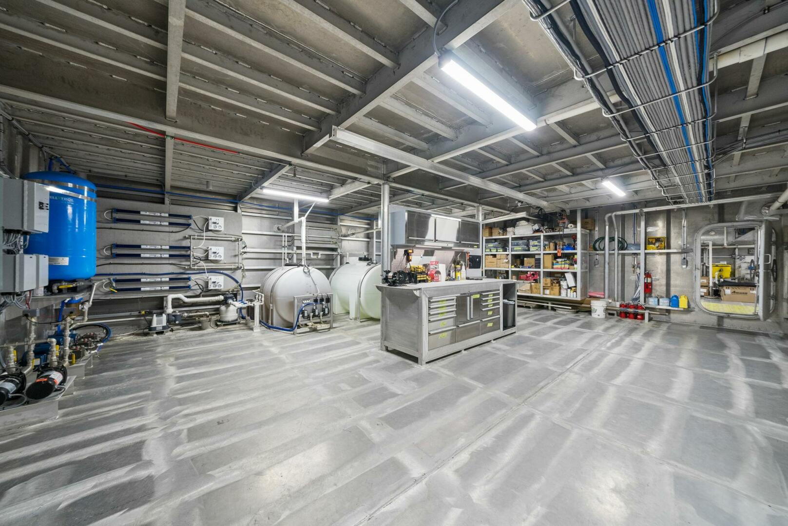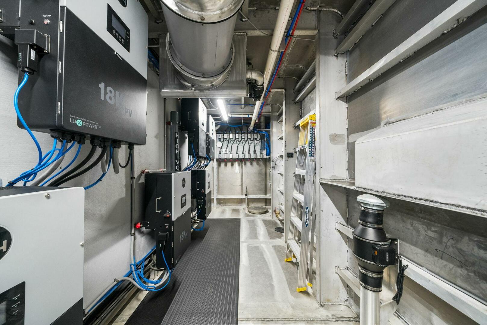 Below decks, the expansive subdeck area (approximately 4,200 sq ft within the 12-ft depth) houses the vessel's advanced mechanical and utility systems. This includes the core of the off-grid power ecosystem—over 300 kWh of lithium iron phosphate (LFP) battery storage, inverters, and supporting infrastructure for the 108 solar panels—along with water purification, HVAC components, additional storage (including freezers for long-term provisioning), two laundry rooms, and essential mechanical equipment. Engineered for reliability and accessibility, these lower spaces ensure quiet, efficient operation while maintaining the vessel's impressive energy independence and low-maintenance aluminum construction.