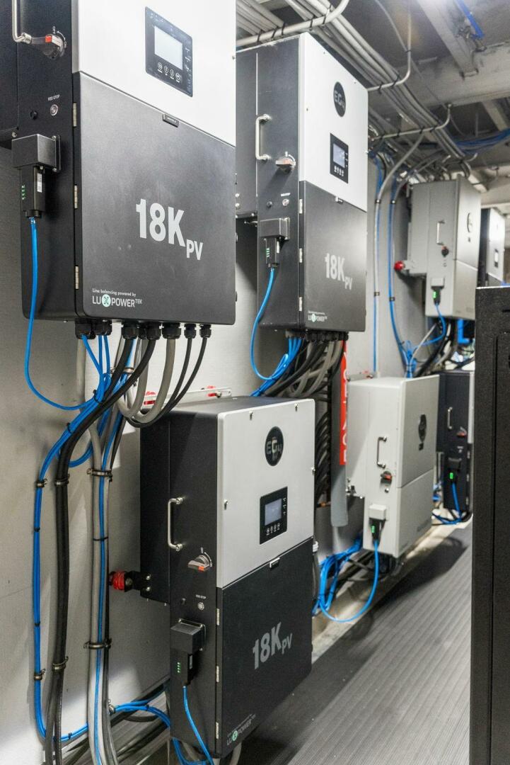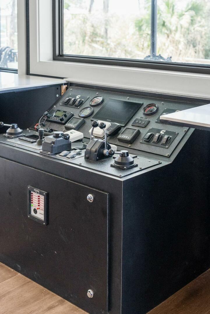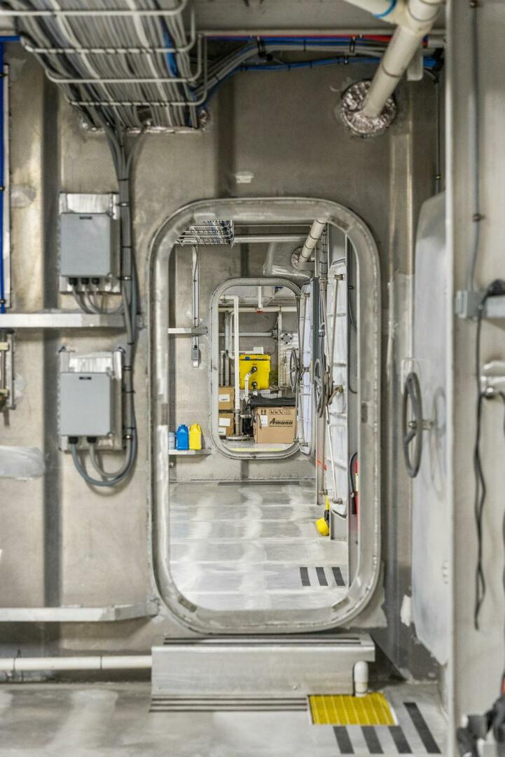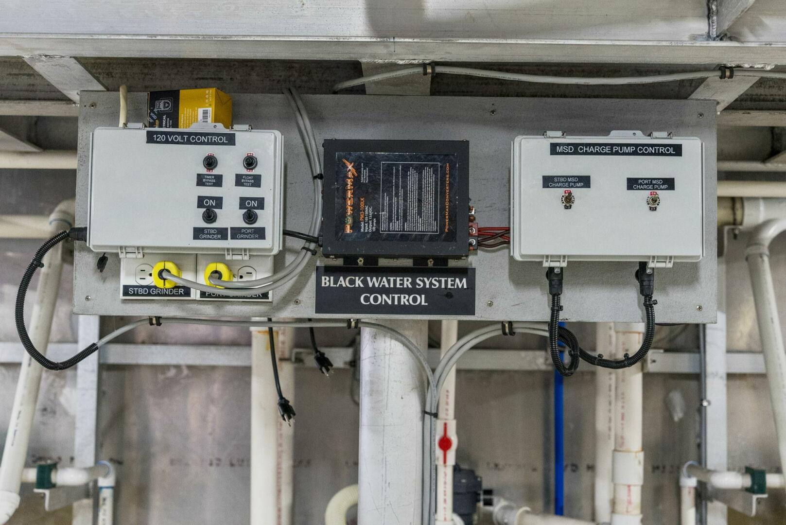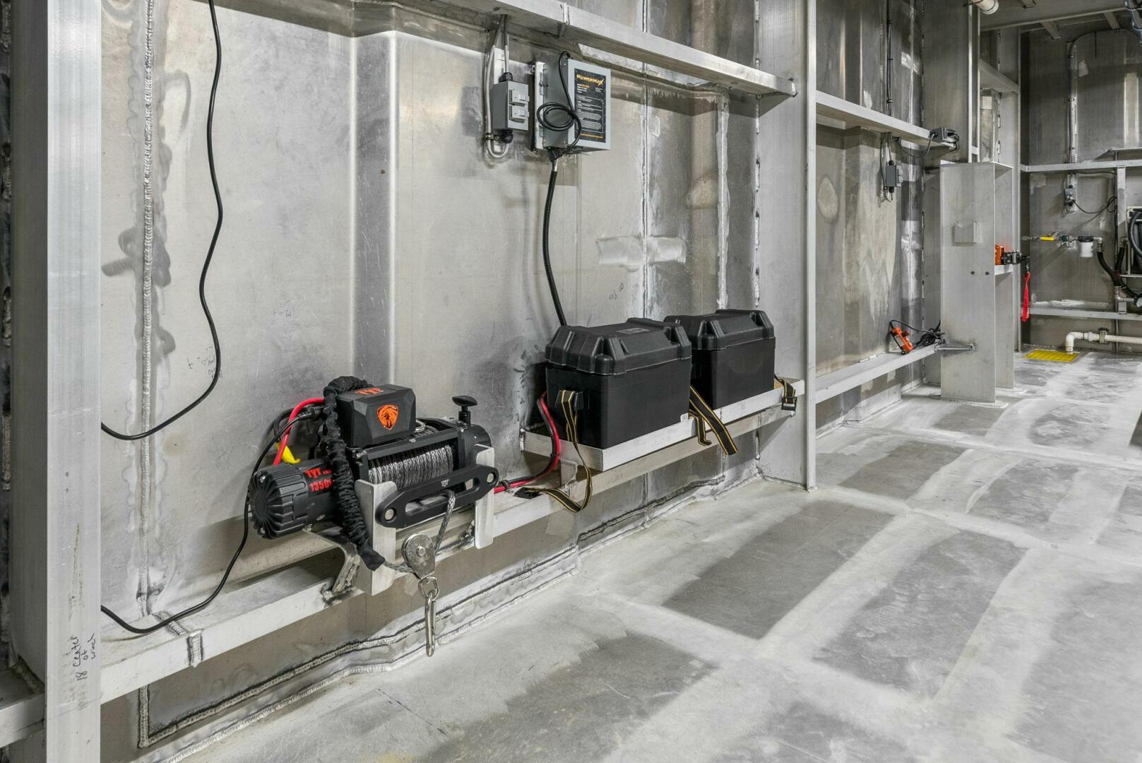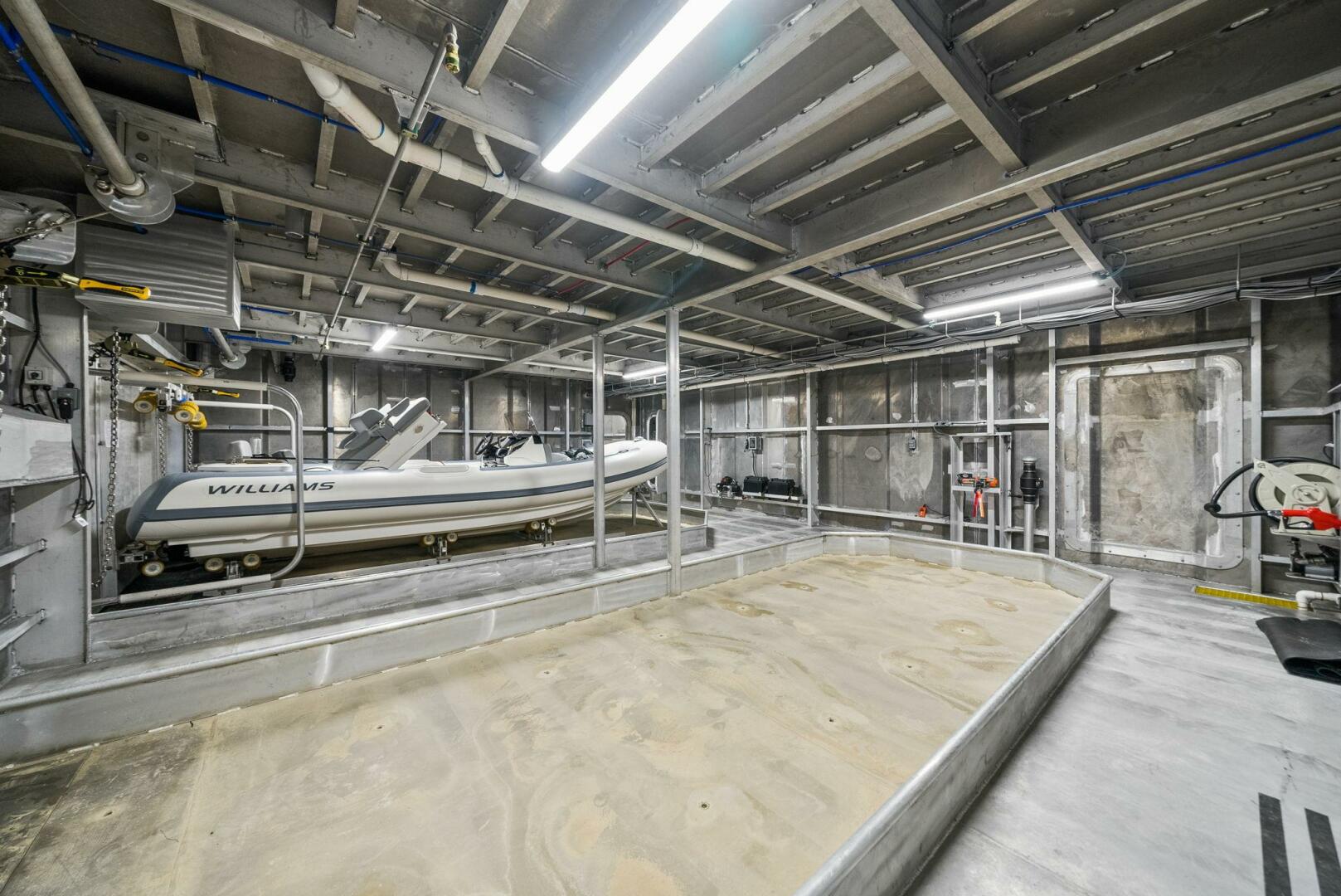 Below decks, the expansive subdeck area (approximately 4,200 sq ft within the 12-ft depth) houses the vessel's advanced mechanical and utility systems. This includes the core of the off-grid power ecosystem—over 300 kWh of lithium iron phosphate (LFP) battery storage, inverters, and supporting infrastructure for the 108 solar panels—along with water purification, HVAC components, additional storage (including freezers for long-term provisioning), two laundry rooms, and essential mechanical equipment. Engineered for reliability and accessibility, these lower spaces ensure quiet, efficient operation while maintaining the vessel's impressive energy independence and low-maintenance aluminum construction.