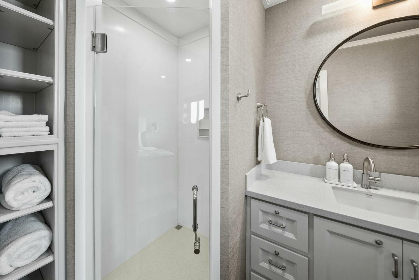 The owner's en suite bathroom exemplifies refined luxury, offering spacious layout with premium fixtures, ample storage, and thoughtful details that enhance daily comfort. High-quality materials, abundant natural light (where applicable), and modern amenities create a spa-like sanctuary—perfect for unwinding after a day on the water.
