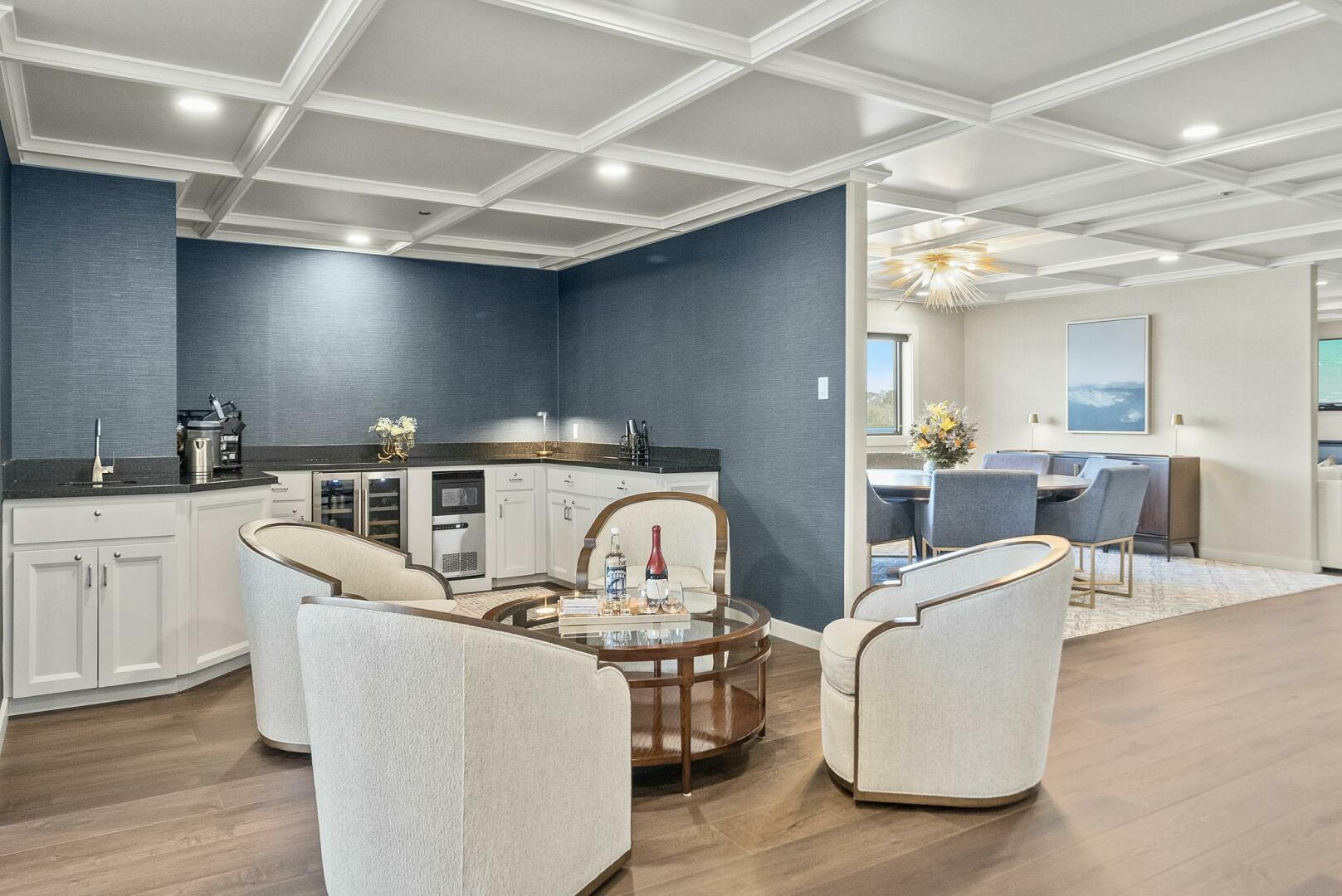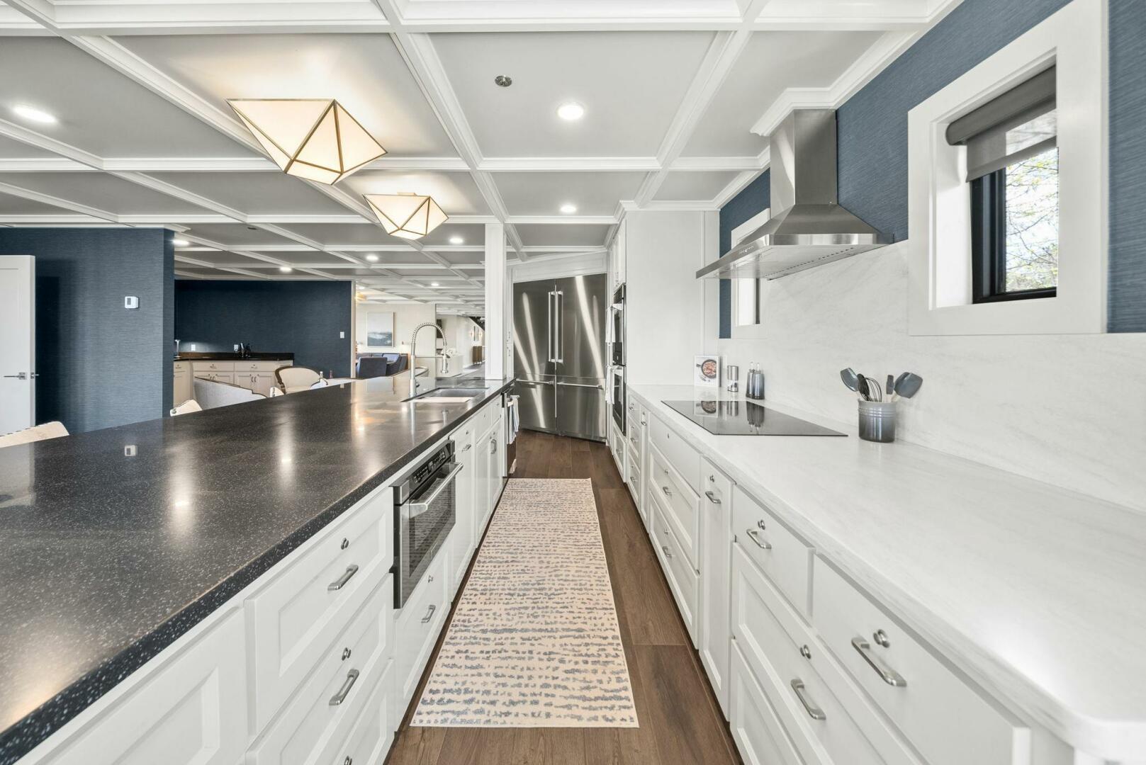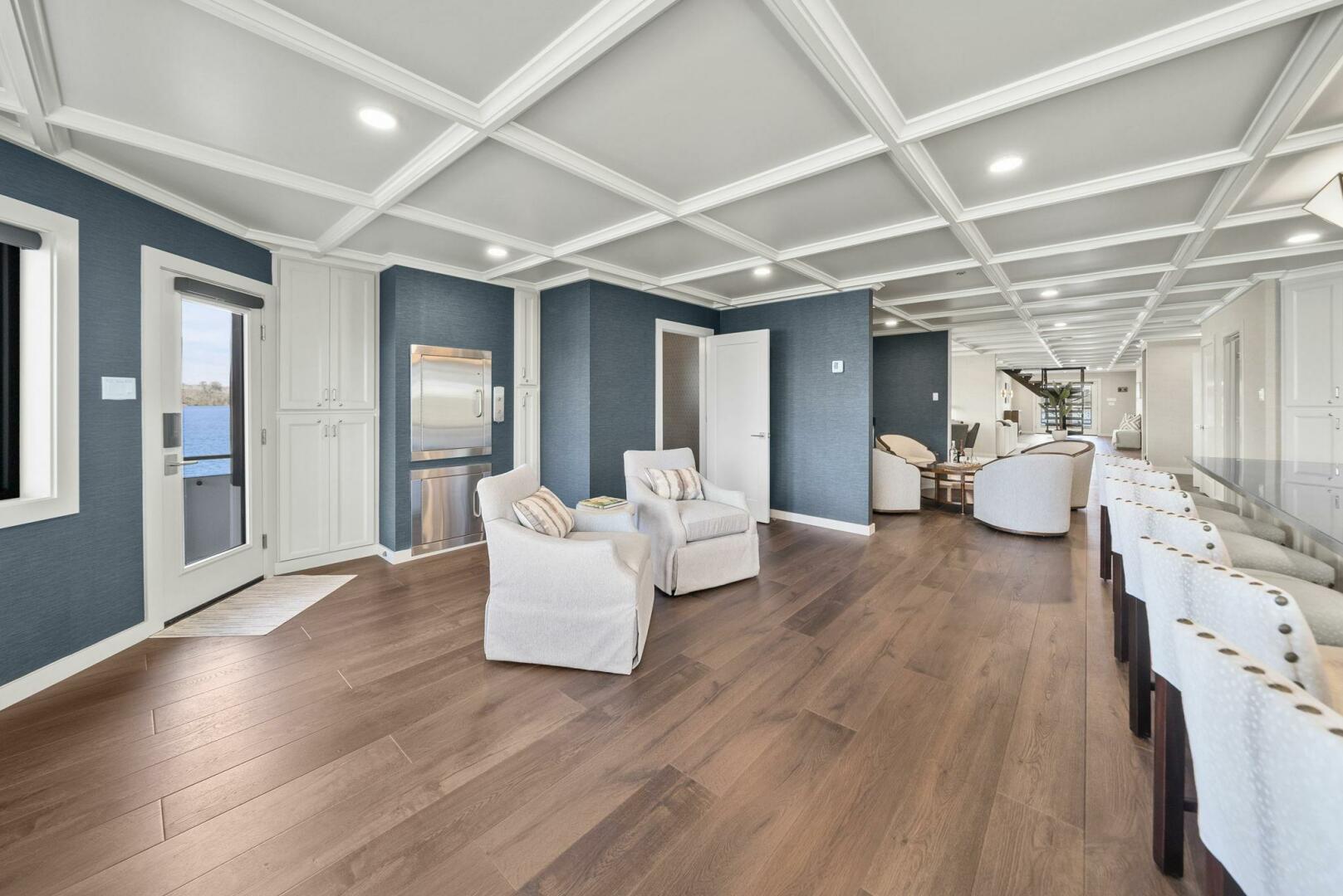 The main-deck luxury kitchen is a chef's dream, fully equipped for gourmet preparation and entertaining. It includes high-end appliances, expansive counter space, large refrigerators, additional freezers (with below-deck storage for extended provisioning), and a convenient dumbwaiter system for seamless service to the rooftop party deck or upper levels. Adjacent areas feature a coffee lounge for casual mornings and a formal dining space, blending functionality with open, inviting flow ideal for family meals or hosted gatherings.