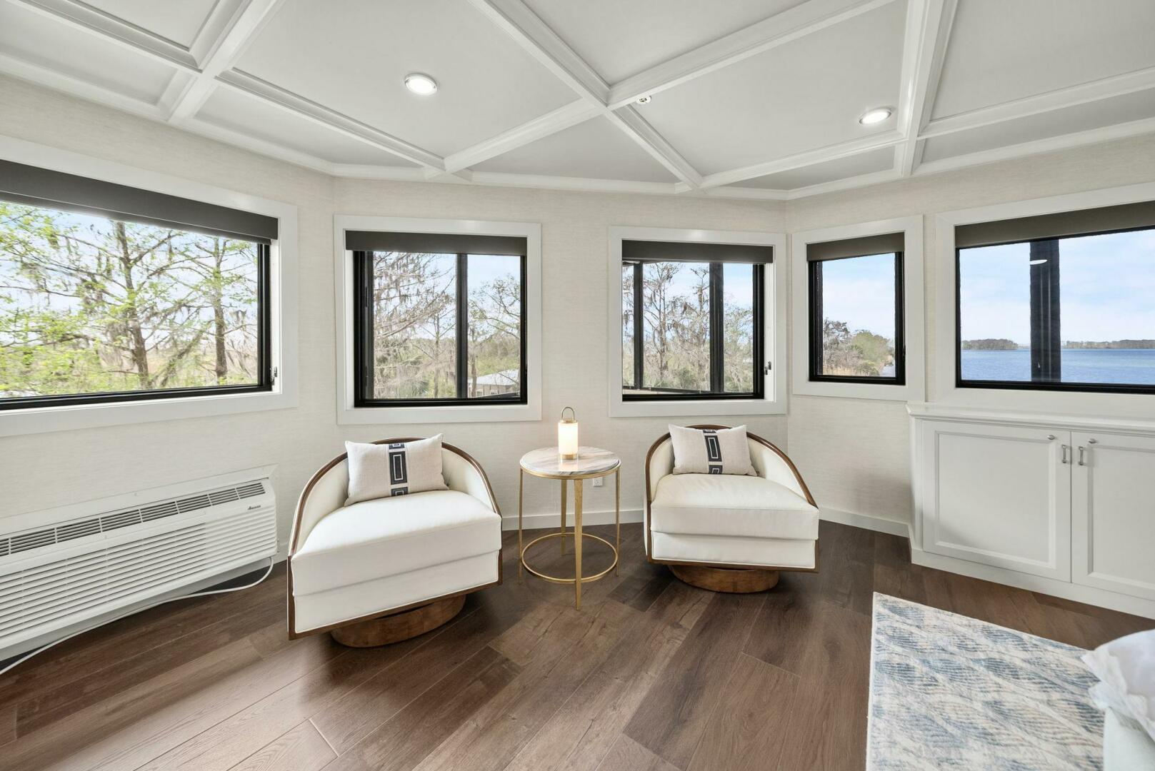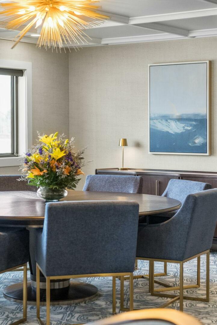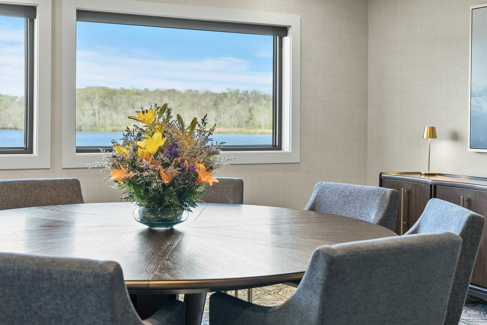 The main salon serves as the heart of onboard living—spacious, light-filled, and elegantly appointed with comfortable seating, entertainment options, and panoramic views that connect indoor luxury to the surrounding waterways. Additional lounges and observation areas, including a third-deck observation lounge with wrap-around balconies, provide versatile spaces for relaxation, socializing, or quiet contemplation. The design emphasizes open flow, high ceilings, and energy-efficient insulation (12" thick walls and 16" roof) for year-round comfort without compromising the vessel's self-sufficient ethos.