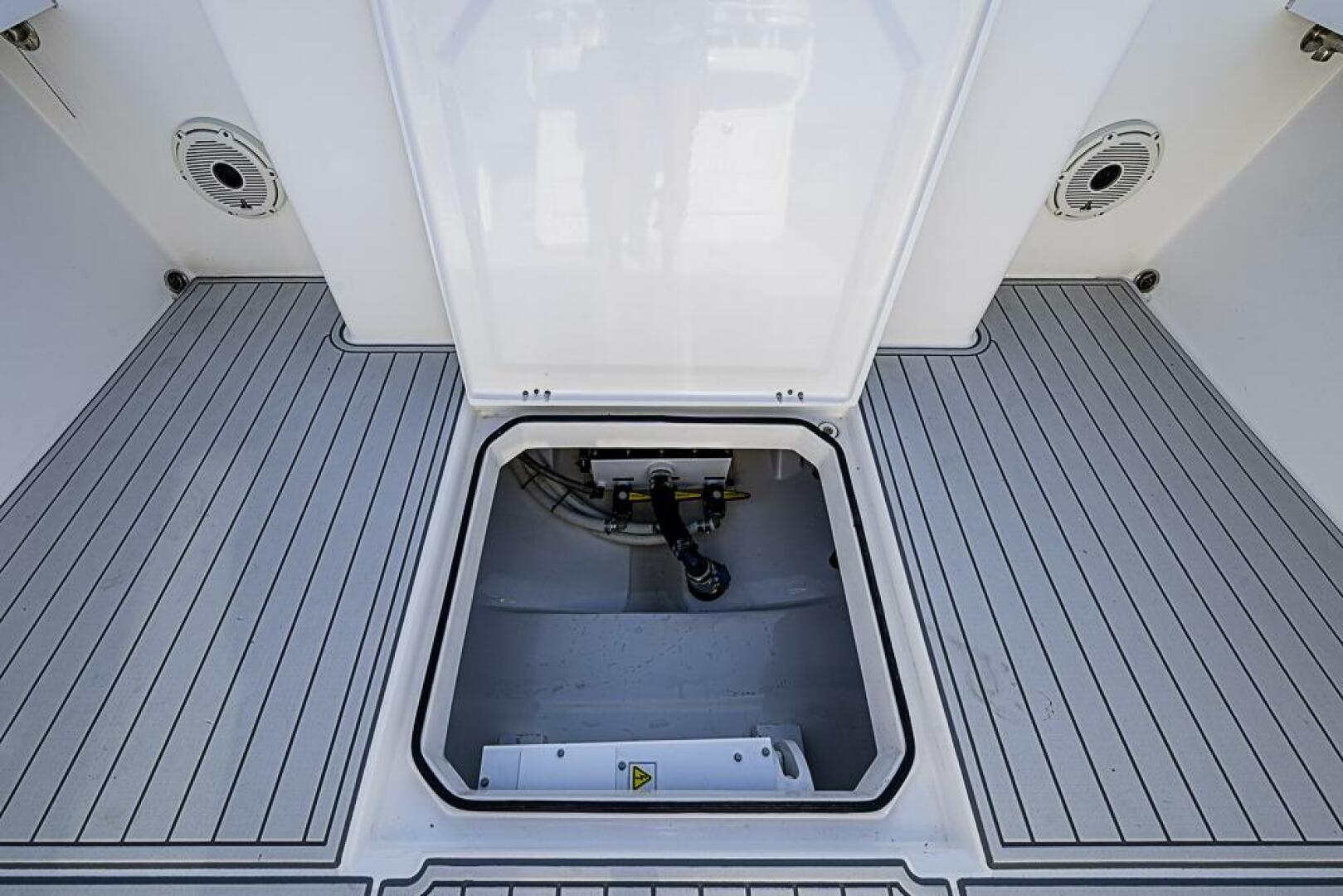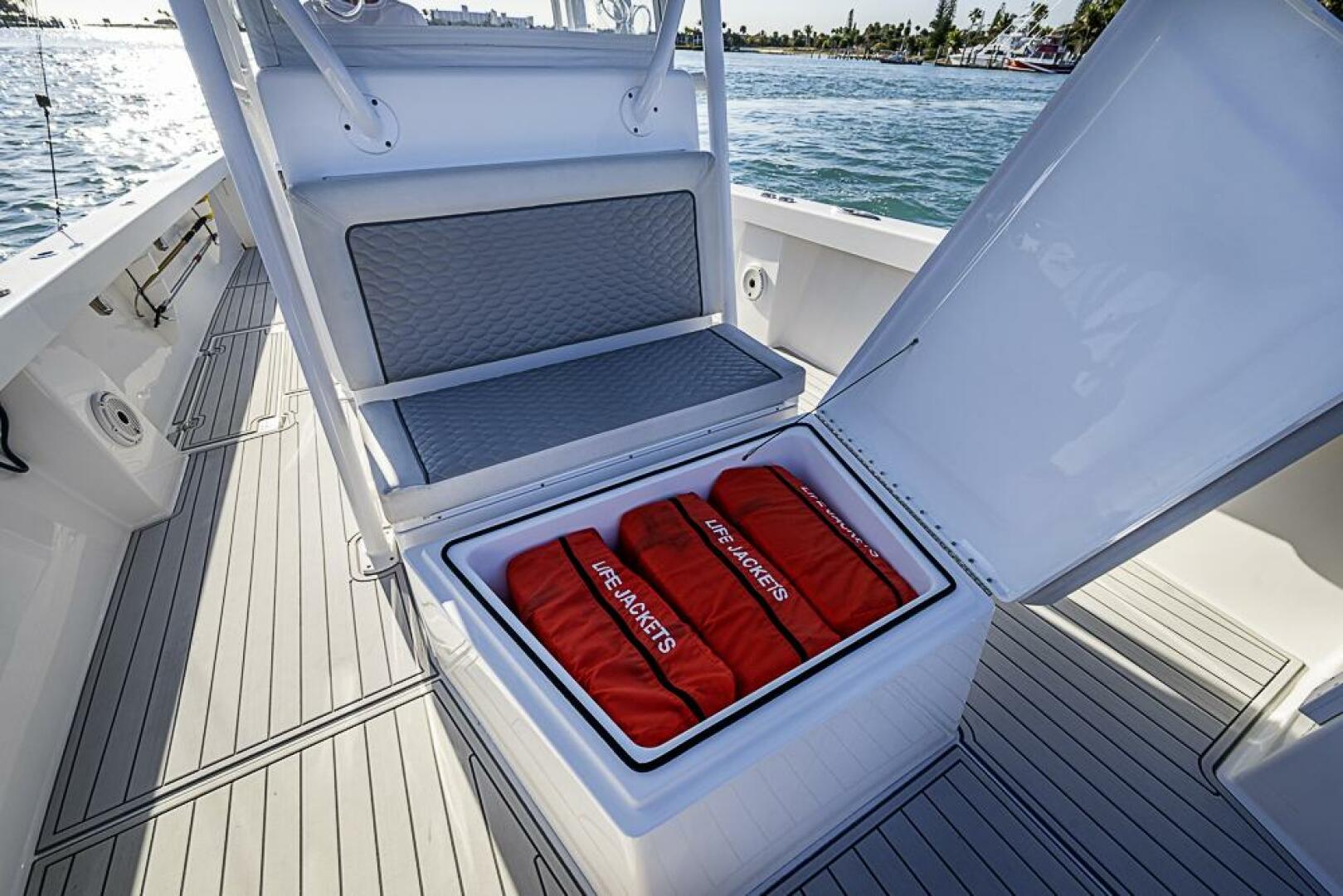 Her enormous volume provided room for 4 large storage compartments, 2 fish boxes, 2 built in coolers, a 55 gallon live well, plus room inside the console. You will be astounded how big she is for her size. Many of our Charter clients ride around with 14 people aboard, there’s plenty of room and seating for all. One of her greatest strengths is the ability to get on, and stay on plane, at just 2500 RPMs when it’s rough. That’s partially because the CG is low and in the middle. On a glassy calm day, top speeds in excess of 60 MPH will chew up the miles. Experience the ride that causes many to say “What wave?”, after they braced for a slam, for no reason.