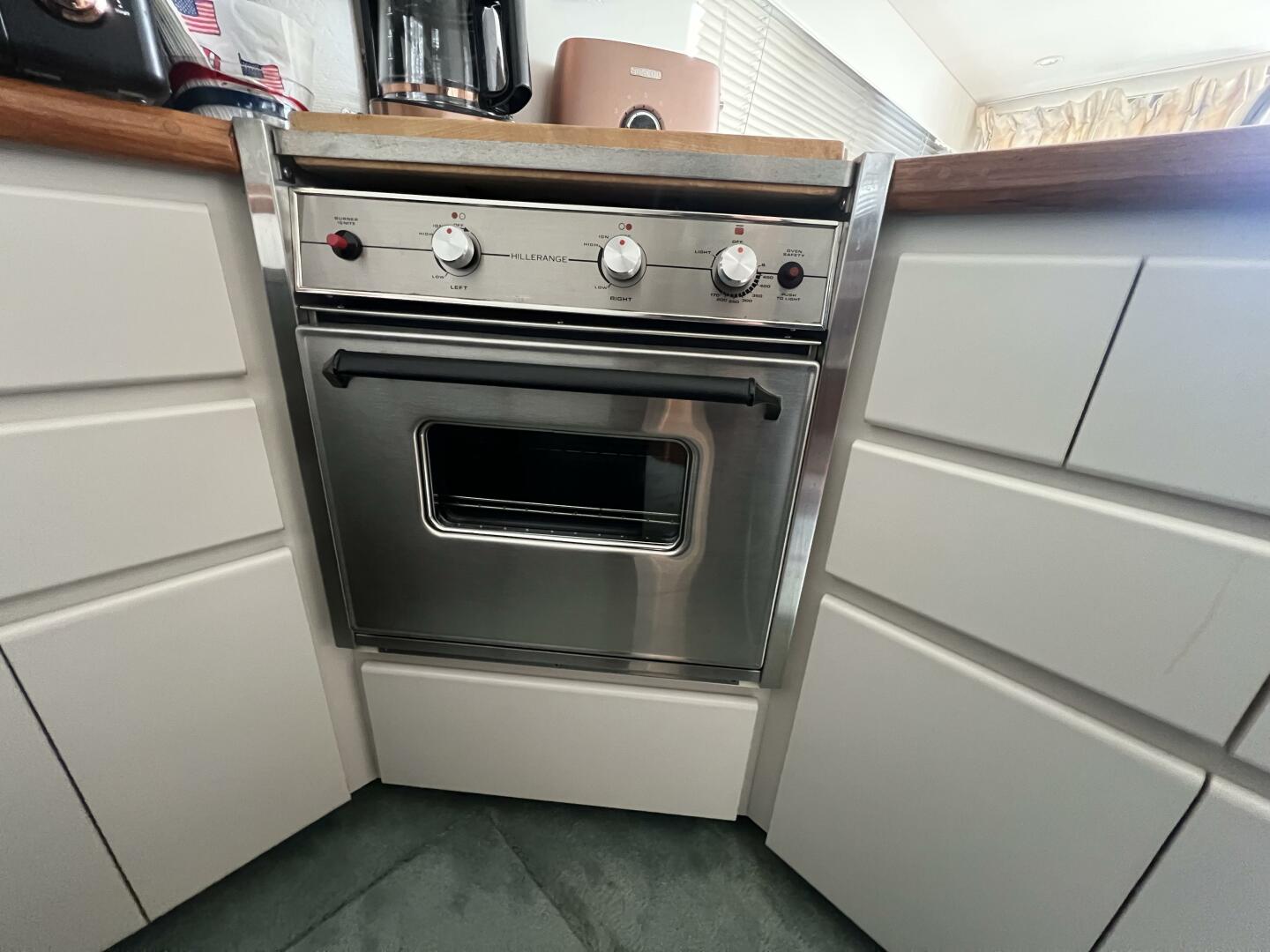 Inside, you’ll find a bright and inviting salon with large windows that flood the space with natural light. The open layout flows seamlessly into a fully equipped galley featuring generous counter space, abundant storage, and reliable appliances—perfect for weekend getaways or extended cruising.