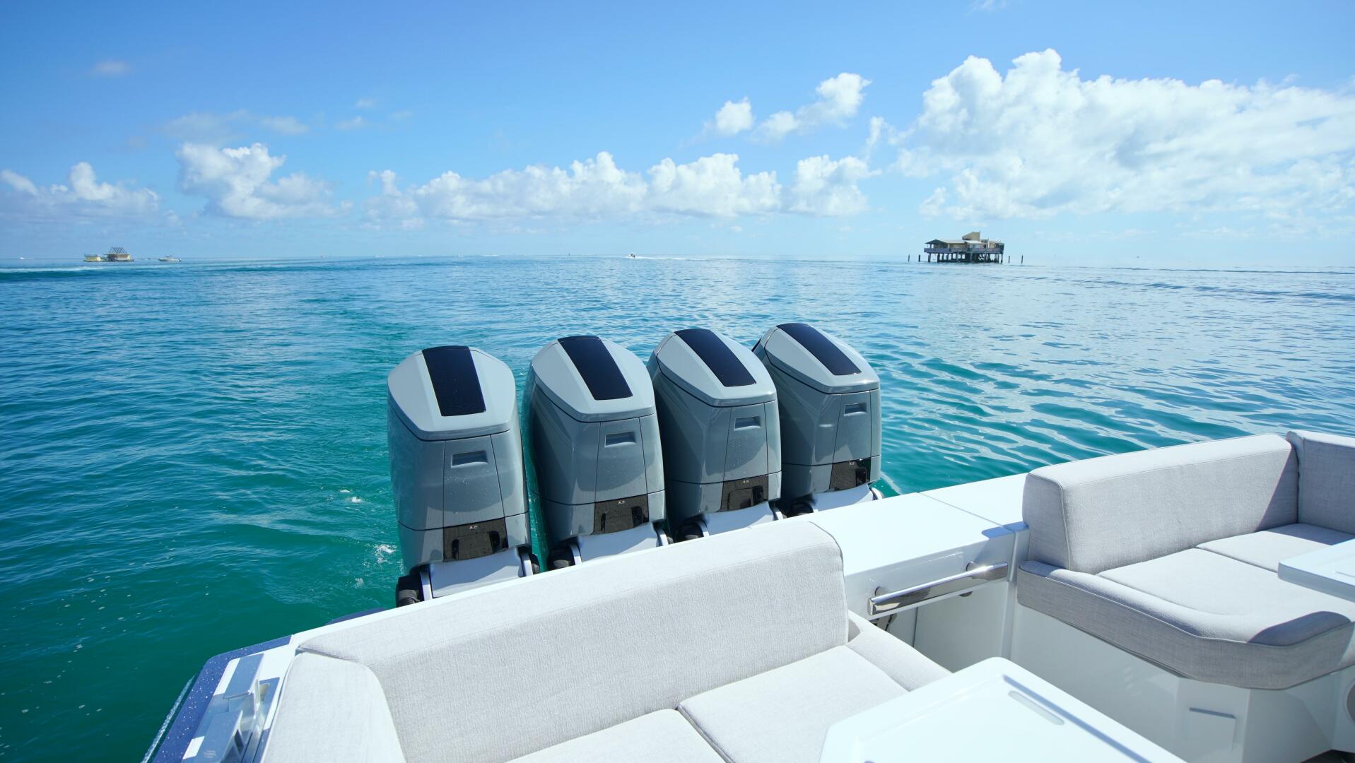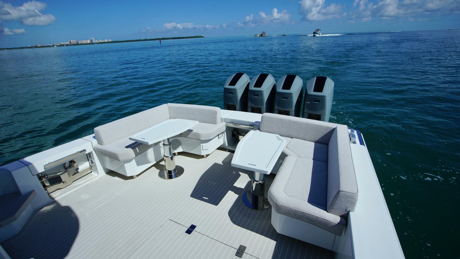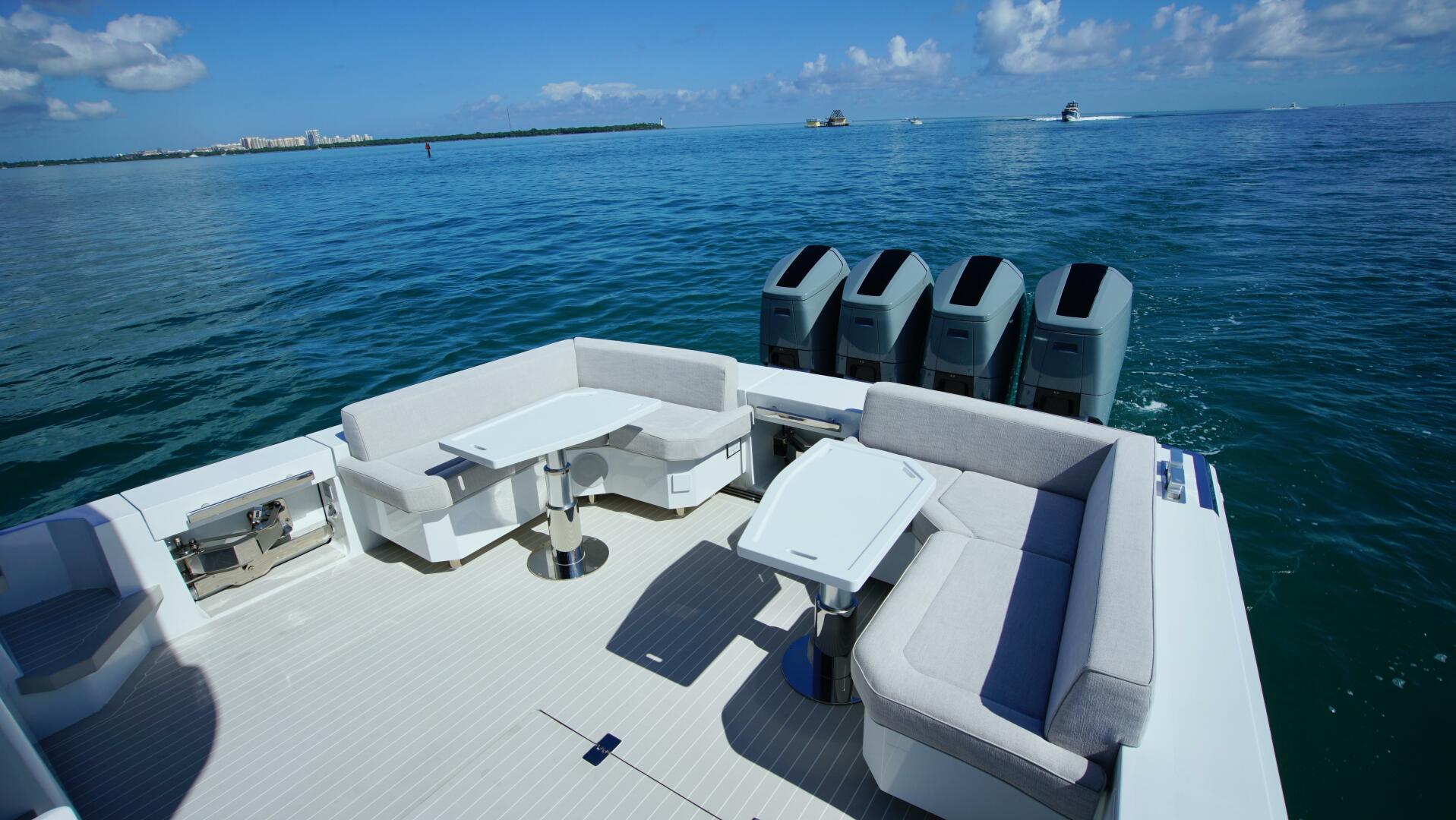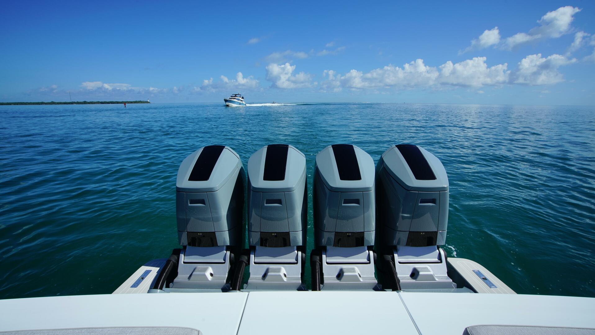 This vessel is in new condition, fully equipped, and ready for immediate delivery. Powered by quad Mercury 600 HP V12 Verado outboards with only 80 hours, she delivers breathtaking performance combined with remarkable efficiency and quiet operation.