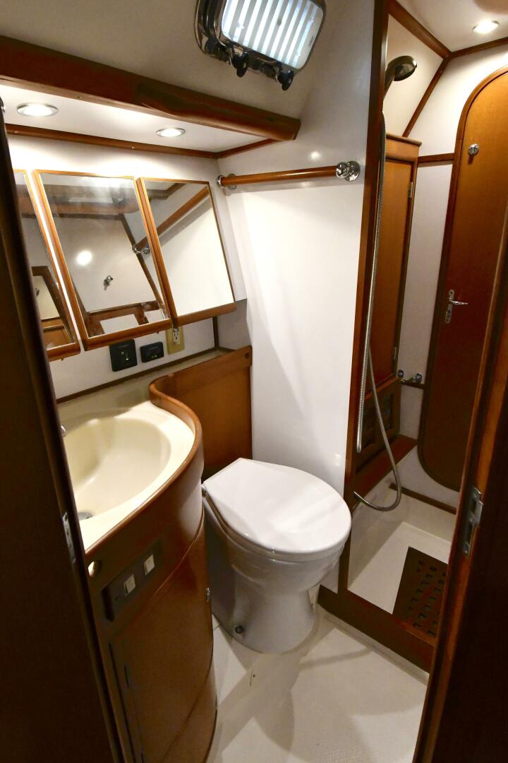 - Fresh-water toilet; dedicated 27-gallon holding tank with dual "Y" valve system (overboard / deck pumpout)