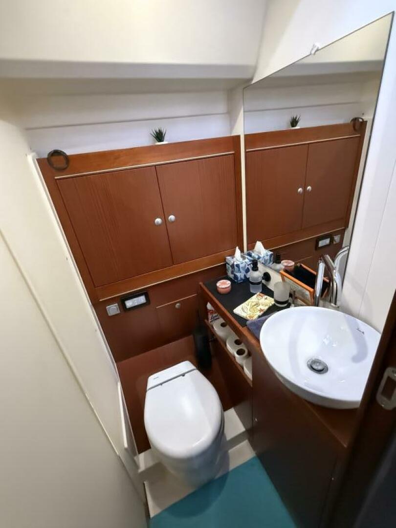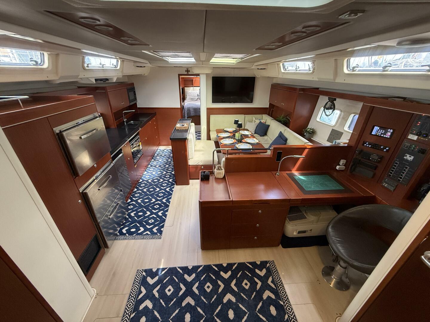 The saloon is bright and open with a convertible dining table that creates an additional double berth if needed. Opposite the galley and navigation station is a dedicated area housing washer/dryer, freezer, watermaker, and organized systems access , a rare and highly functional feature for extended offshore cruising.