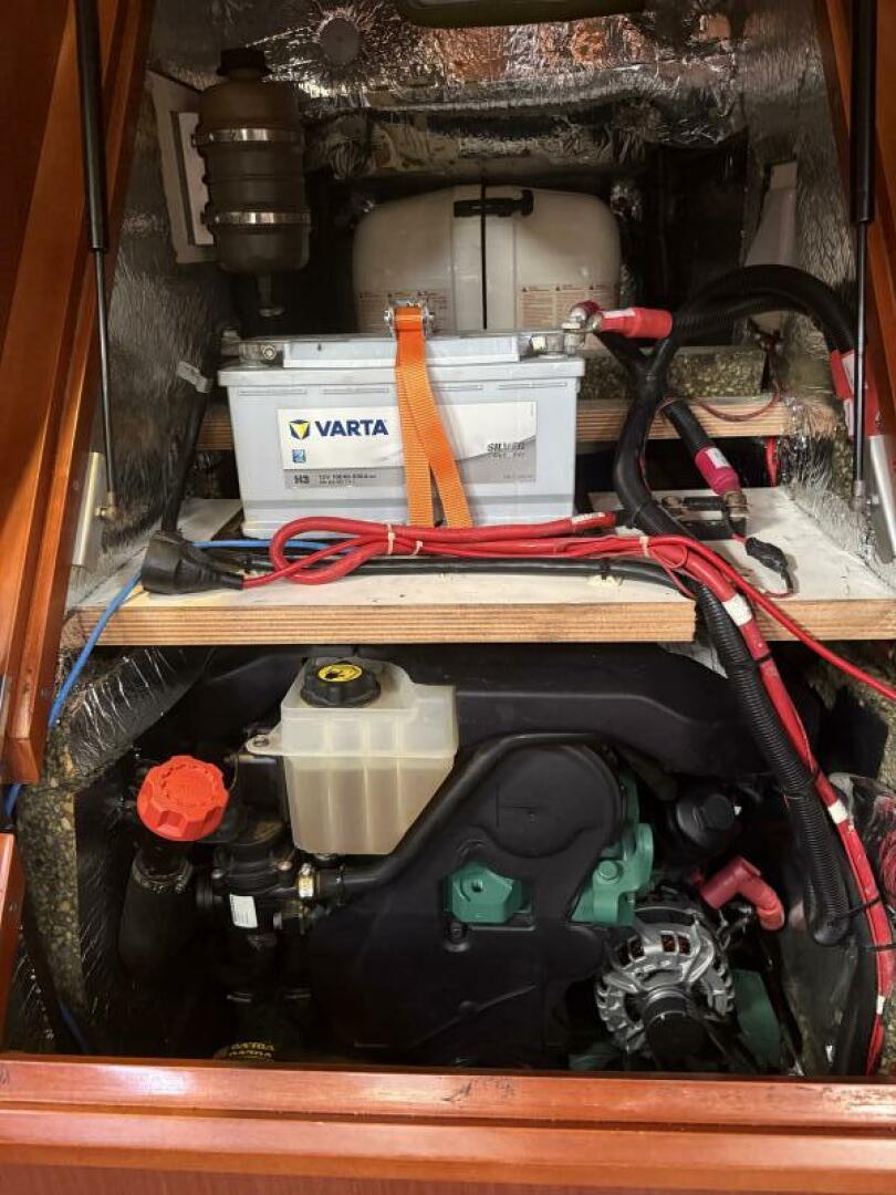 Powered by a Volvo Penta D3-150 diesel with approximately 1800 hours, direct drive to a 4-blade Flexofold propeller, she delivers efficient cruising at approximately 7.5 knots at 2,200 RPM and a maximum speed near 9 knots. Twin helms provide confident control, while electric in-mast furling, electric headsail furler, and cockpit-led running rigging to electric winches allow for easy short-handed sailing.