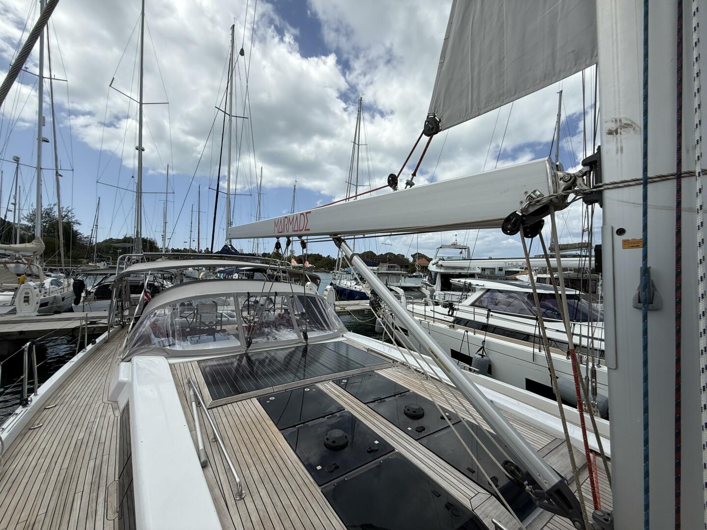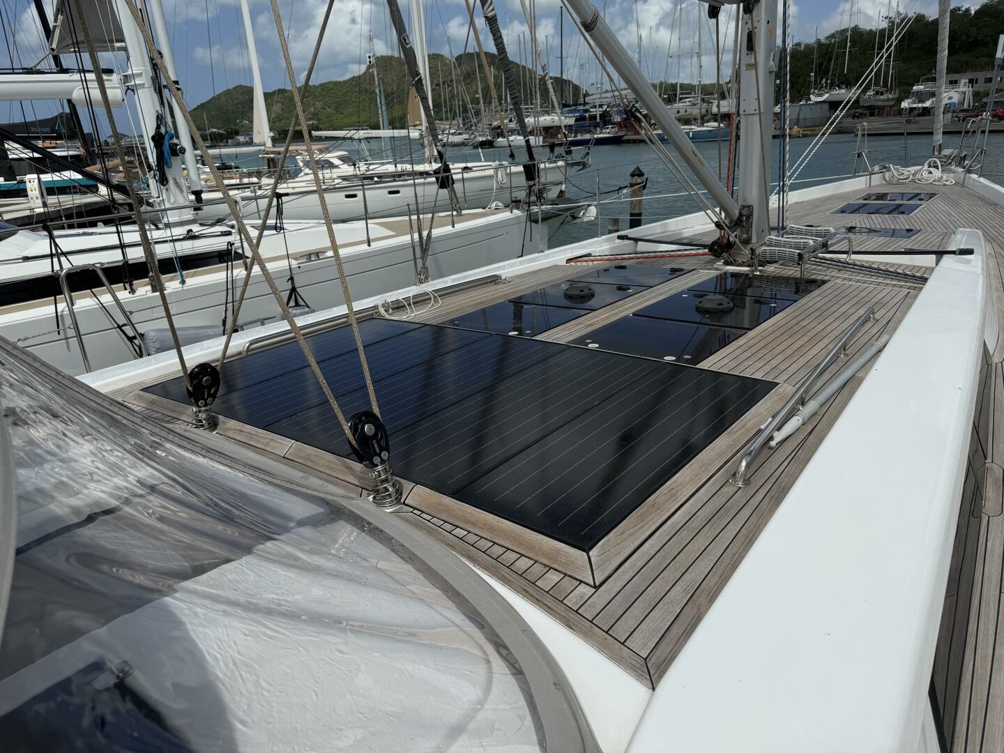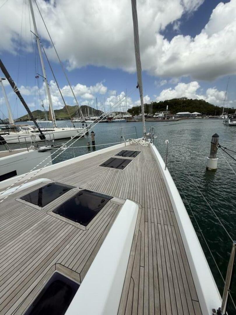 Fully equipped for effortless single or double-handed sailing, she offers exceptional comfort and practicality both underway and at anchor. Her high freeboard keeps the decks notably dry, even in sporty conditions. Designed to excel in warm climates, she features a large cockpit with ample shade and the ability to operate heavy appliances — including air conditioning — directly from battery power, supported by a generator with auto-start that quickly replenishes the 48V lithium bank when required. Generous solar capacity allows for continuous operation whether sailing or at anchor, with the generator primarily supplementing air conditioning, hot water, and watermaker use. Her teak decks remain in excellent condition, having required only a single light sanding over ten years, and are ready for the next decade. A single-blade rudder provides excellent low-speed maneuverability, while the deep keel delivers strong upwind performance and protects the rudder around docks, as it sits shallower than the keel. She also offers the best of both worlds with a secure dinghy garage for clean storage and davits on the stern arch for added convenience.