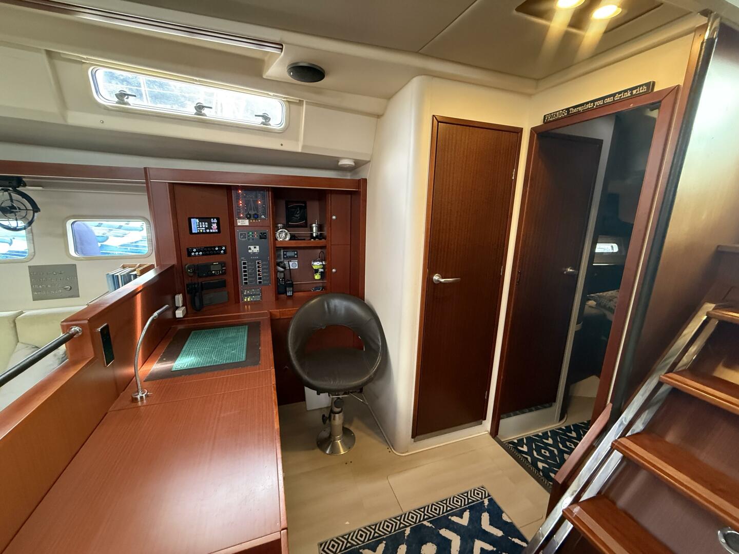 Below deck, the interior is exceptionally spacious and bright, highlighted by remarkable 6’8” headroom throughout, creating an open and airy feel rarely found even in yachts of this size. Her custom stainless steel solar arch supports approximately 1.4kW of solar, feeding a 48V 200Ah LiFePO4 battery bank managed through a Victron 5kW Multiplus-II system. This architecture supports appliances, air conditioning, watermaker operation, and onboard comfort with minimal generator use.