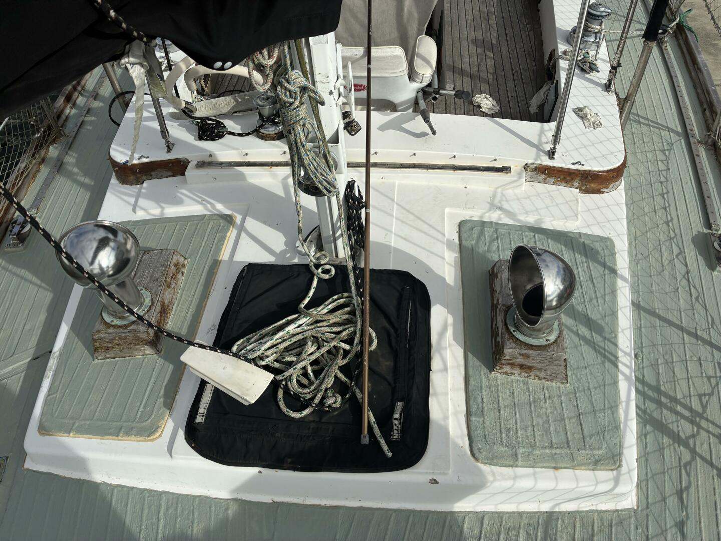 Moving forward along the deck, wide side decks and substantial handrails make it easy to move about the vessel. The large foredeck provides ample working space for sail handling and anchoring duties, reflecting the boat’s design as a capable offshore cruiser.