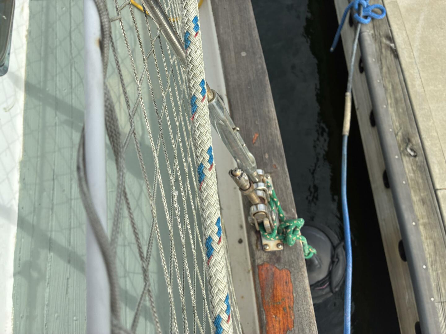 - Mizzen Mast: Aluminum Deck Stepped, Single Spreader, Painted (peeling)
