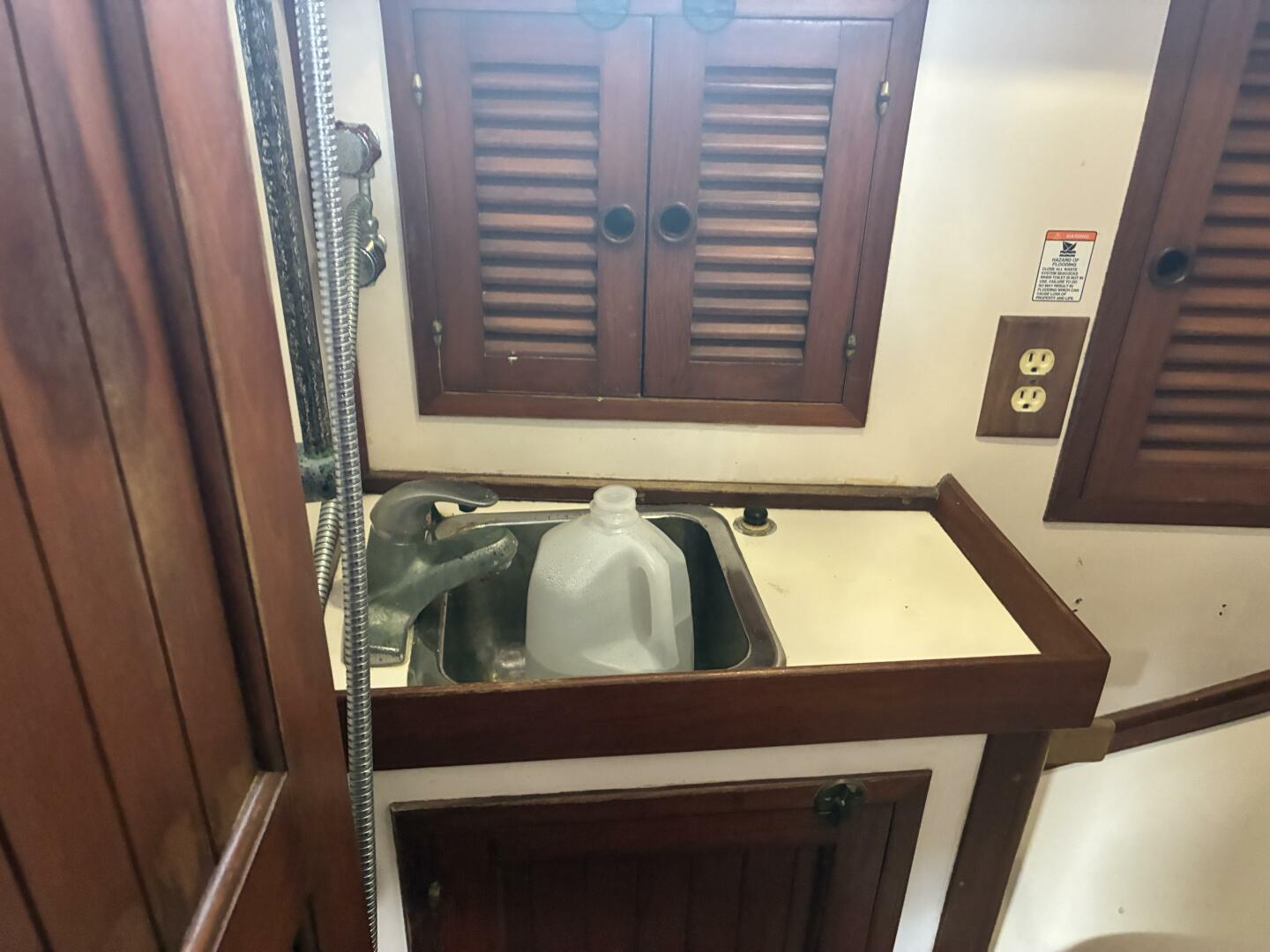 The galley is positioned near the companionway, providing convenient access to the cockpit while offering a functional space for meal preparation underway or at anchor. With ample cabinetry, counter space, and essential cooking equipment, the galley supports the needs of sailors planning extended time aboard.