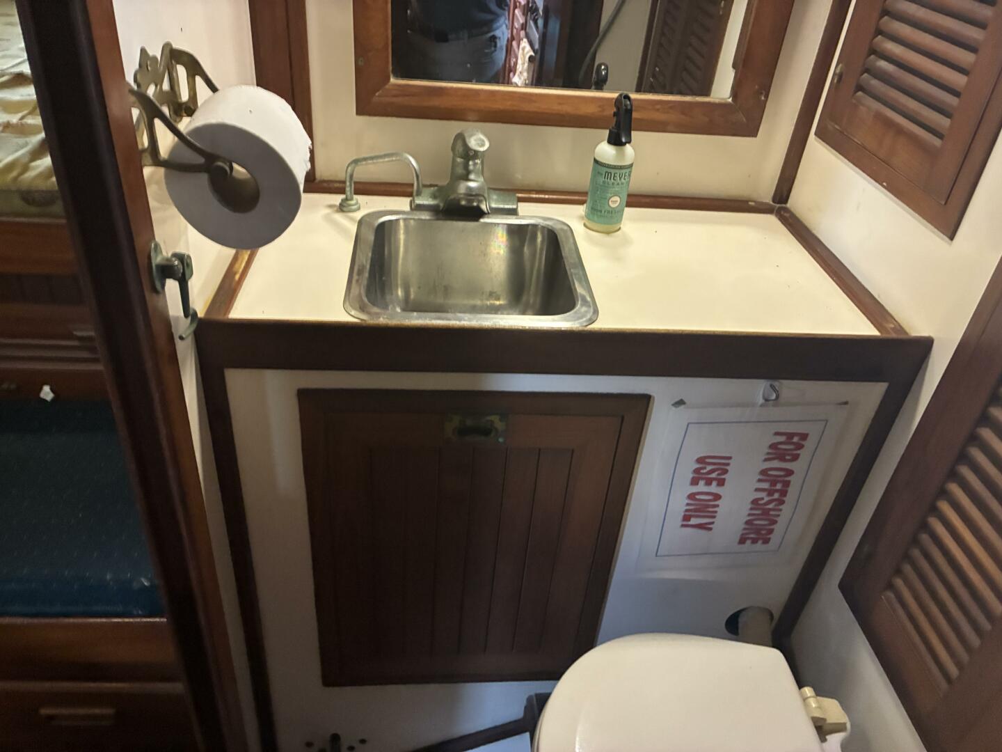 Forward, the guest cabins feature bunks in the forward cabin, and aft of the forward cabin, there is a single berth along with storage for gear and provisions. The nearby head compartment includes a marine toilet, sink, and shower area, providing practical onboard comfort.