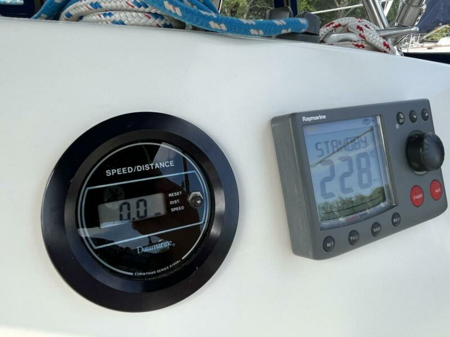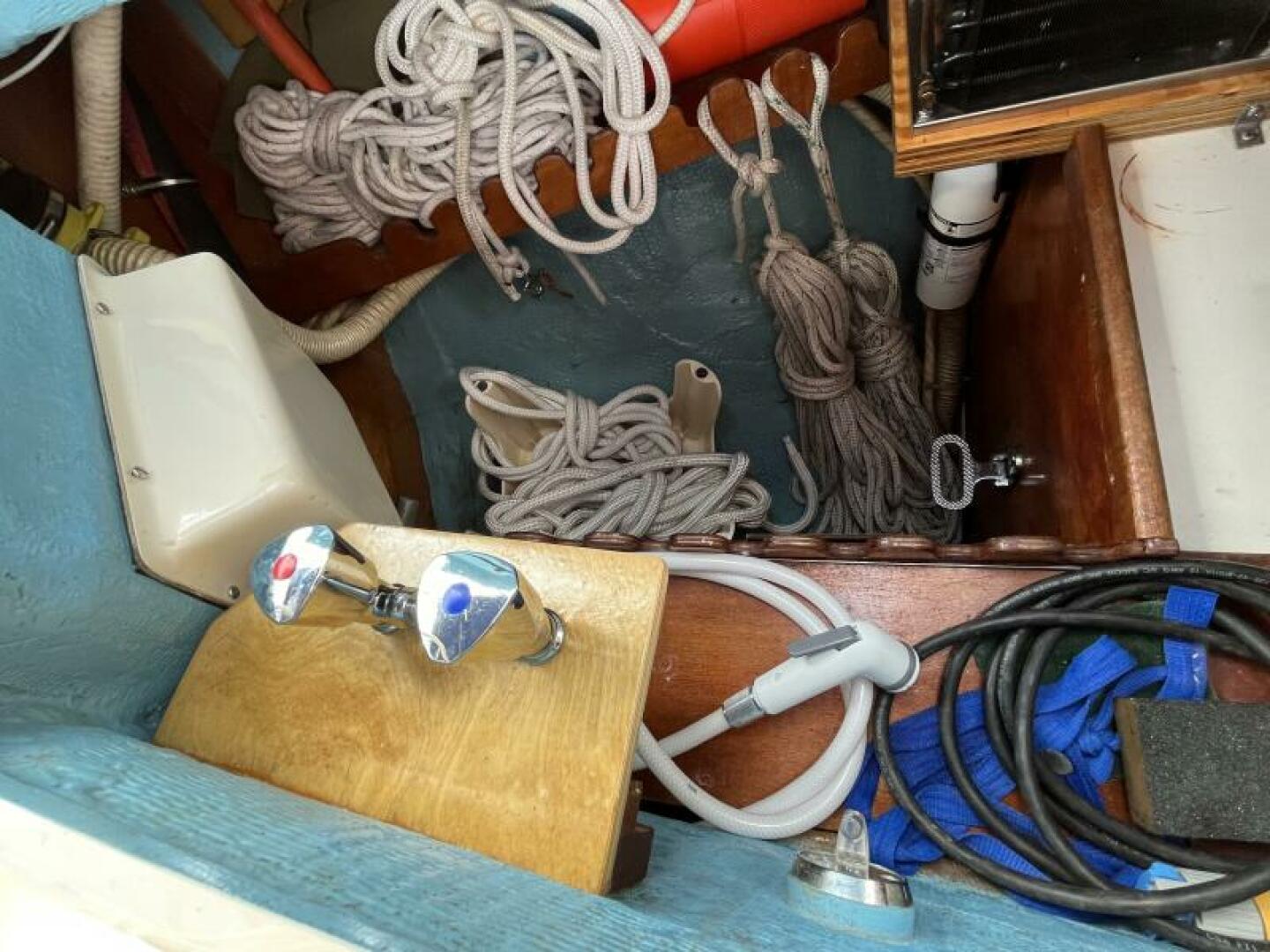 Belowdecks a U-shaped galley to port features a CNG oven/stove, double stainless sinks, and refrigeration. To starboard and aft is a double pilot-berth for guests or off-watch crew, and a navigation station with proper chart table, which contains ships manuals, logs, and even original sales brochures!