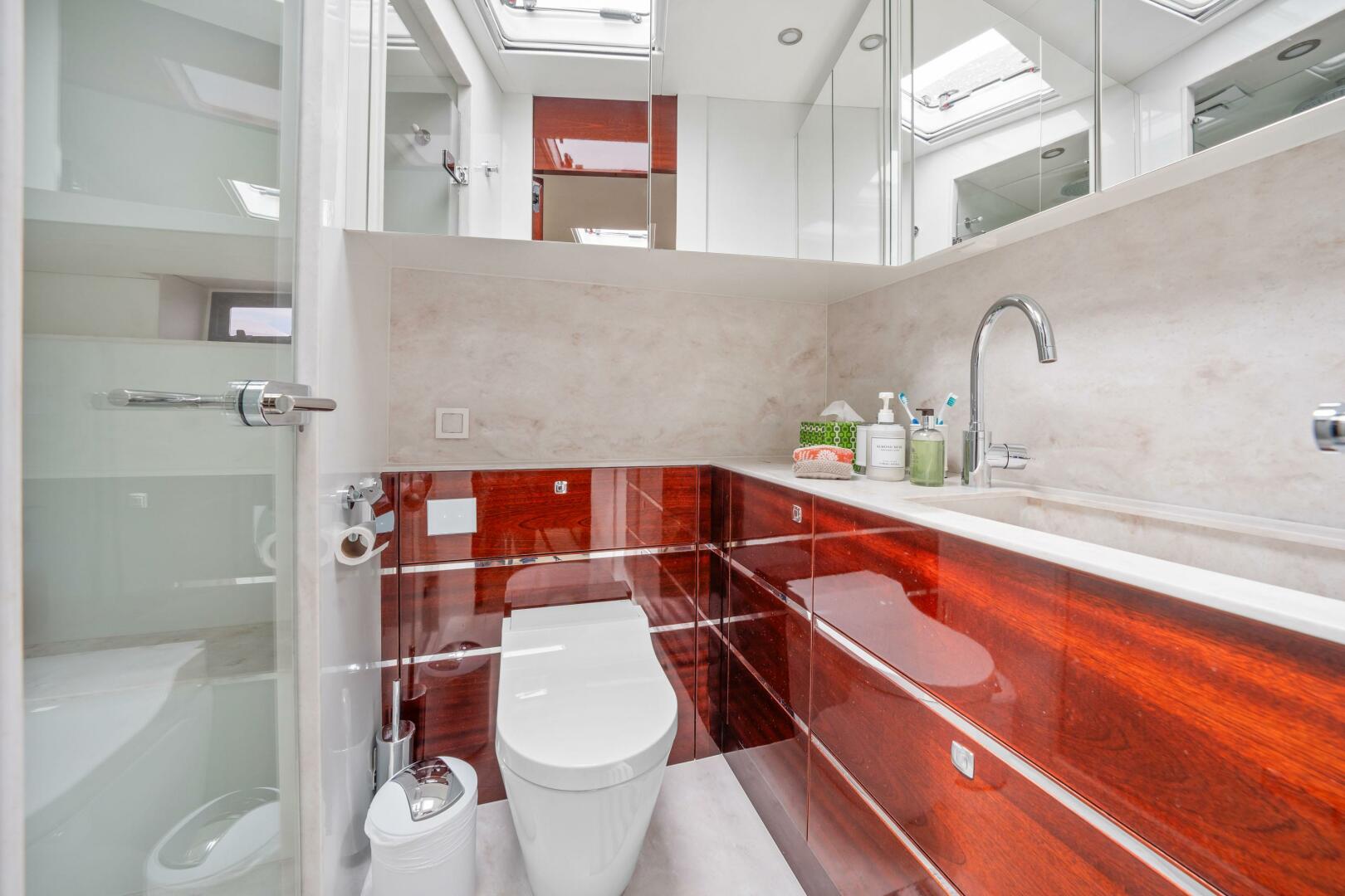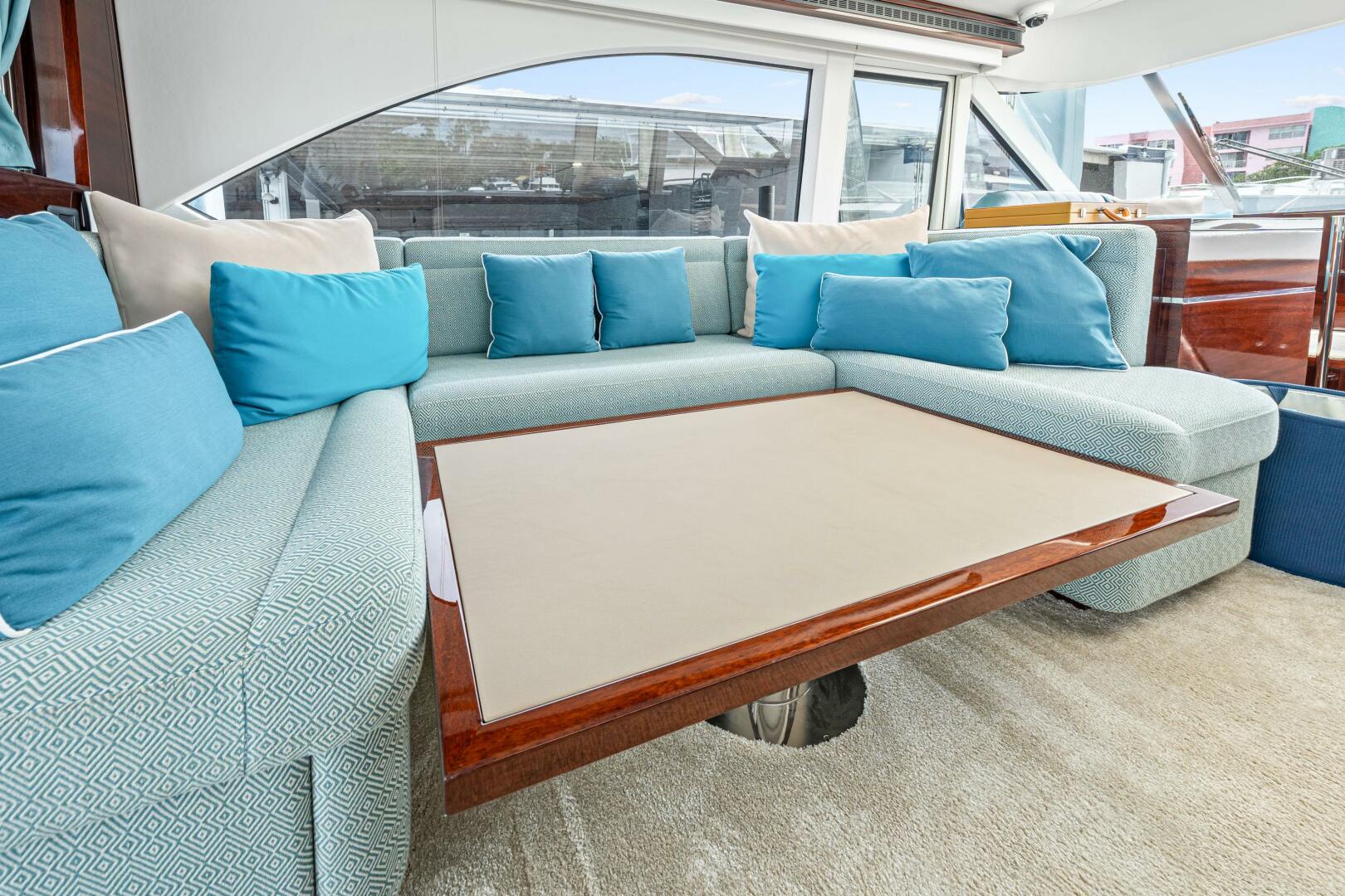 Inside, the yacht showcases warm, high-gloss mahogany finishes, bespoke detailing, and a bright, panoramic wheelhouse with electric sunroof and drop-down windows—blending open-air freedom with climate-controlled comfort at the push of a button.